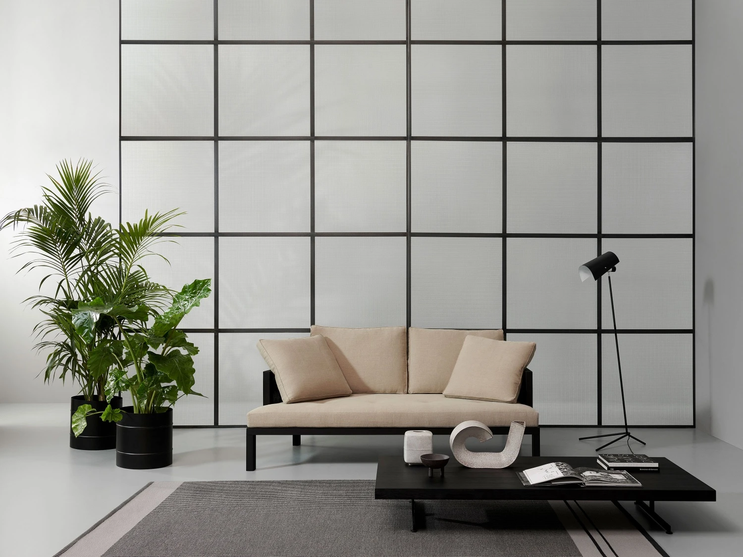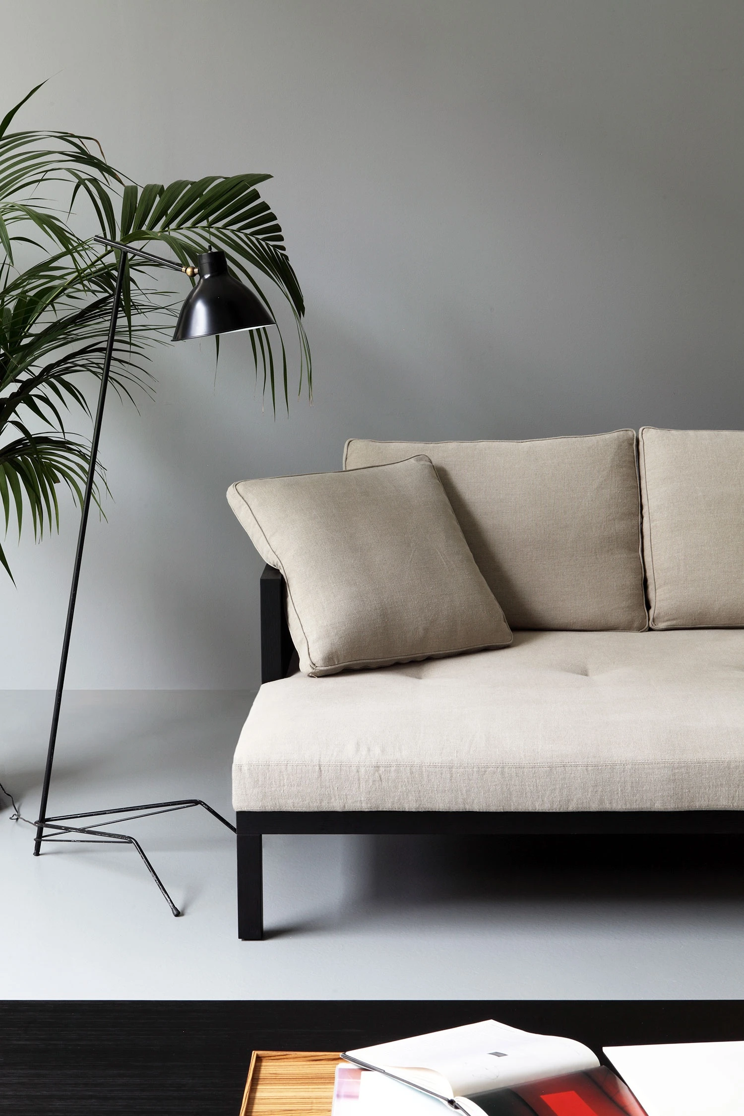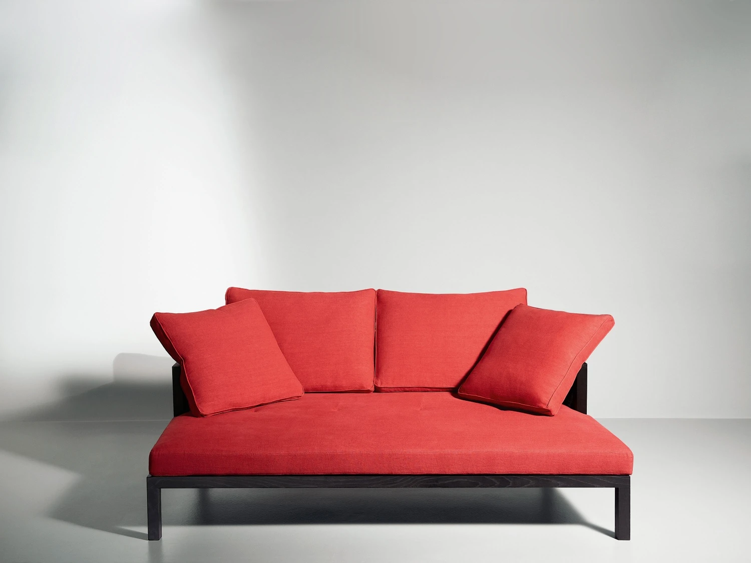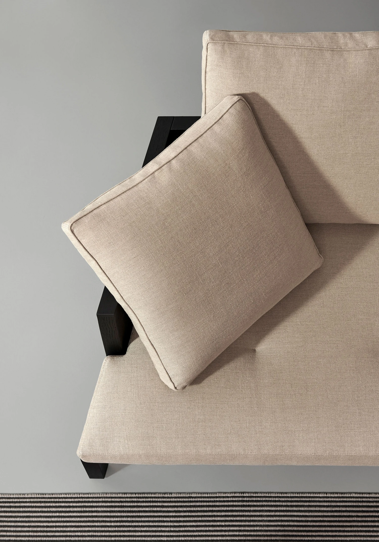 Curry by Piero Lissoni, available in sofa or daybad version, has a solid wood structure and intentionally exaggerated proportions. Its pleasantly distorted shape creates an asymmetrical seat that paves the way to new forms of relaxation. Curry has a sculptural silhouette with a strong graphic impact and features a precious design on the back and on the armrests made of black stained solid ash and woven straw stretched on the structure. It is an industrial piece of furniture with an artisan flavor that gives voice to the various creative languages of our time. The sofa is completed by a seat cushion with sown stitching and made of shaped polyurethane foam with variable density for greater comfort. The back is softened by two pairs of goose down cushions. The cover, available in fabric, leather, Nabuk or eco-leather, is fully removable, and finished with visible seams.