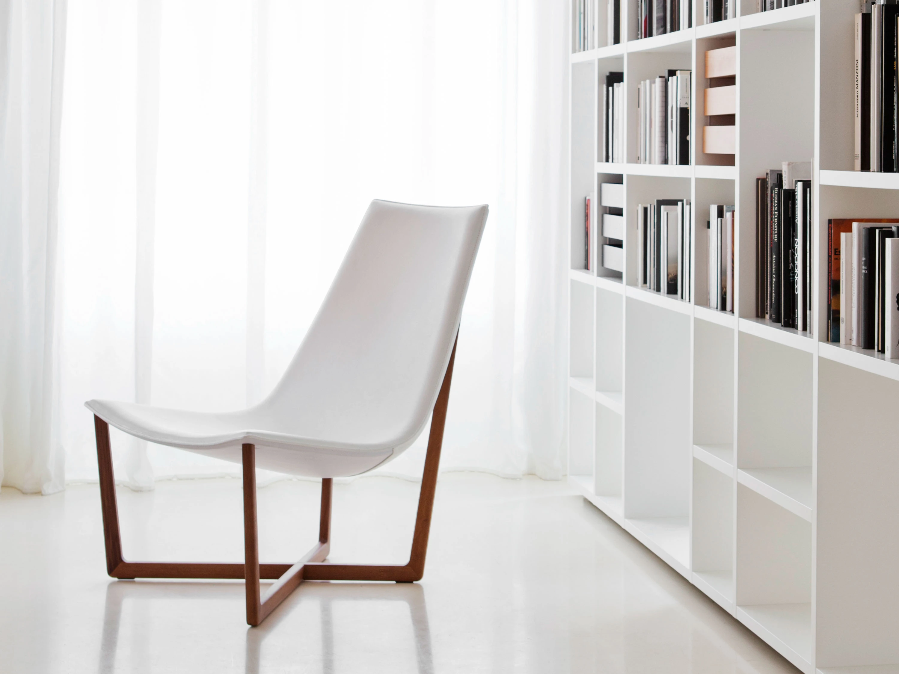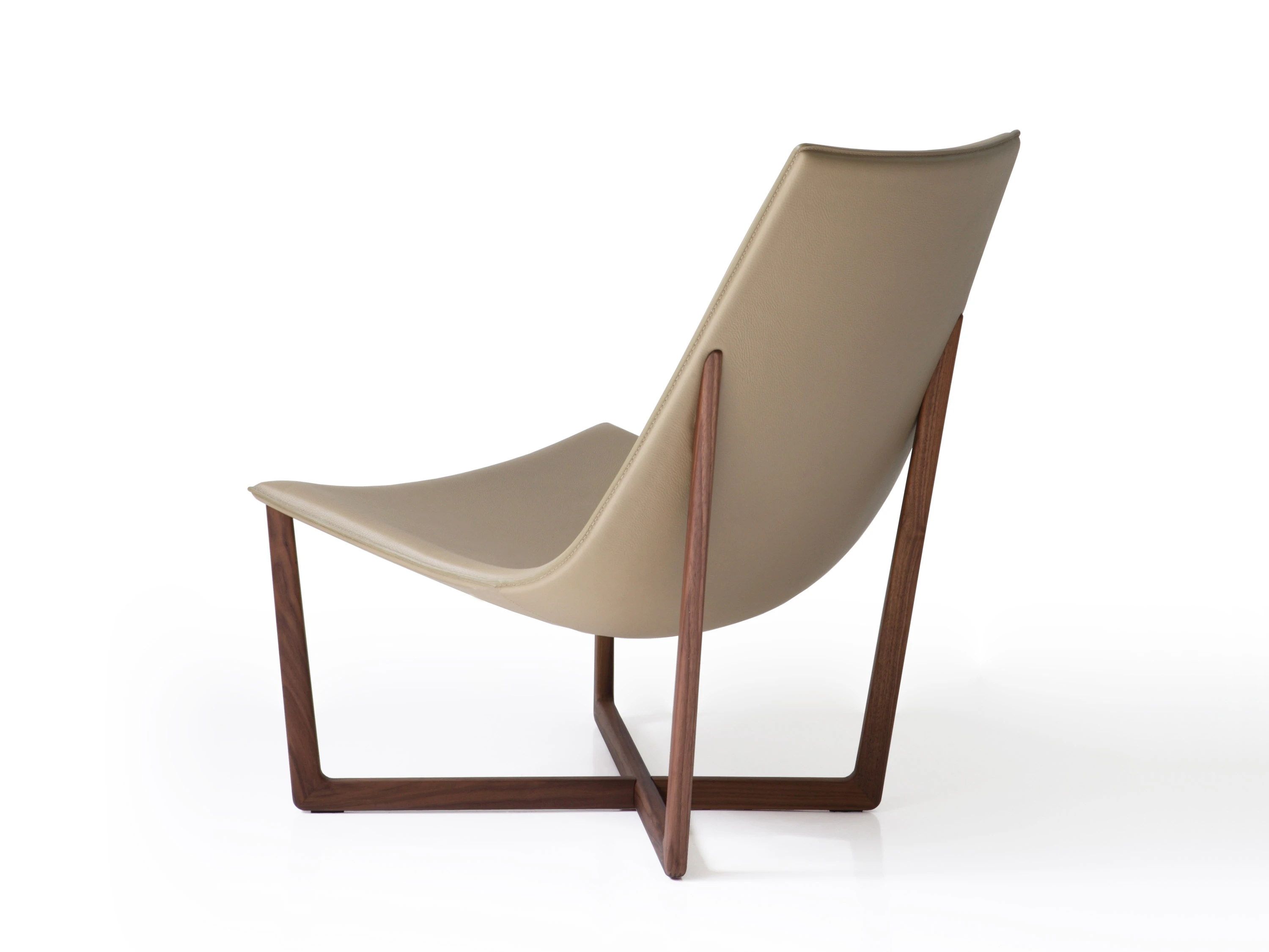 The lounge chair Jade stands out for its harmonic lines and its relaxed shape. Available with a seat in leather, eco-leather or Nabuk, it seems to be suspended on a solid black-stained ash or canaletto walnut structure, with a cross base units, leaning on 4 points.