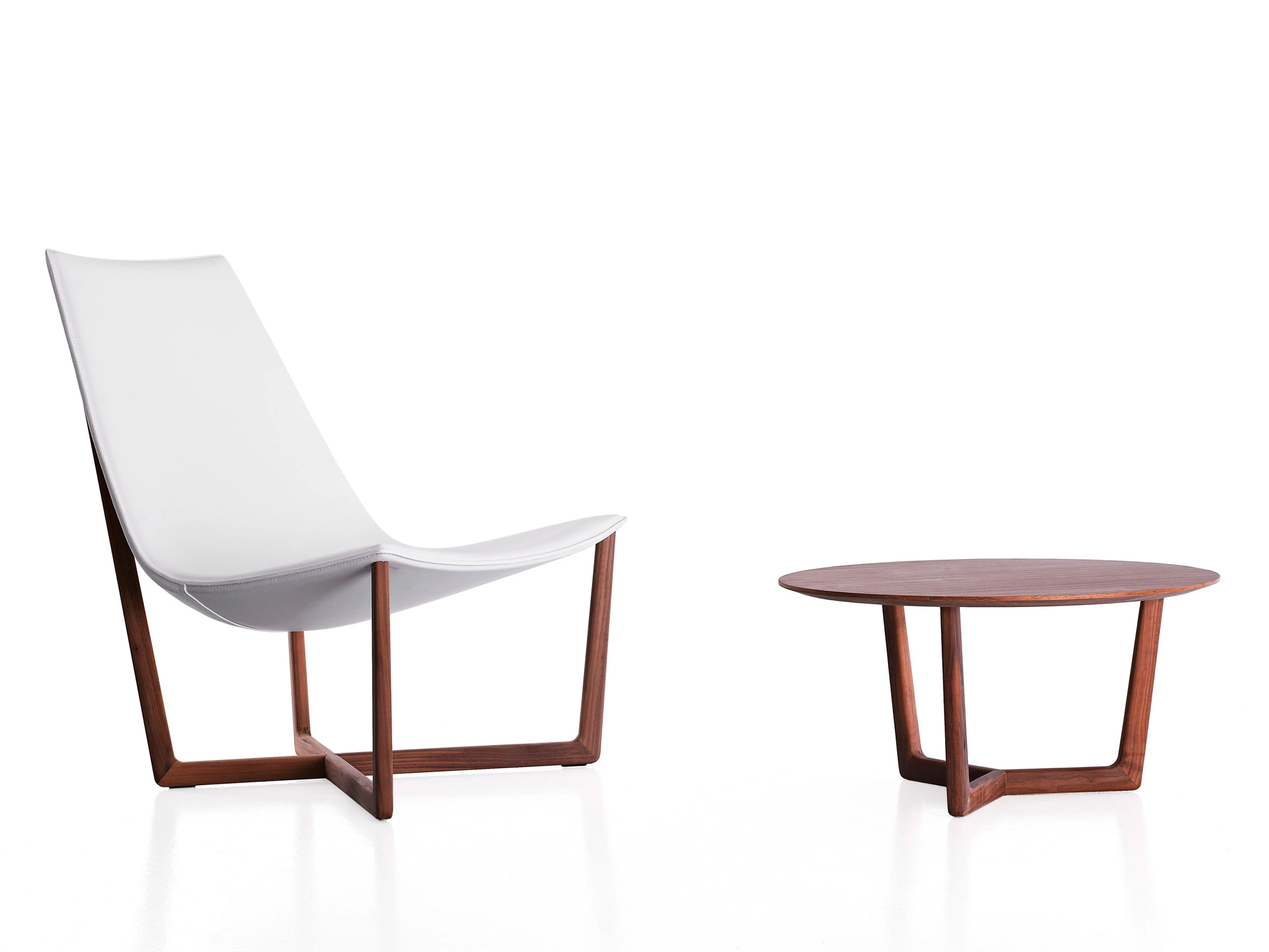 The Sharan table, ideal complement to the Jade armchair, recalls it in its finishes and crossed solid wood supporting structure, with, however, a circular top.
