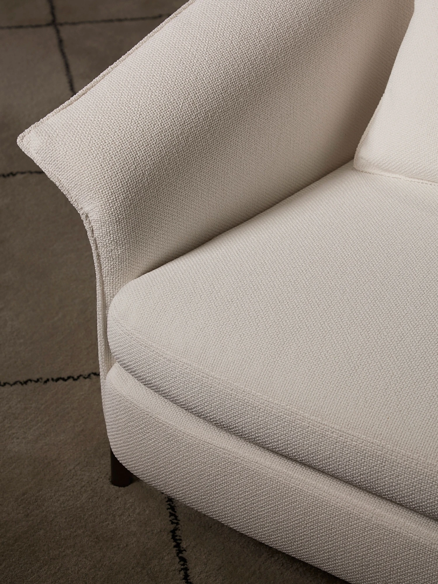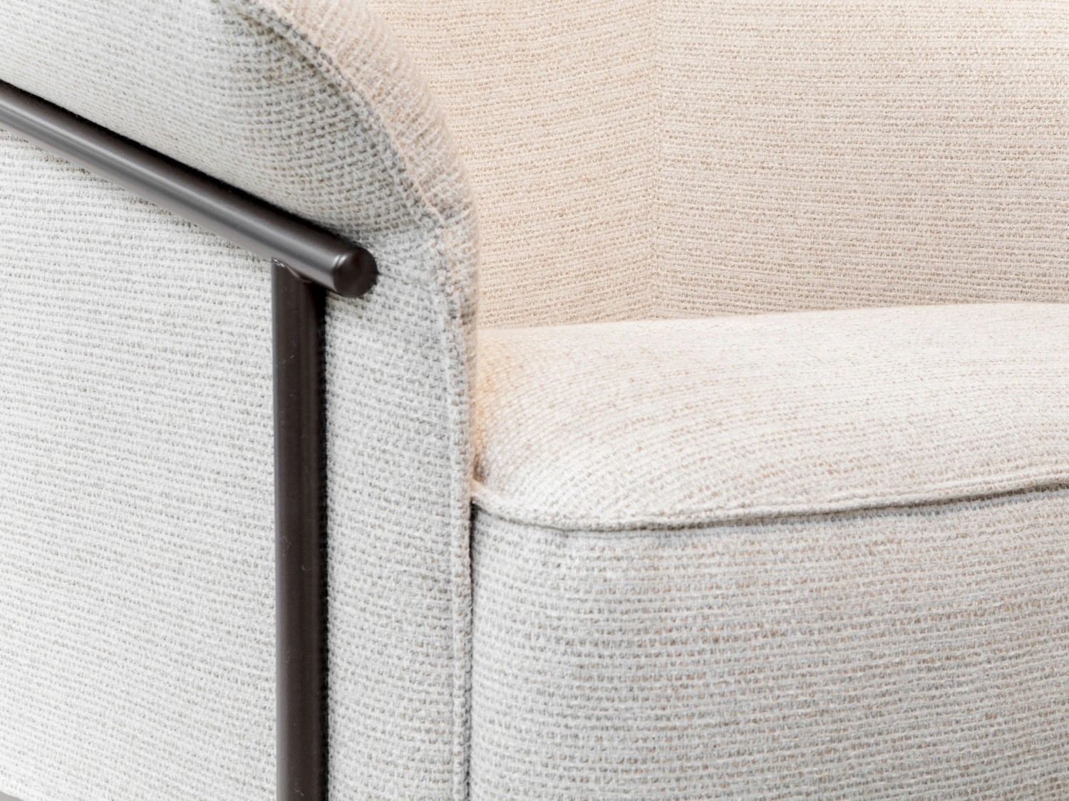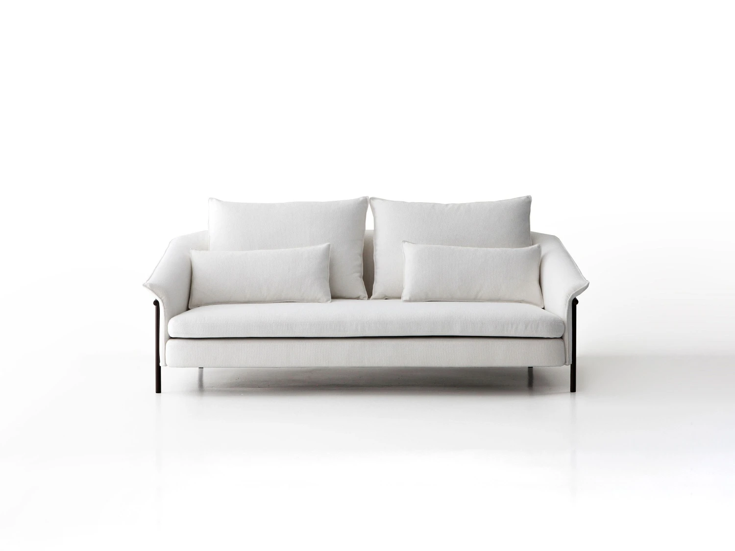 Kite Sofa by GamFratesi fits perfectly into the living space with its plastic fan shape. Kite Sofa has a wide and compact volume and reveals its refined details to a careful eye: calibrated thicknesses, accurate proportions and the elegant curve of the tubular structure that embraces the internal padding, to get the effect of an haute couture coat with a raised lapel. All this makes it a contemporary design piece that does not renounce artisan finishes and vintage hints, for a home suspended in time and style. Kite Sofa is composed of a frame in a black or brown ombra stained metal rod, an enveloping backrest with flexible armrests and a seat cushion. The sofa is completed by resting goose down cushions. Available in two widths, 2000 and 2400, it ensures great comfort and a compact size.