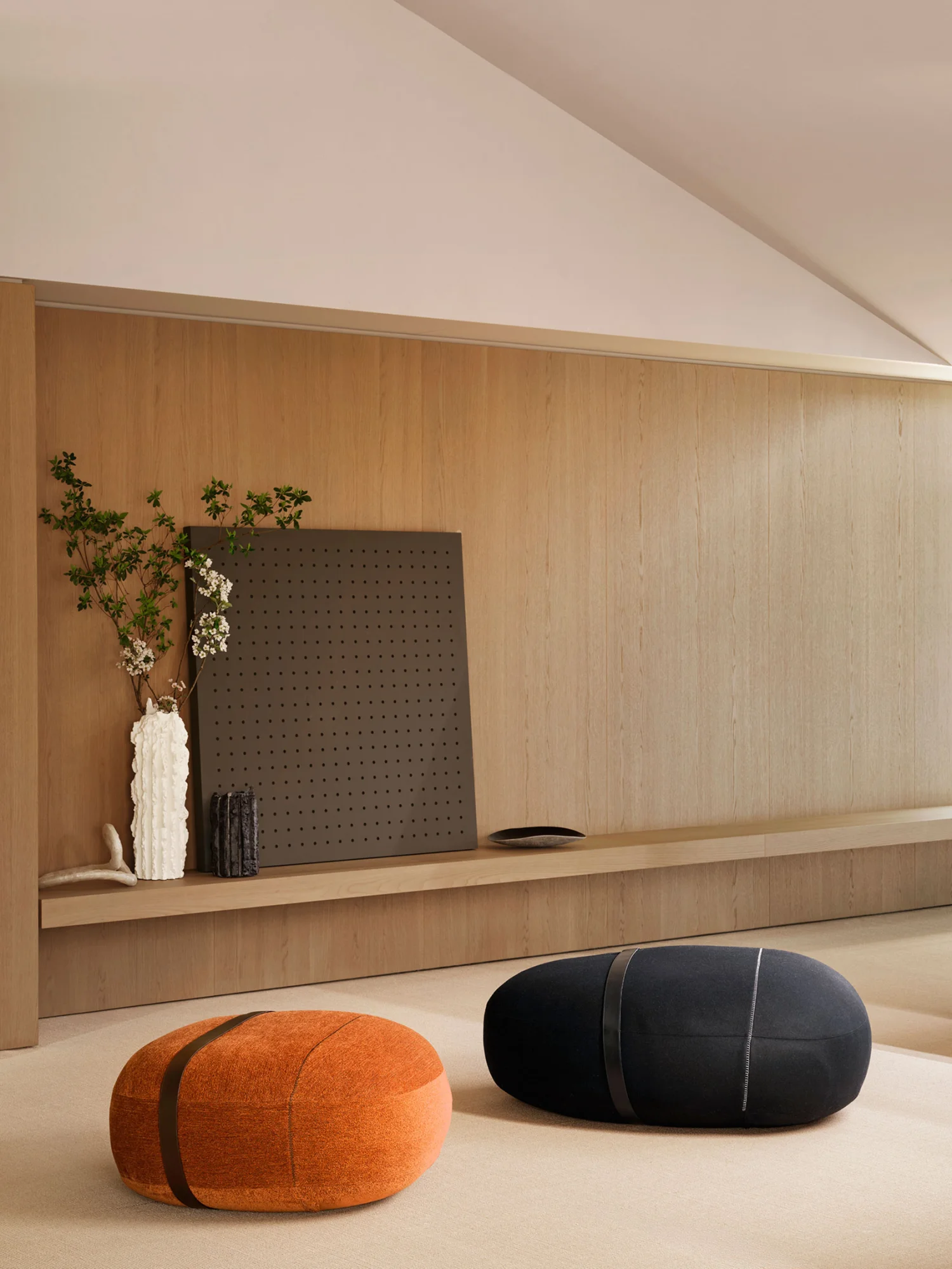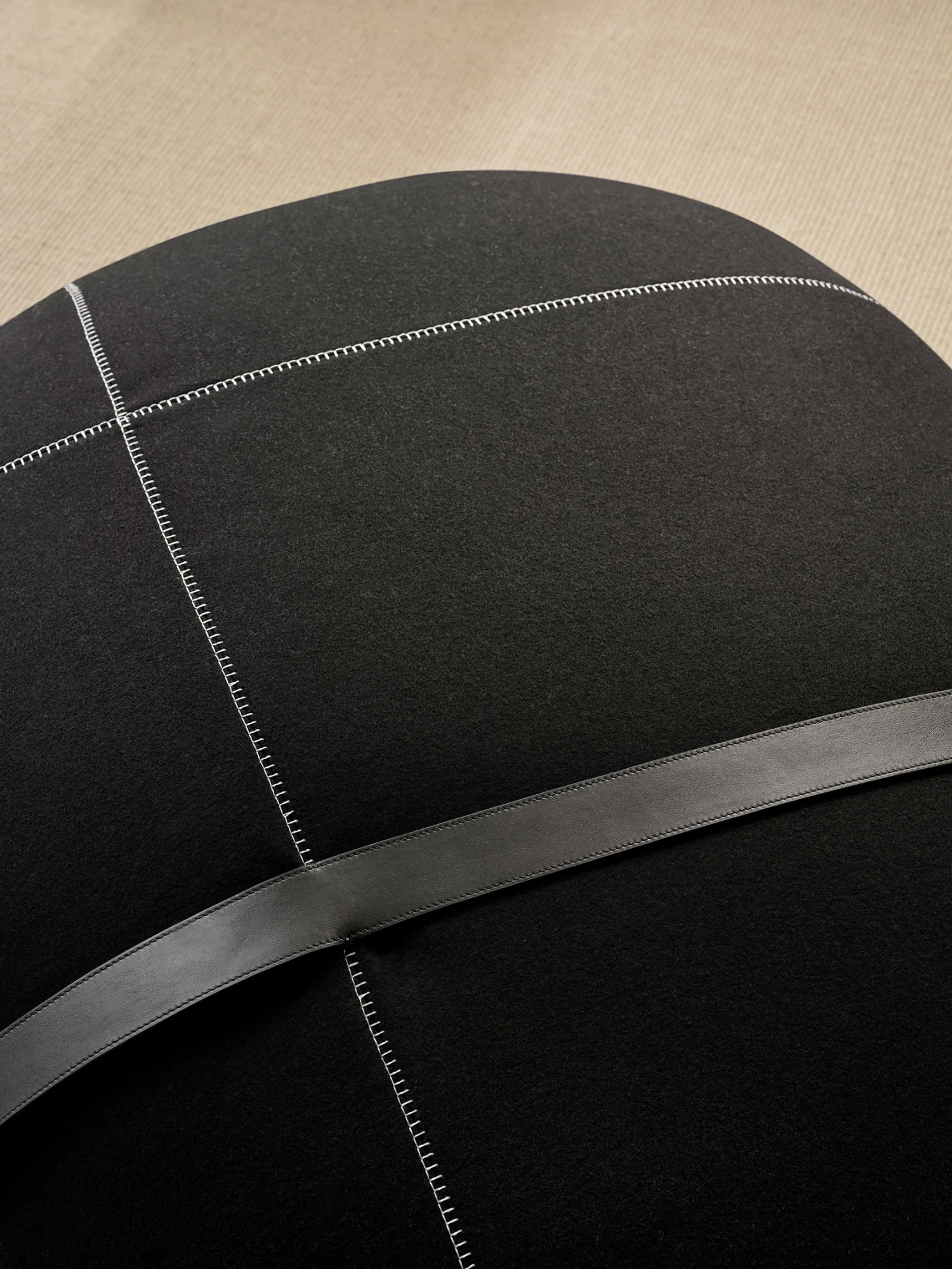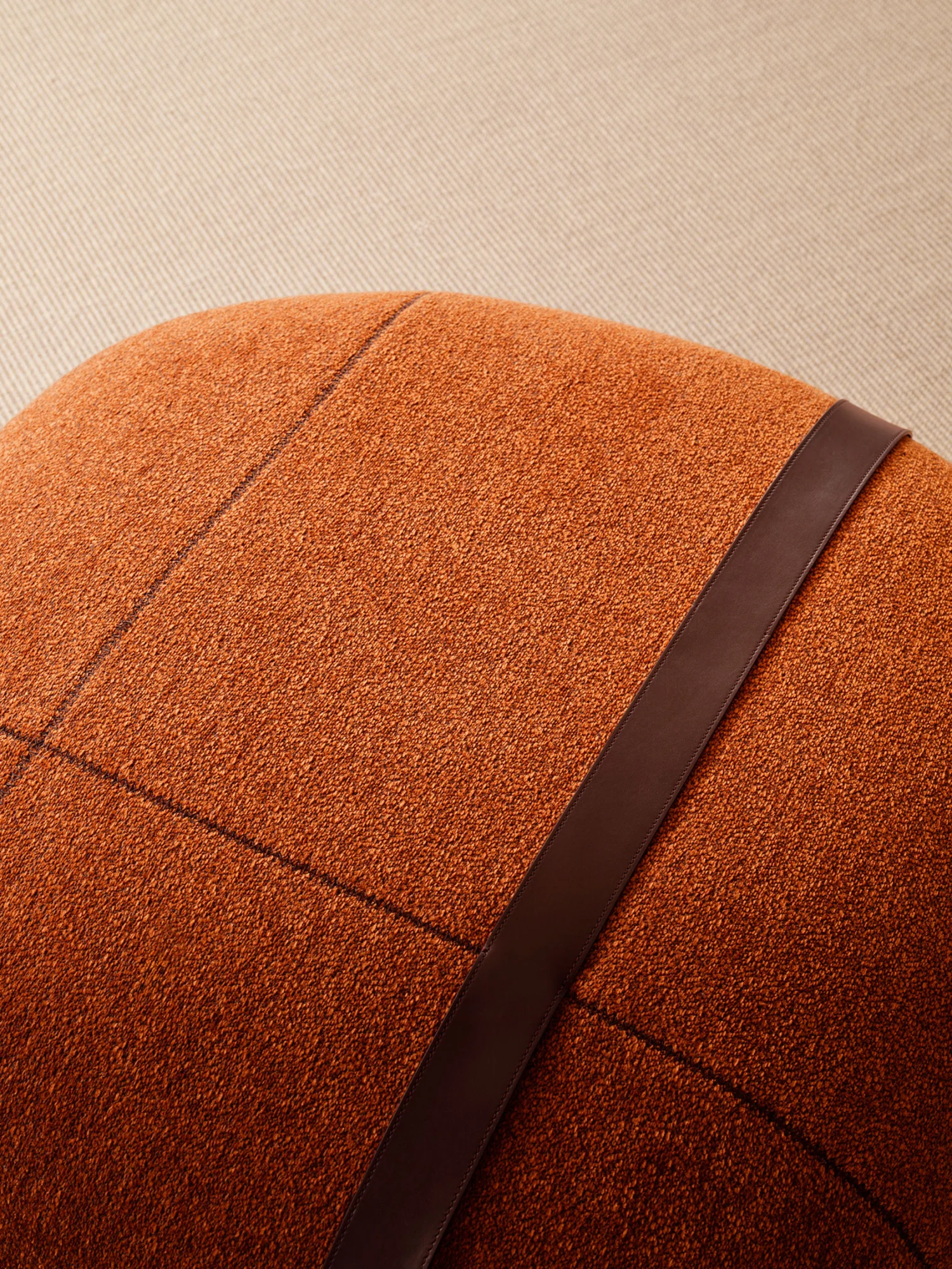 Purity meets precision in the new Prie poufs, drawing tangible inspiration from the rounded forms of the mineral world. A material-rich piece with a visually and tactilely soft appeal, available in three sizes – small, medium, and large – designed to be effortlessly arranged in both residential and contract settings. The simple yet refined aesthetic enhances the textile sophistication, featuring contrast stitching and a thicker strap that serves as a handle for easy movement, creating a dynamic layering effect.