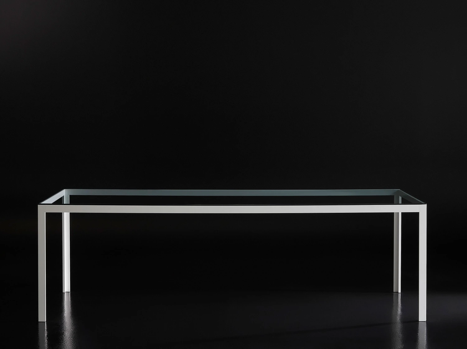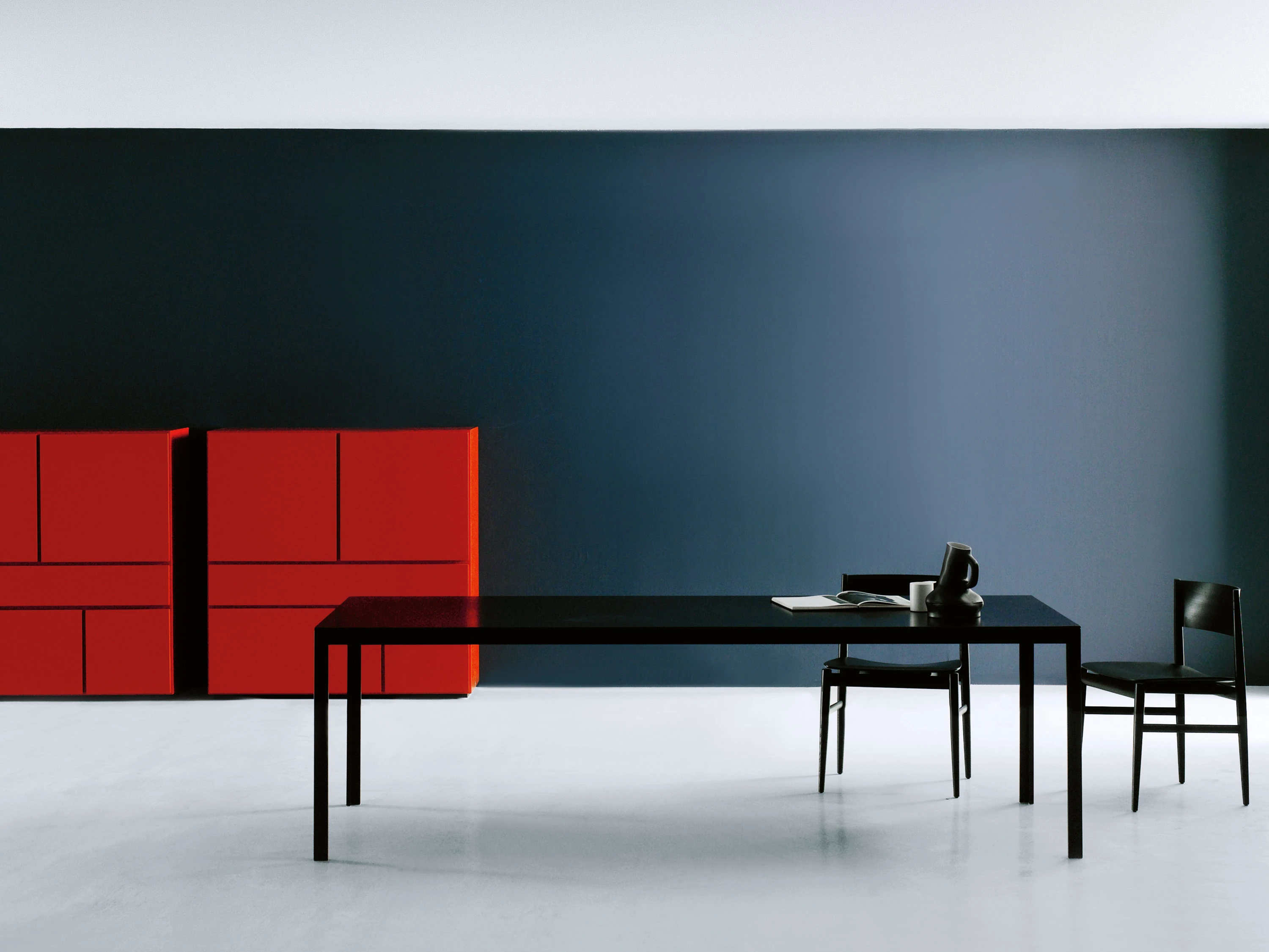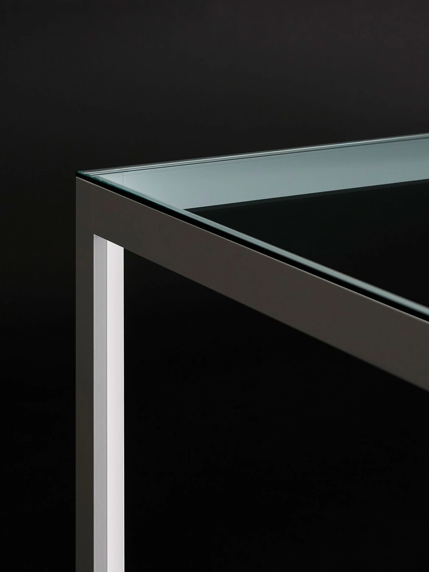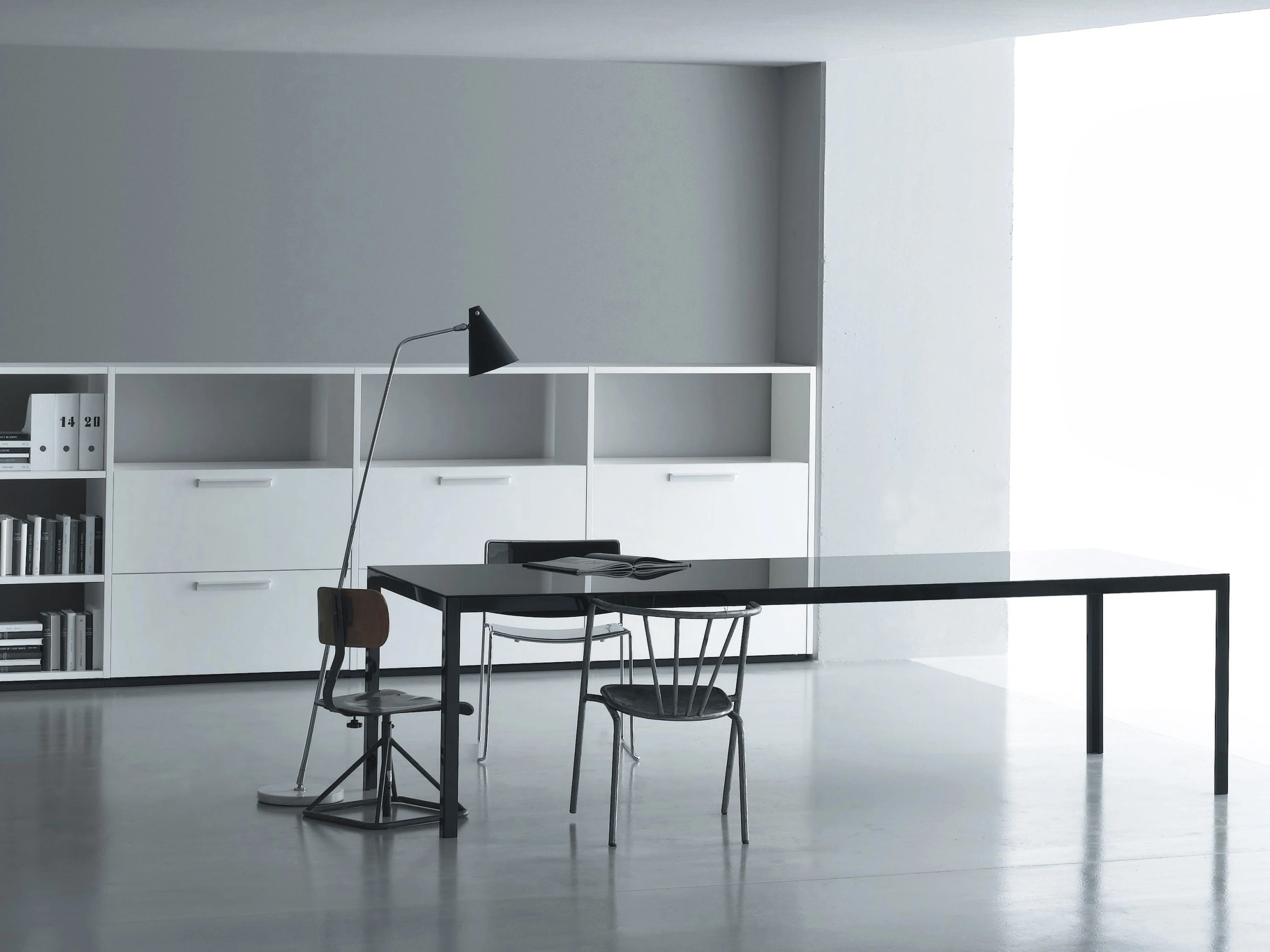 Fractal is a system of tables in several dimensions and finishes; it is a product highly versatile and capable of fitting perfectly home and office. Its essential structure with L-shaped reduced section legs black and white lacquered aluminium, can match tops of various materials, from transparent, etched or back-painted glass to lacquer or in the Porro woods, up to Corian® and HDS. For the working use, Fractal is completed by office equipment such as hanging drawer units, computer holder, vertical courtesy panel, column for cable passage inside the section of the leg and top access.