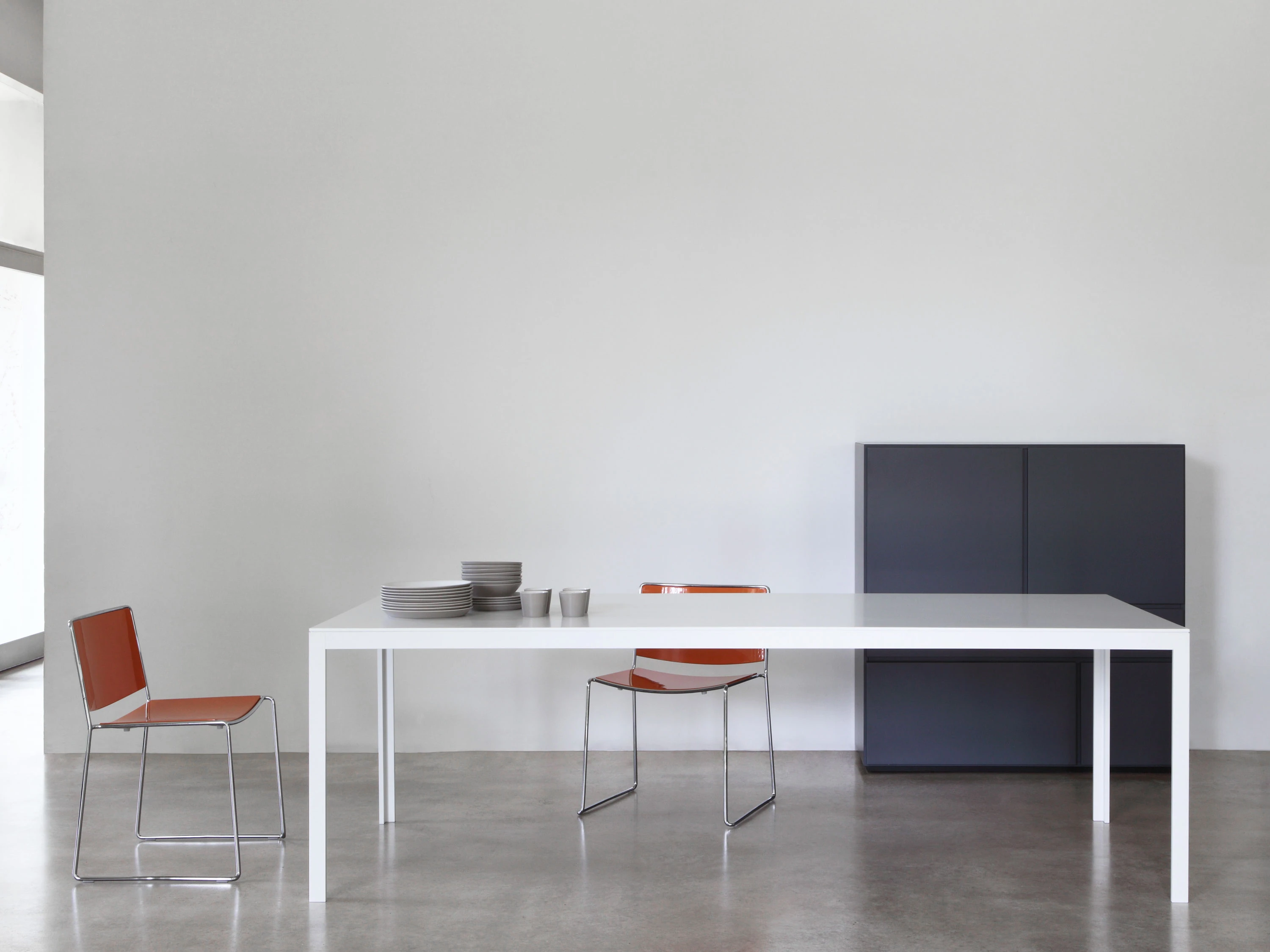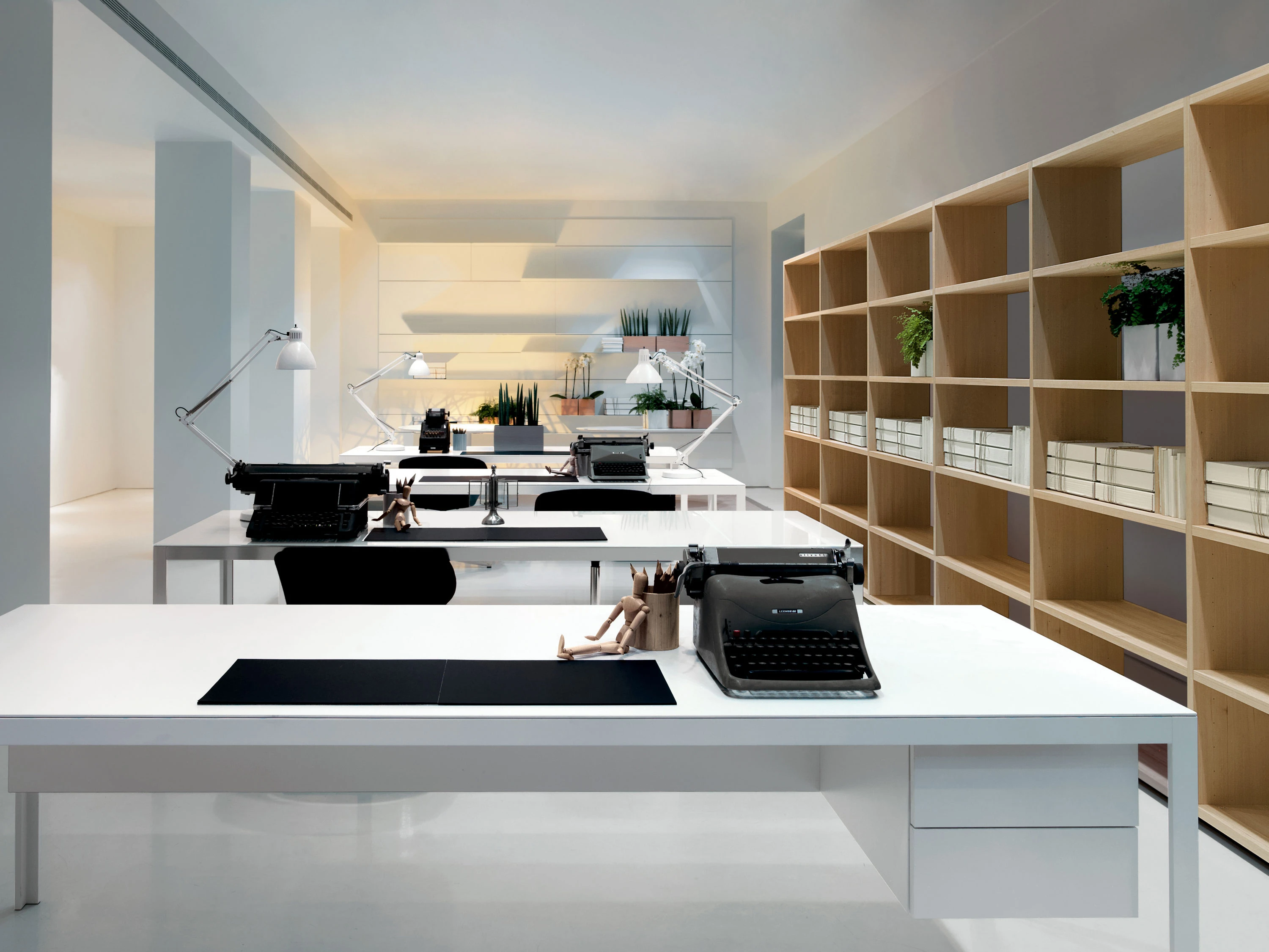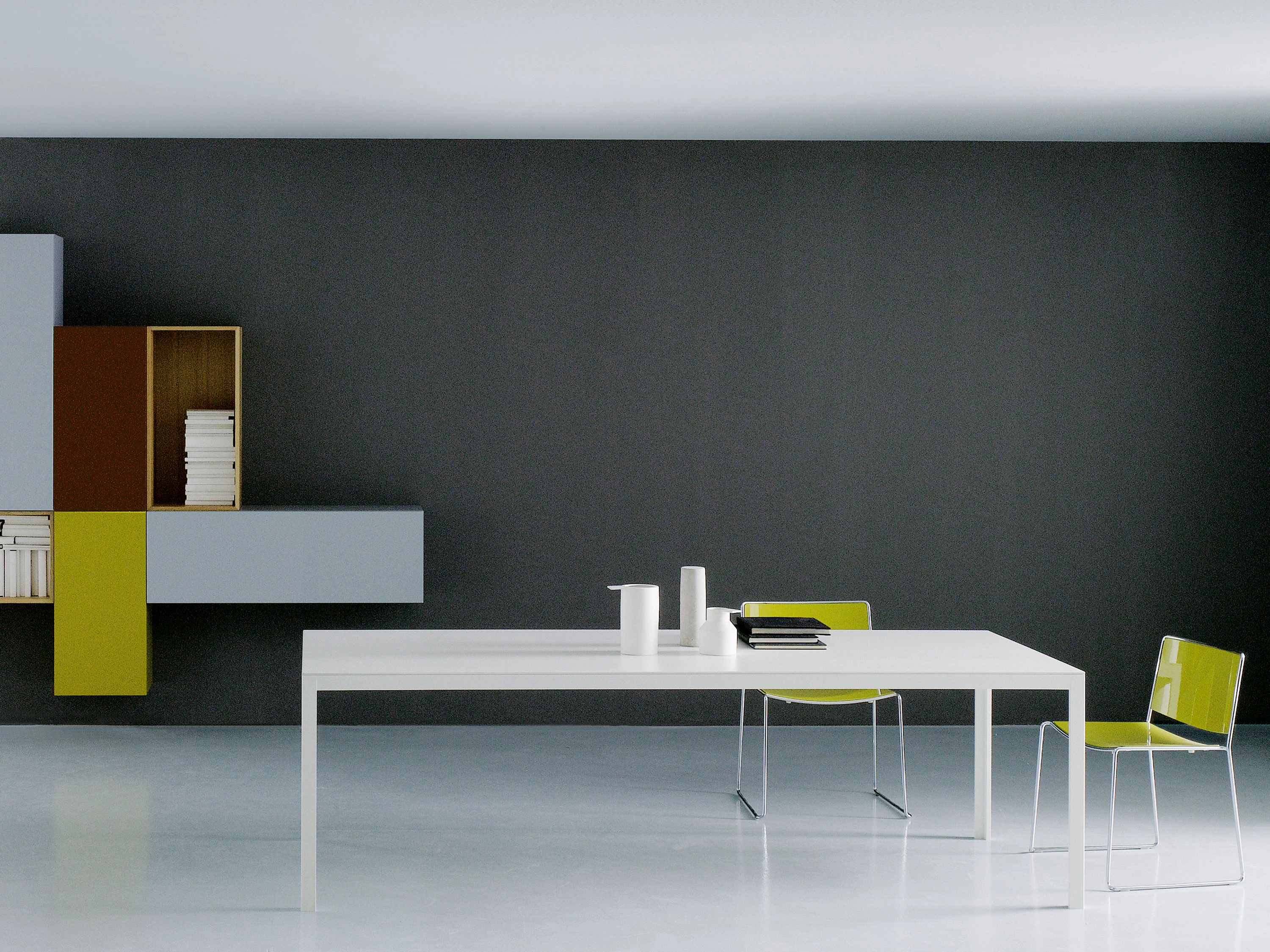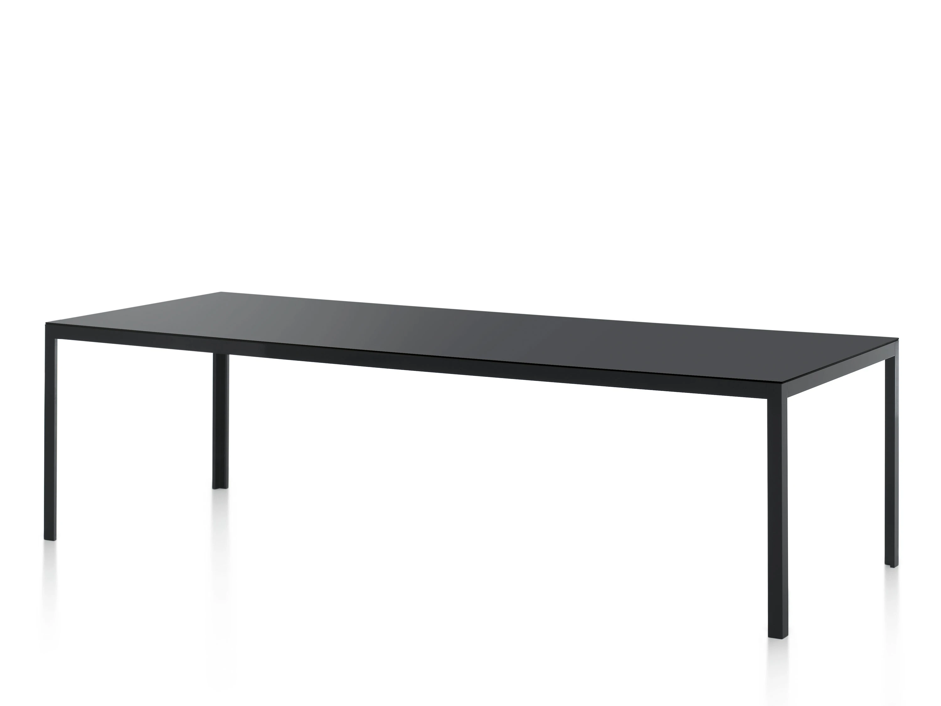 Fractal is a system of tables in several dimensions and finishes; it is a product highly versatile and capable of fitting perfectly home and office. Its essential structure with L-shaped reduced section legs black and white lacquered aluminium, can match tops of various materials, from transparent, etched or back-painted glass to lacquer or in the Porro woods, up to Corian® and HDS. For the working use, Fractal is completed by office equipment such as hanging drawer units, computer holder, vertical courtesy panel, column for cable passage inside the section of the leg and top access.