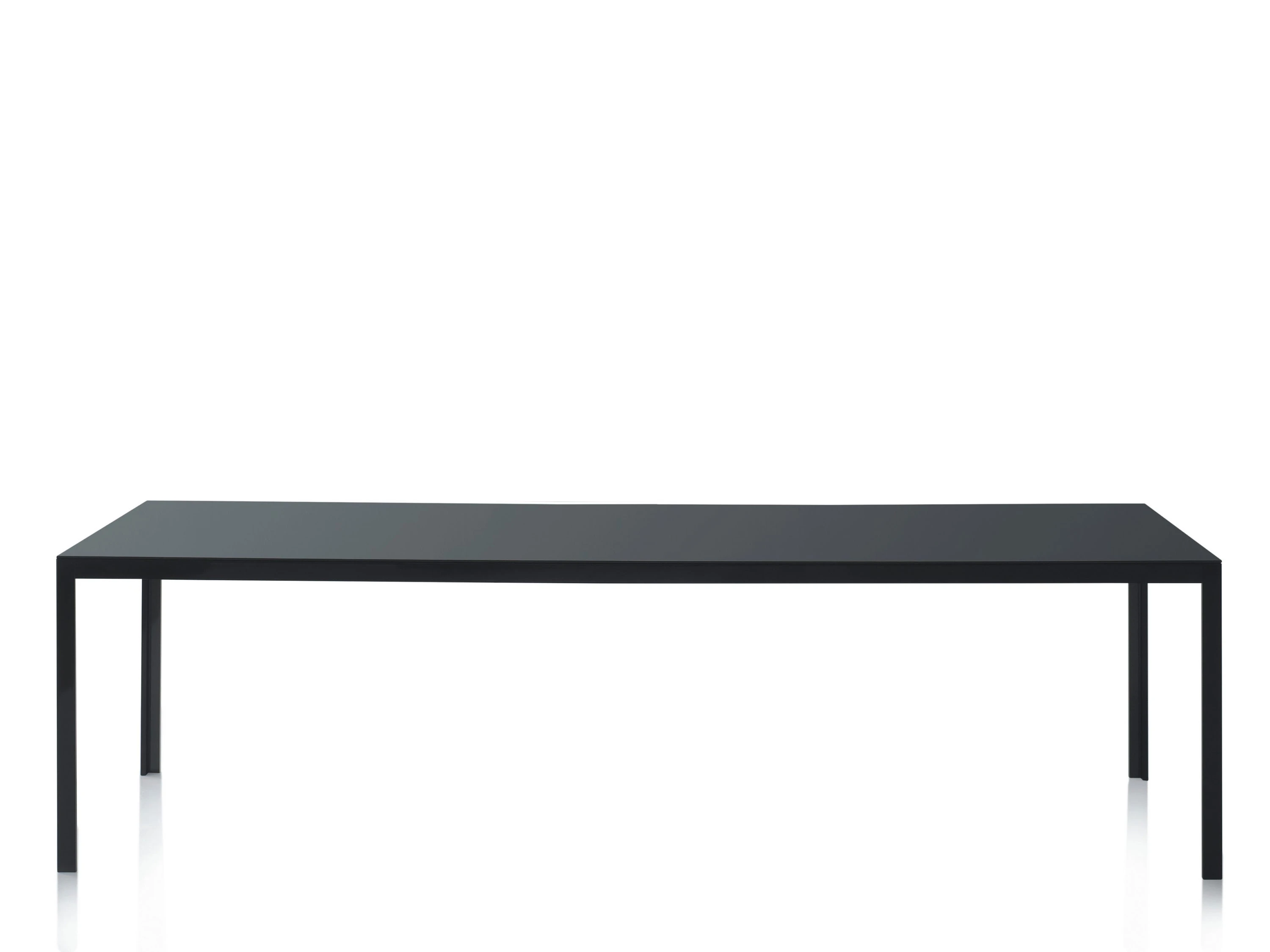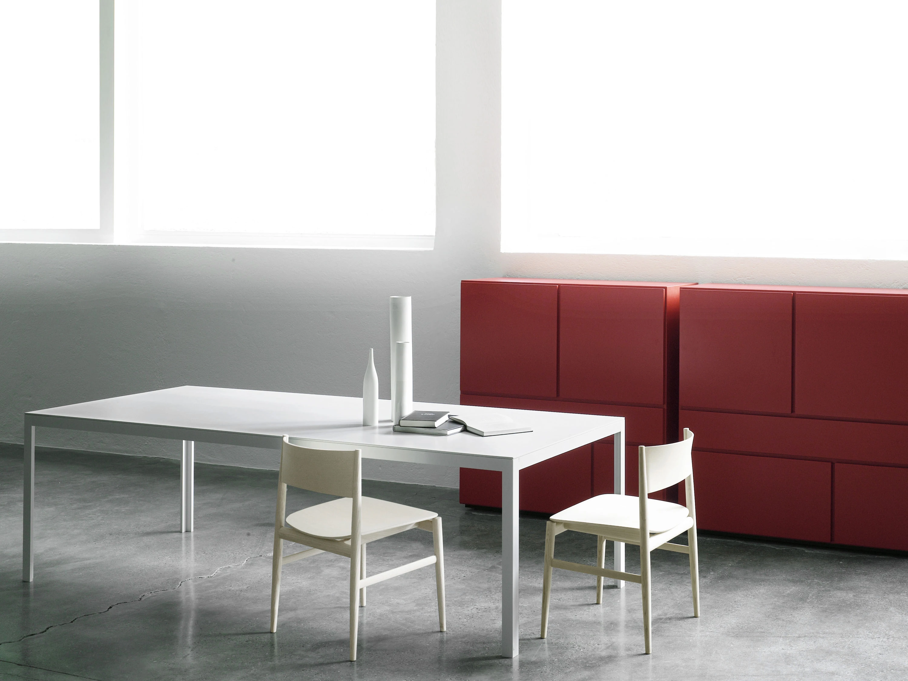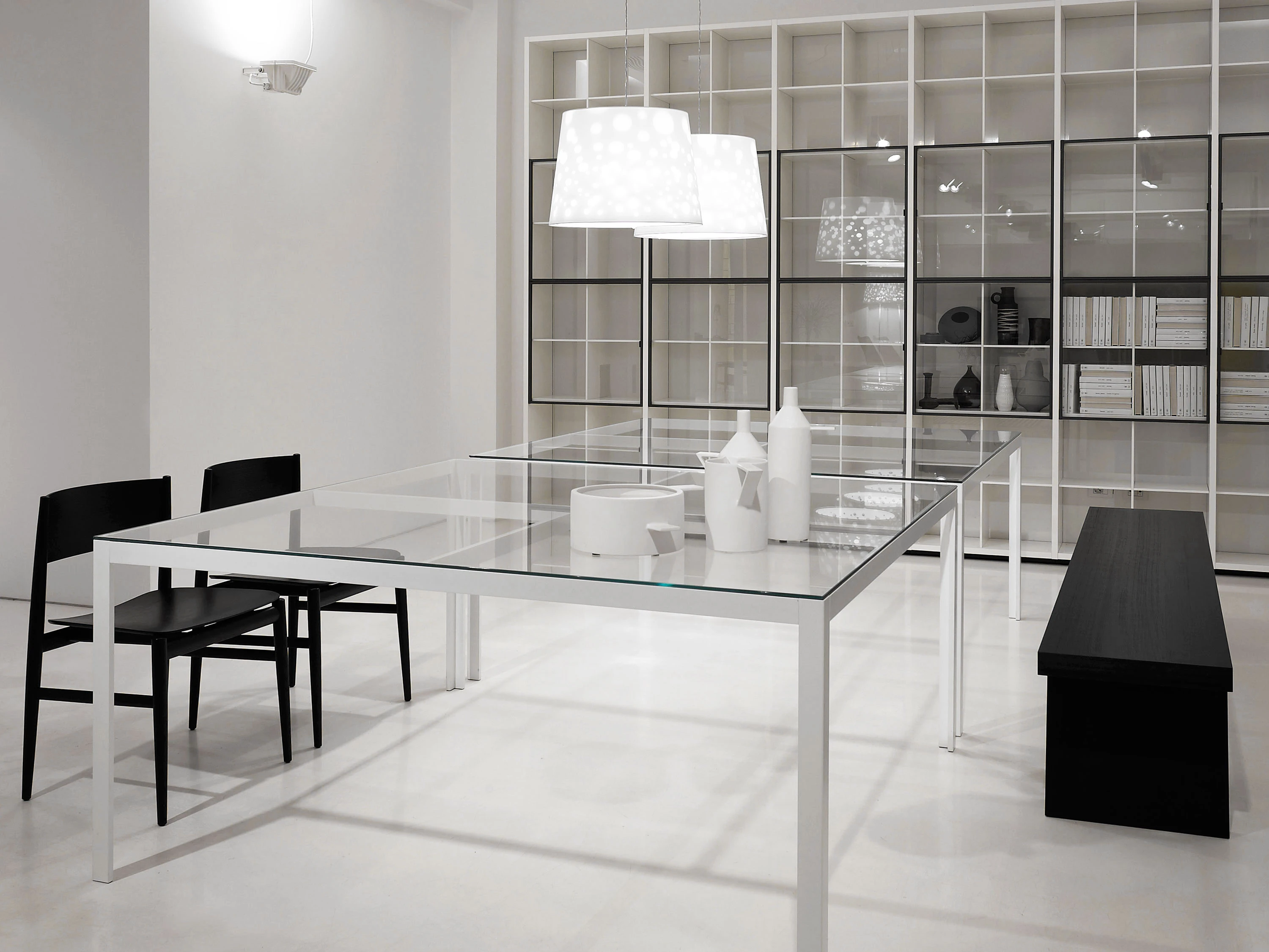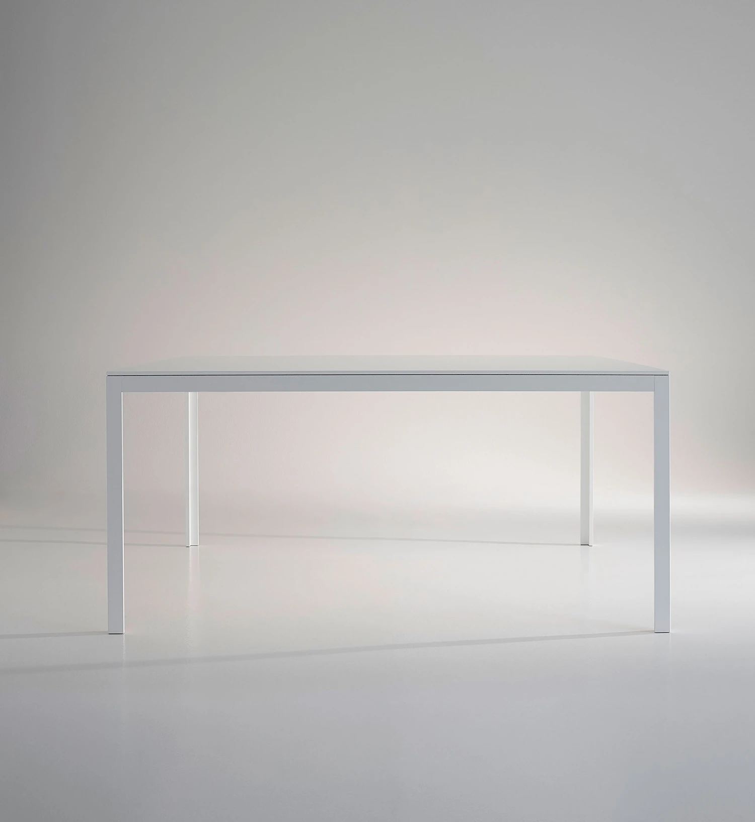 Fractal is a system of tables in several dimensions and finishes; it is a product highly versatile and capable of fitting perfectly home and office. Its essential structure with L-shaped reduced section legs black and white lacquered aluminium, can match tops of various materials, from transparent, etched or back-painted glass to lacquer or in the Porro woods, up to Corian® and HDS. For the working use, Fractal is completed by office equipment such as hanging drawer units, computer holder, vertical courtesy panel, column for cable passage inside the section of the leg and top access.