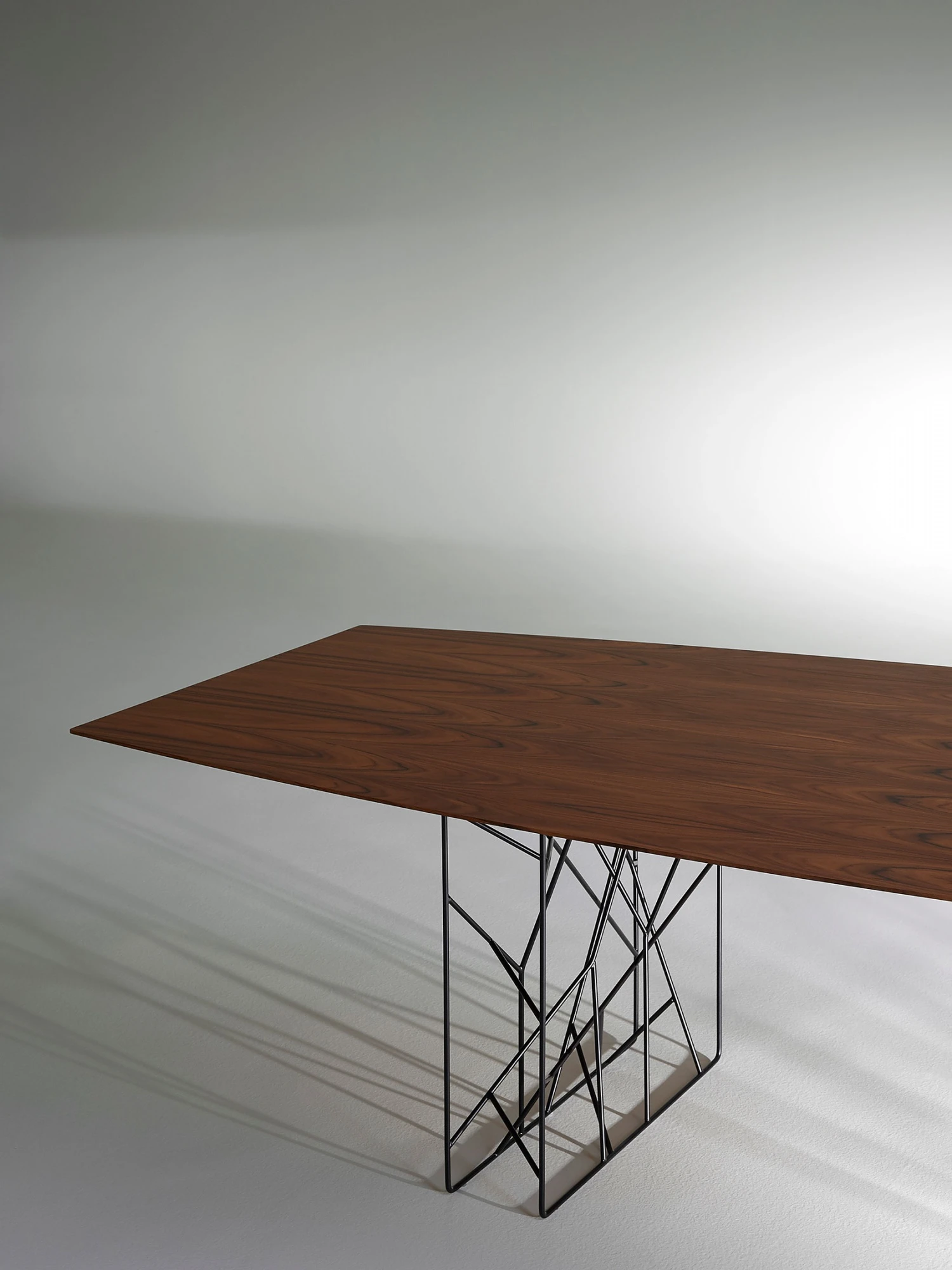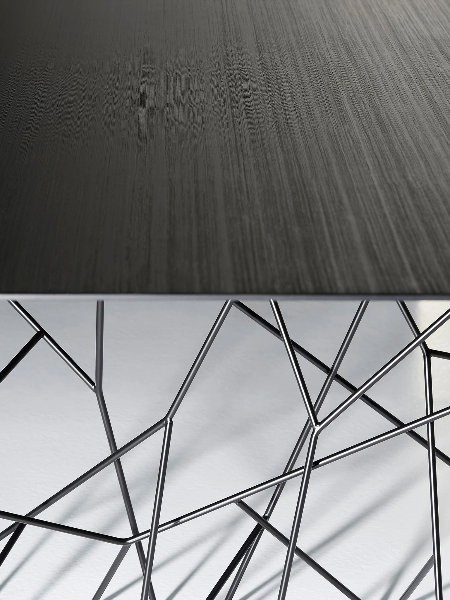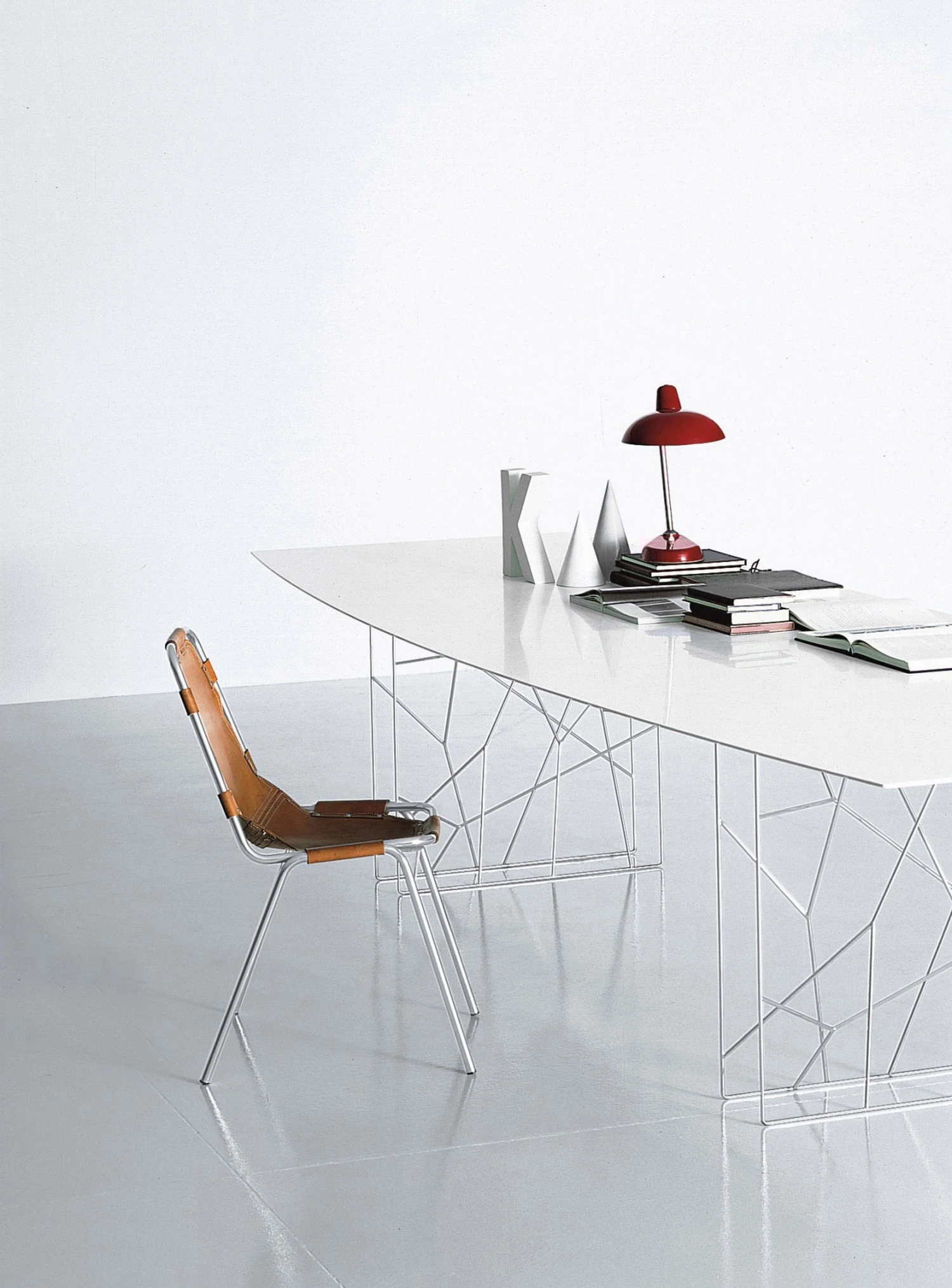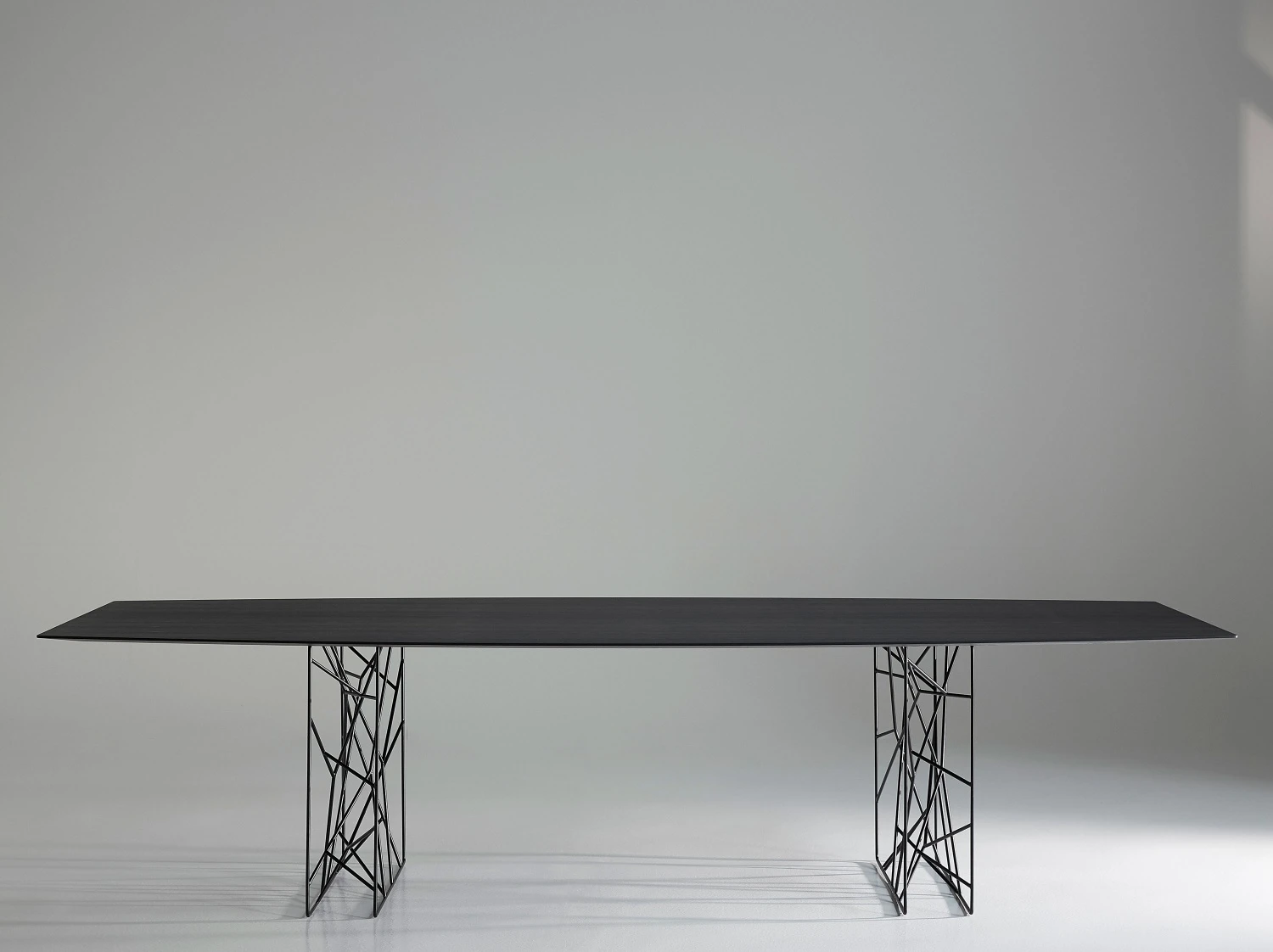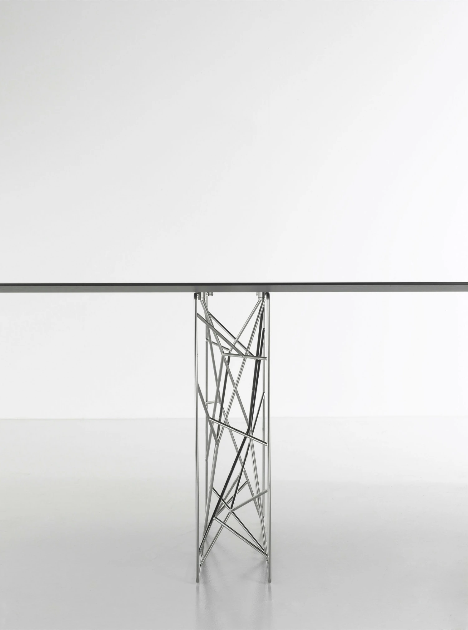 Innovating table with a unique design of the legs, made with a chromeplated or white and black rod iron. Available in different sizes, XL too as a meeting room table, Synapsis exhibits a unique oval shape, cut at the ends. The unique legs are matched with a thin top, available in different finishes: mat and bright lacquers in all the colours in the colour range, white or black high resistant mat lacquer, Pral ®, in the woods of the collection or in black back painted glass.
