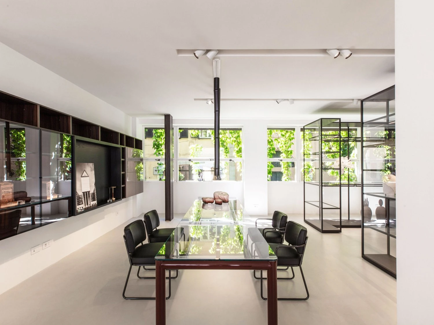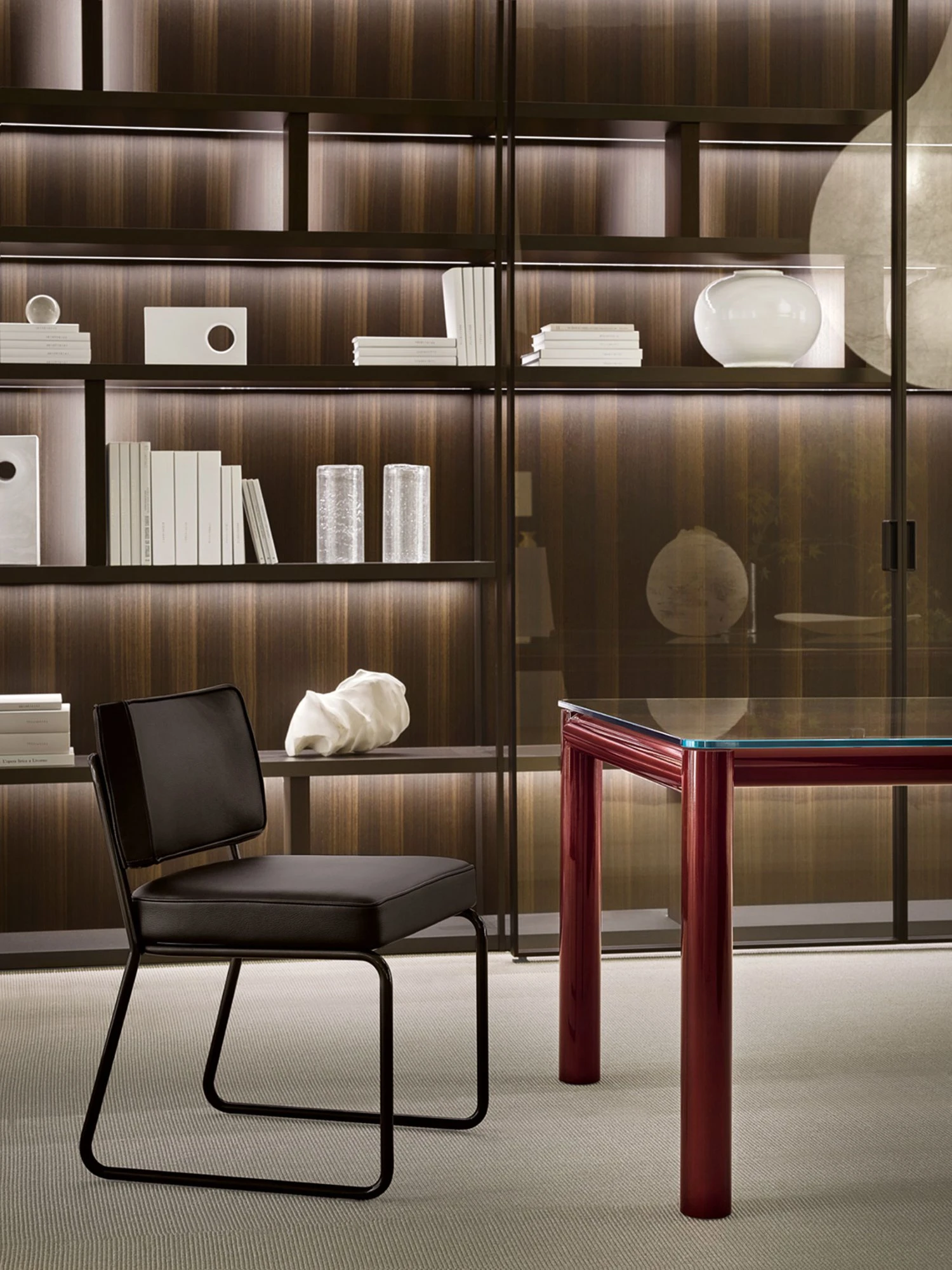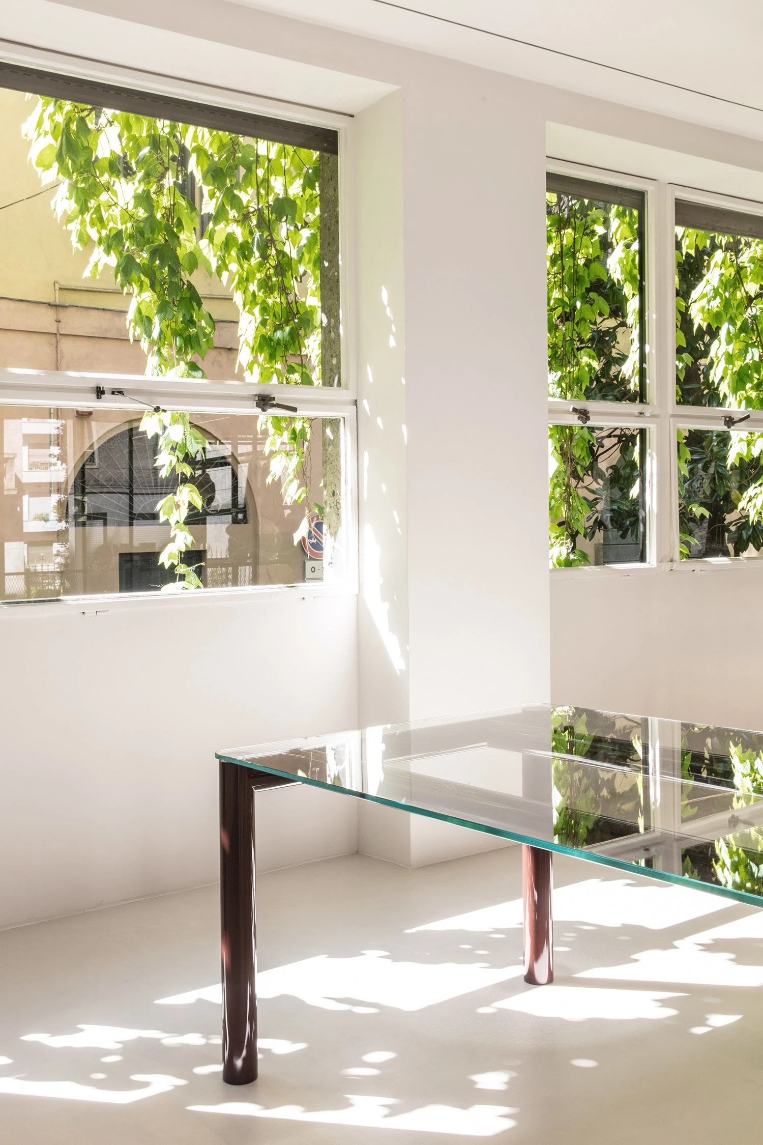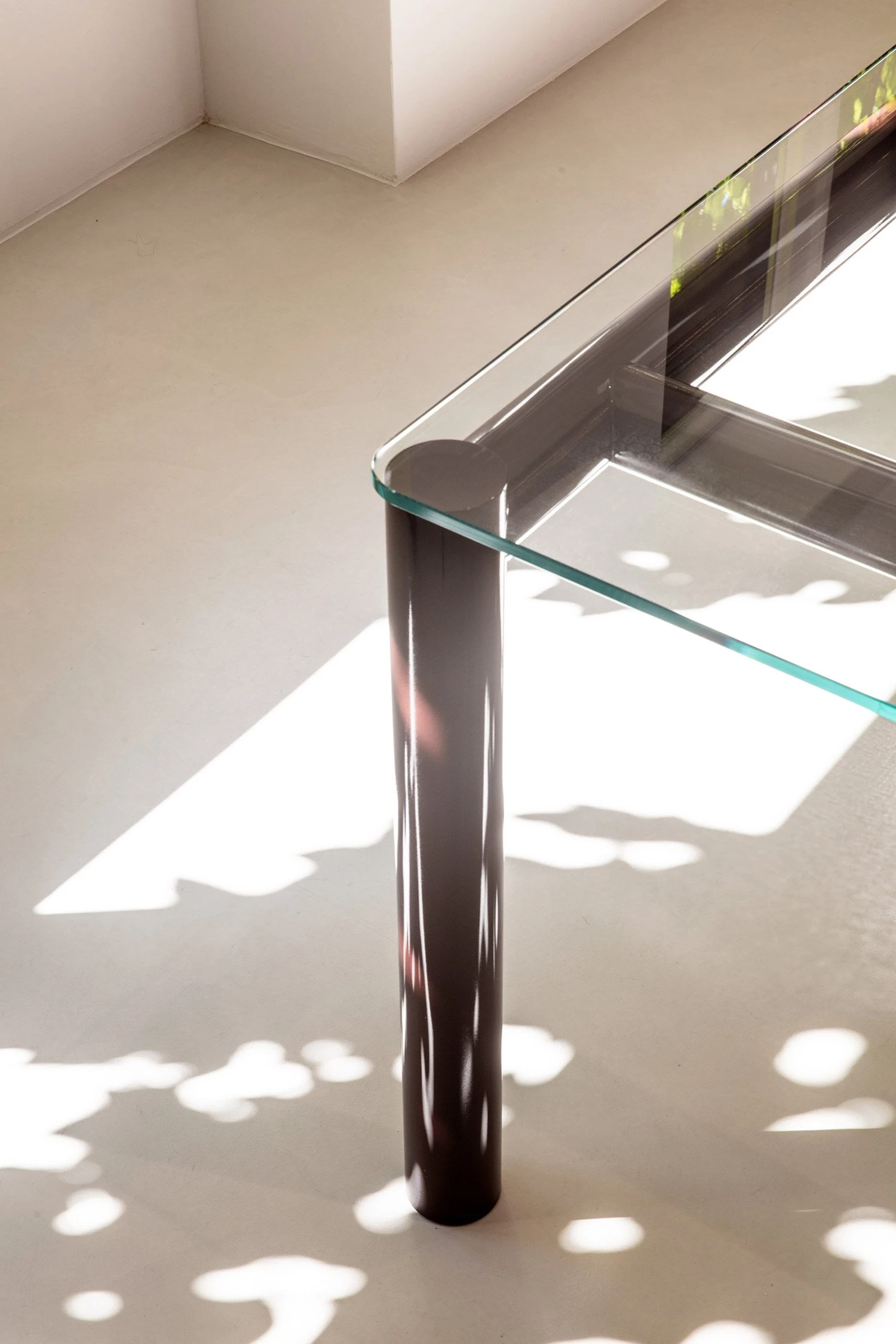 The finish for the top is extra-clear glass, while new metal finishes, both glossy and matt, have been developed for the base to characterize the shape: black, white, iron, silver, verde inglese, azuki.