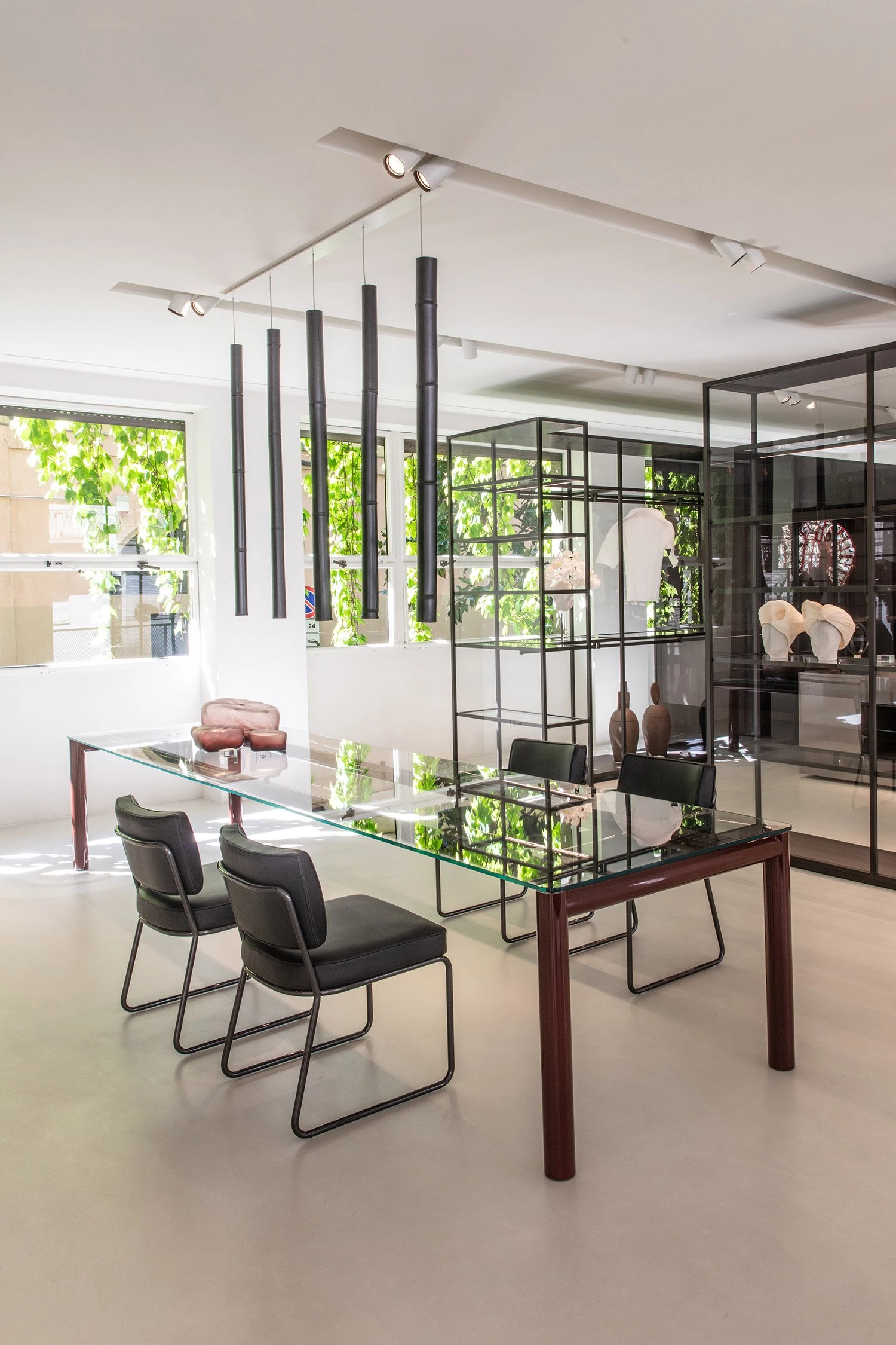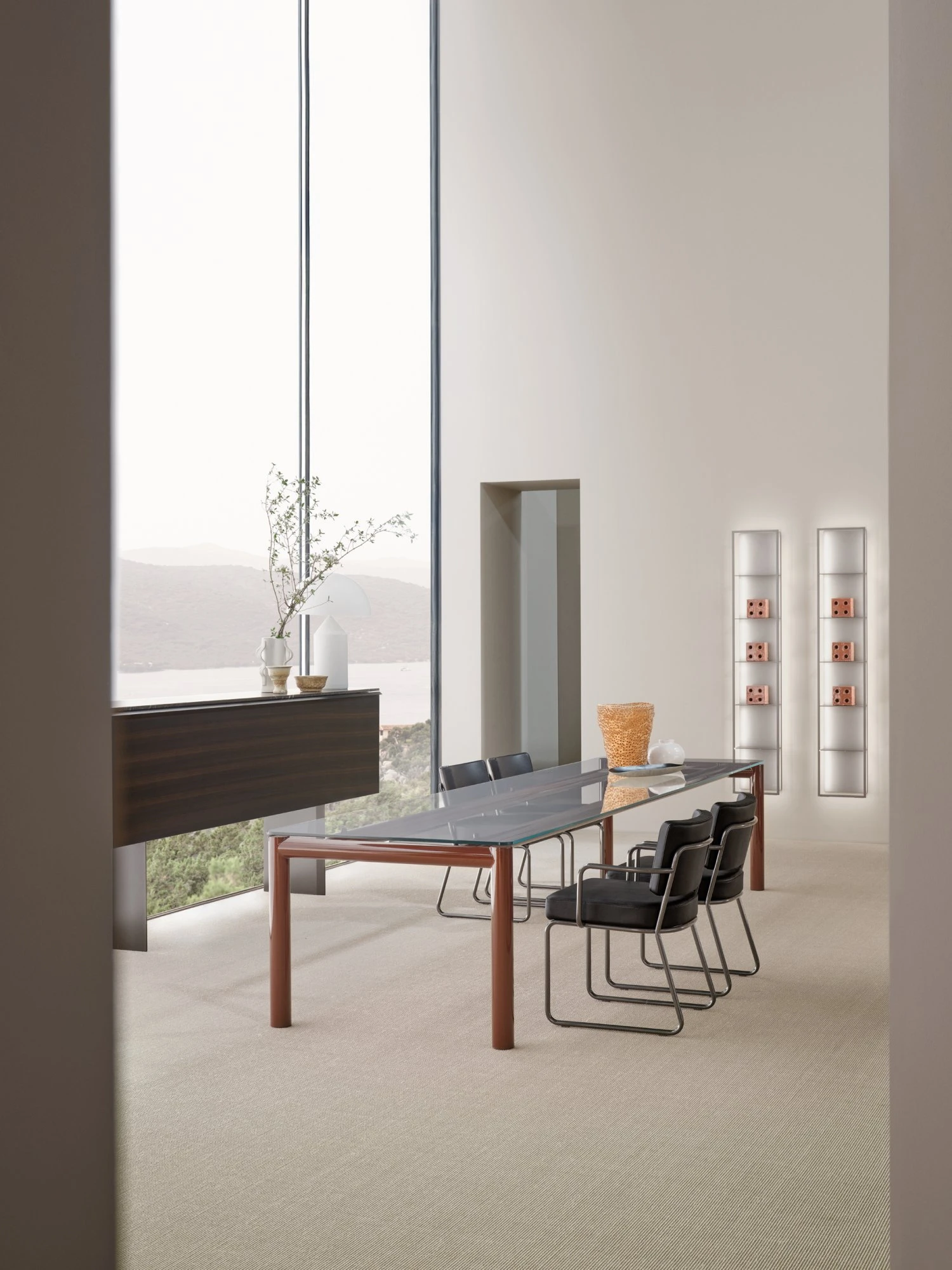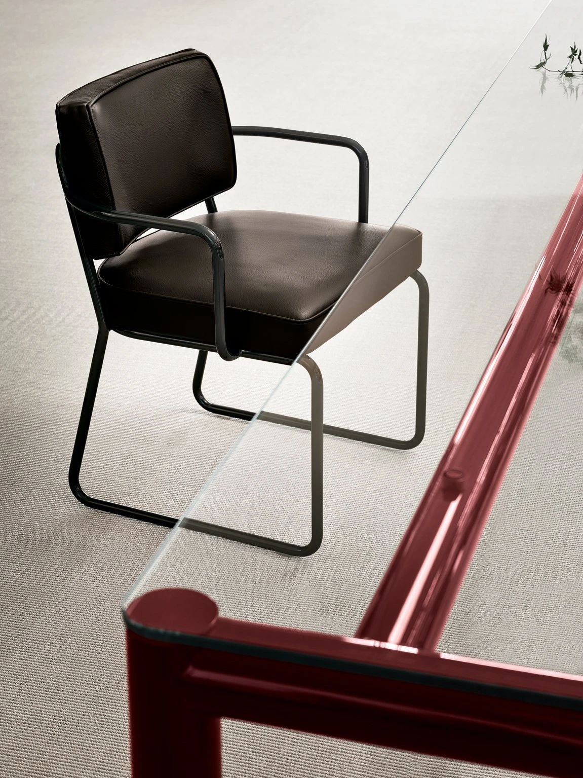 Ventiquattro table designed by Piero is made by a 12 mm extra-clear glass top with rounded edges that leaves the welded tubular metal base frame completely exposed. The legs, with a diameter of 8 cm, create a double trestle connected by two chains: this construction approach ensures great strength and rigidity even for very large dimensions.