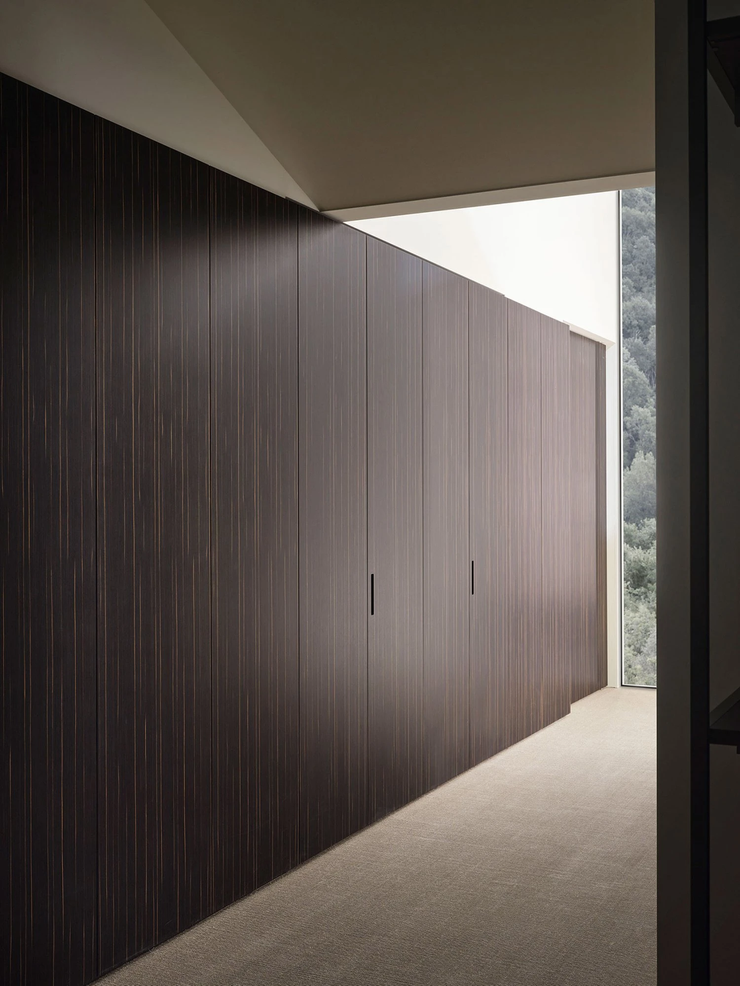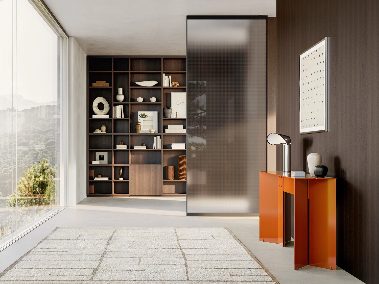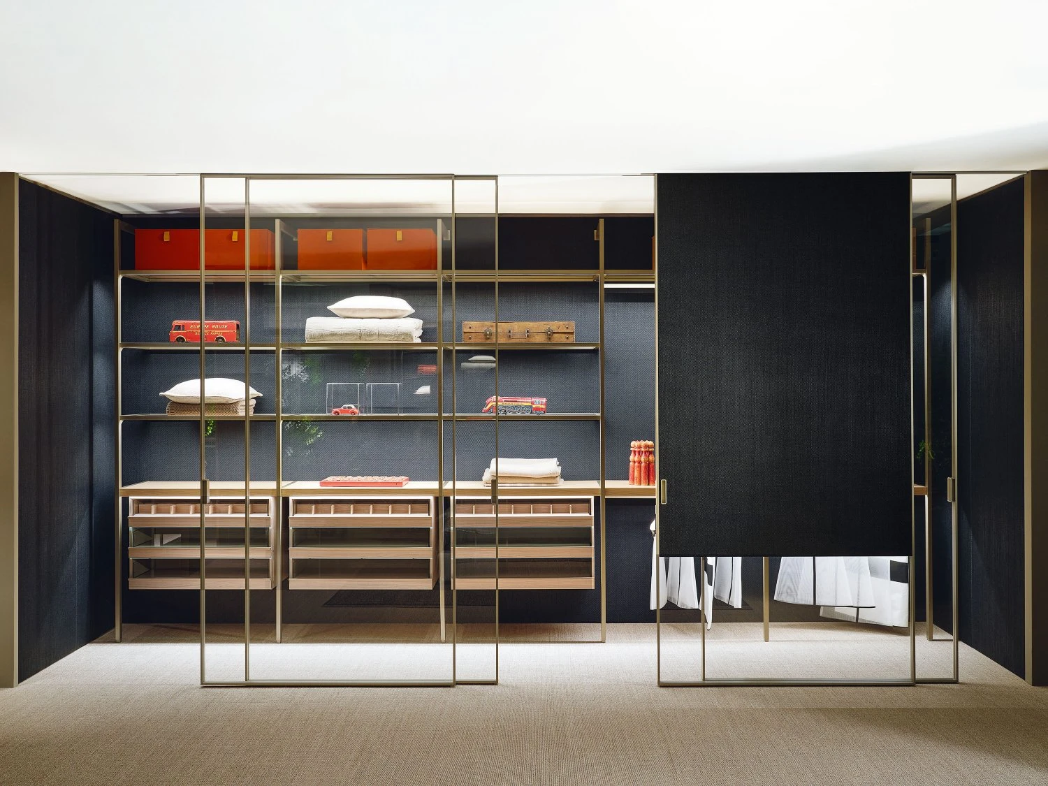Porro covers with fluidity spaces through Layer, the square meter panels system that makes it possible to apply on the surfaces all Porro finishes, from glossy and matt lacquers to essences, up to fabrics, eco-leathers and straw, for new material effects all to be explored.