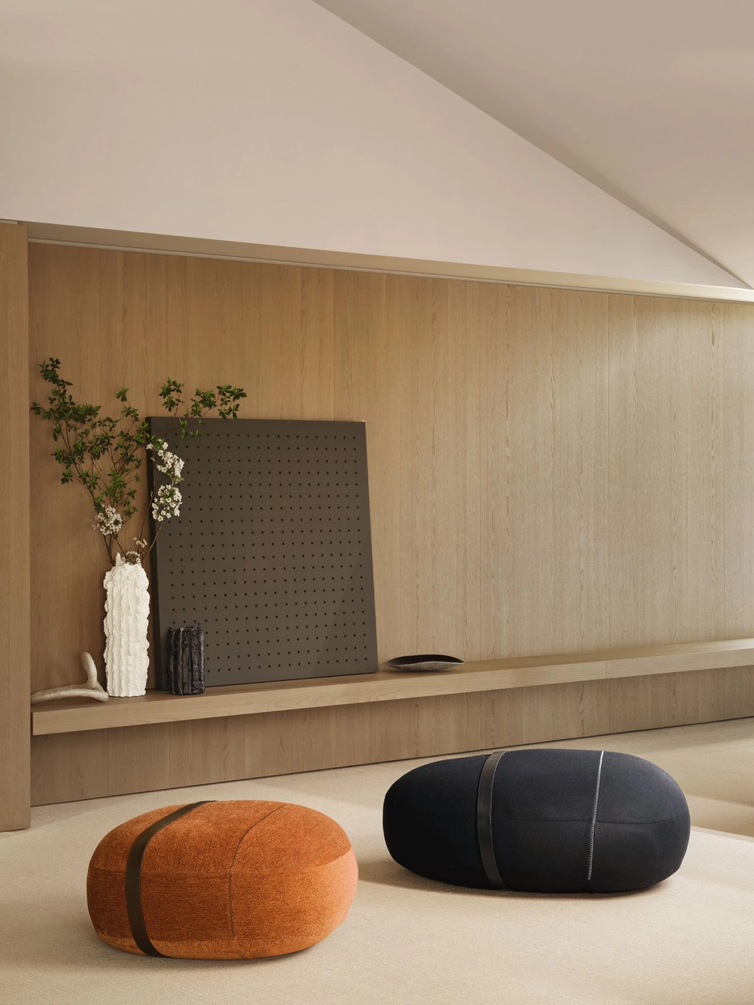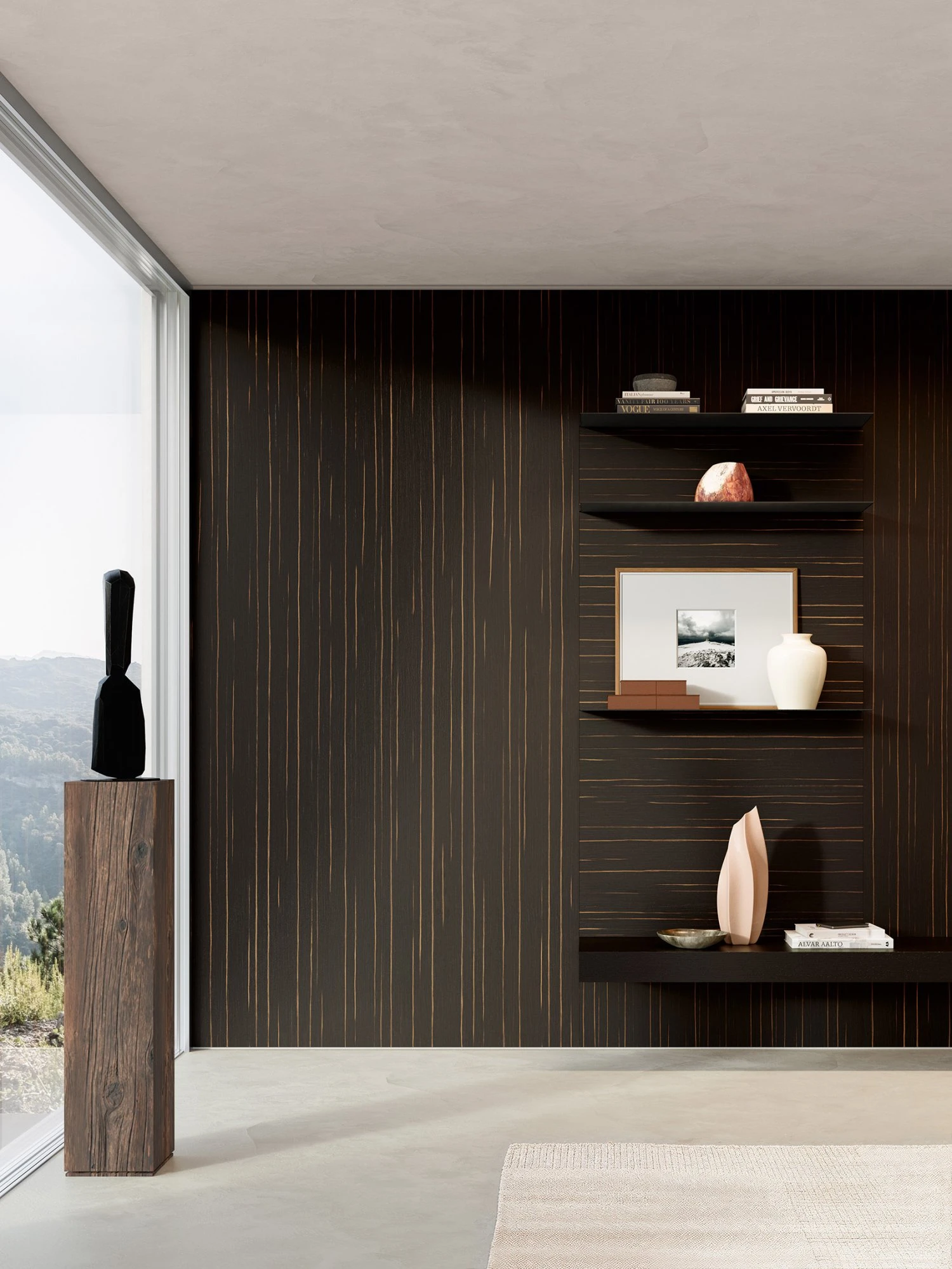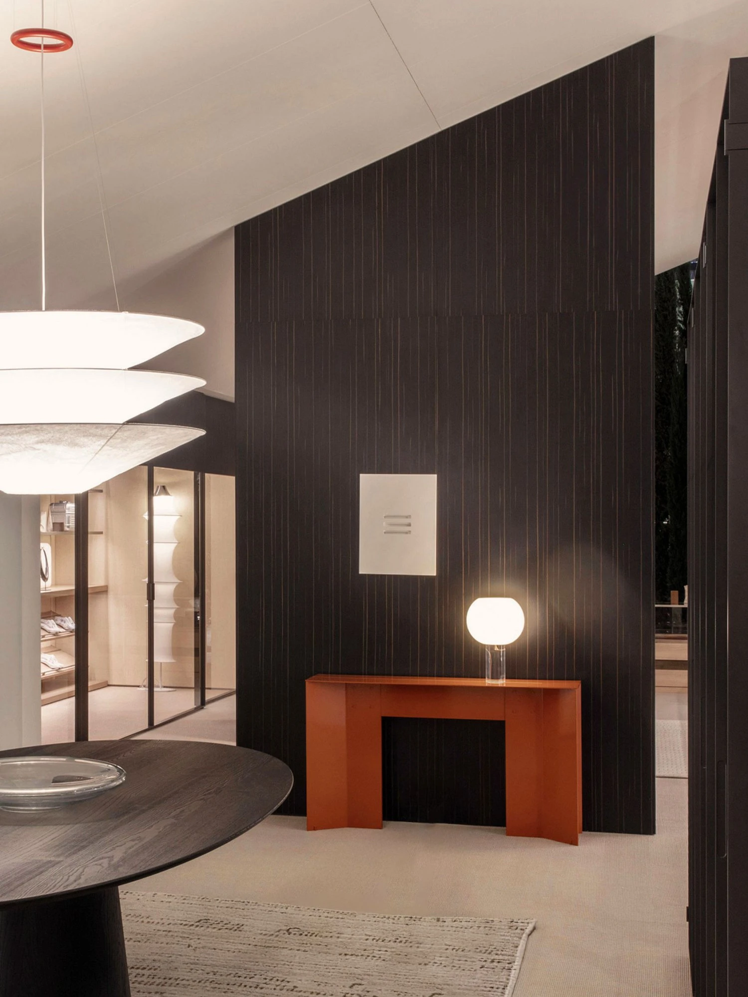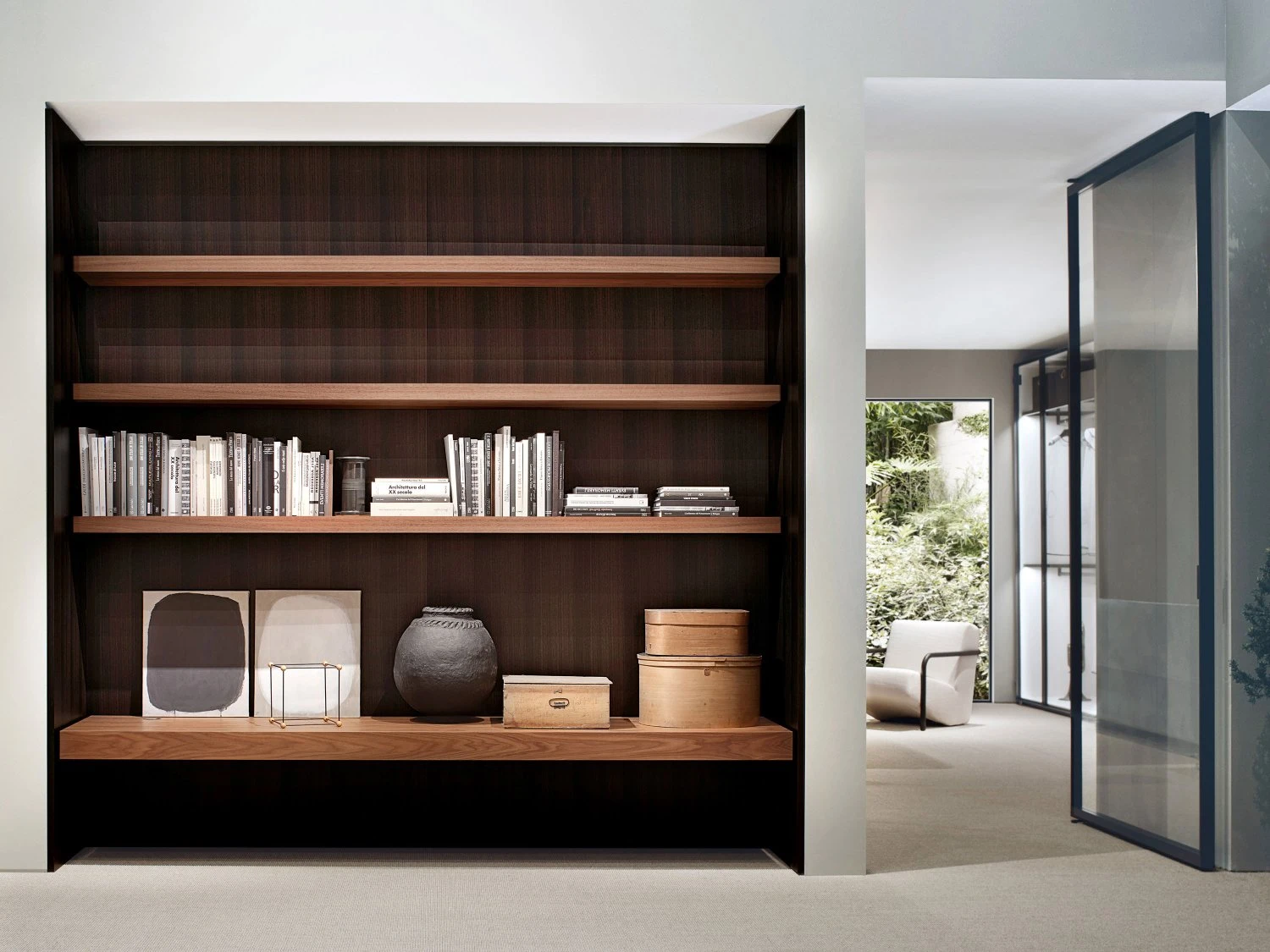 Porro covers with fluidity spaces through Layer, the square meter panels system that makes it possible to apply on the surfaces all Porro finishes, from glossy and matt lacquers to essences, up to fabrics, eco-leathers and straw, for new material effects all to be explored.