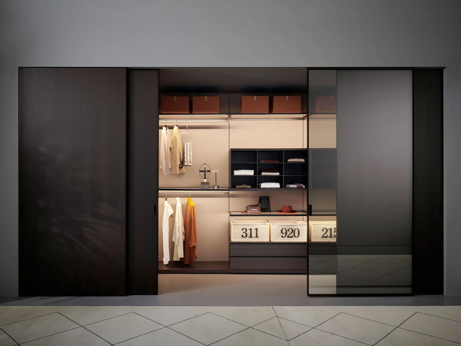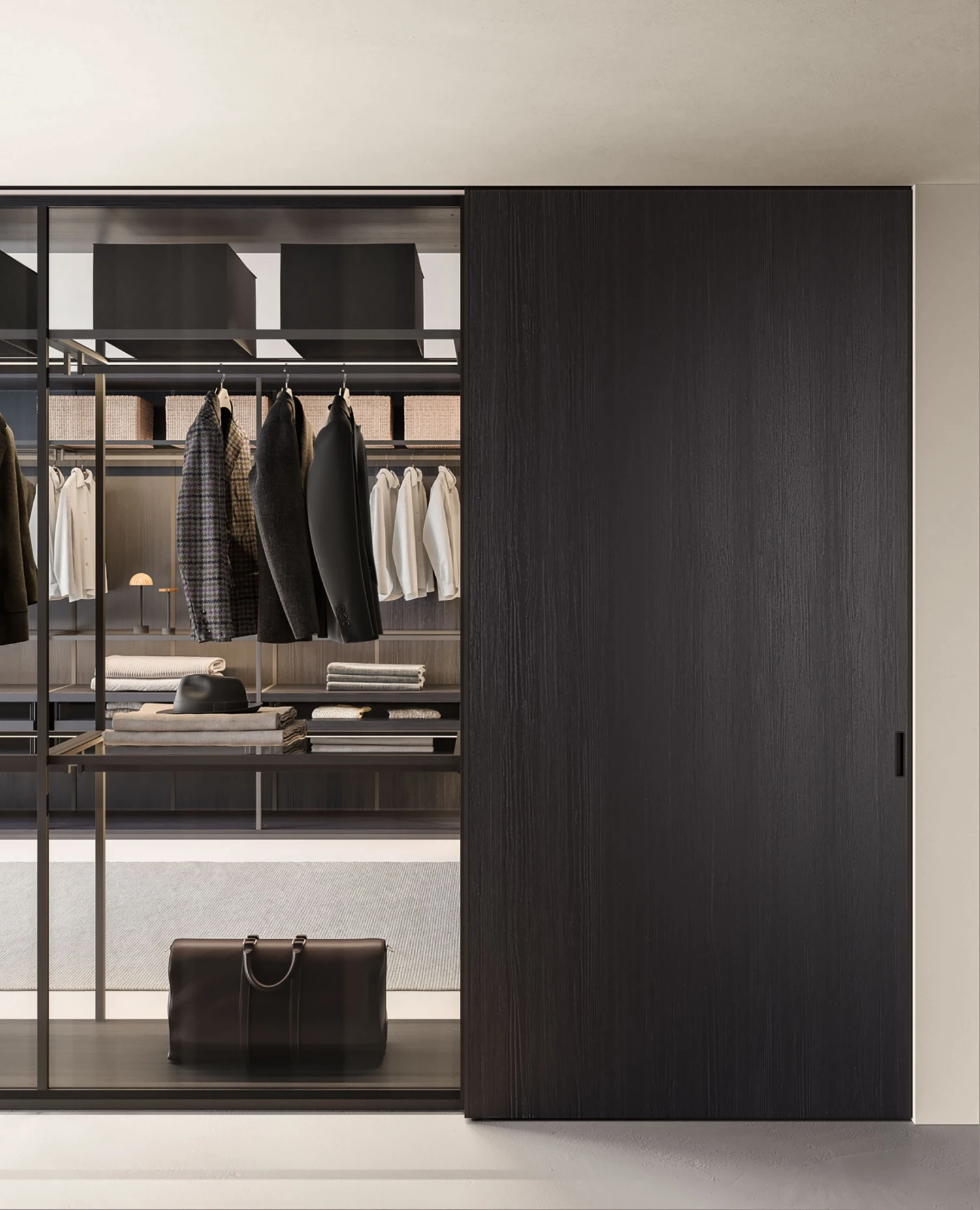 Porro expands the partition project developing the Glide system, which comes in different design solutions that can however be perfectly mixed and matched with one another. With their sleek yet materially rich design, Glide partitions are made up of large made-to-measure wings featuring an L-shaped metal profile that, painted in white, black, cuvée, moka or rosso antico, frames different transparent and non-transparent materials. Thanks to the upper rail, which leaves the floor intact for the sake of visual continuity, Glide sliding fixed or pivoting partitions flexibly offer different solutions to choose from or to combine together in eye-catching overlaps.