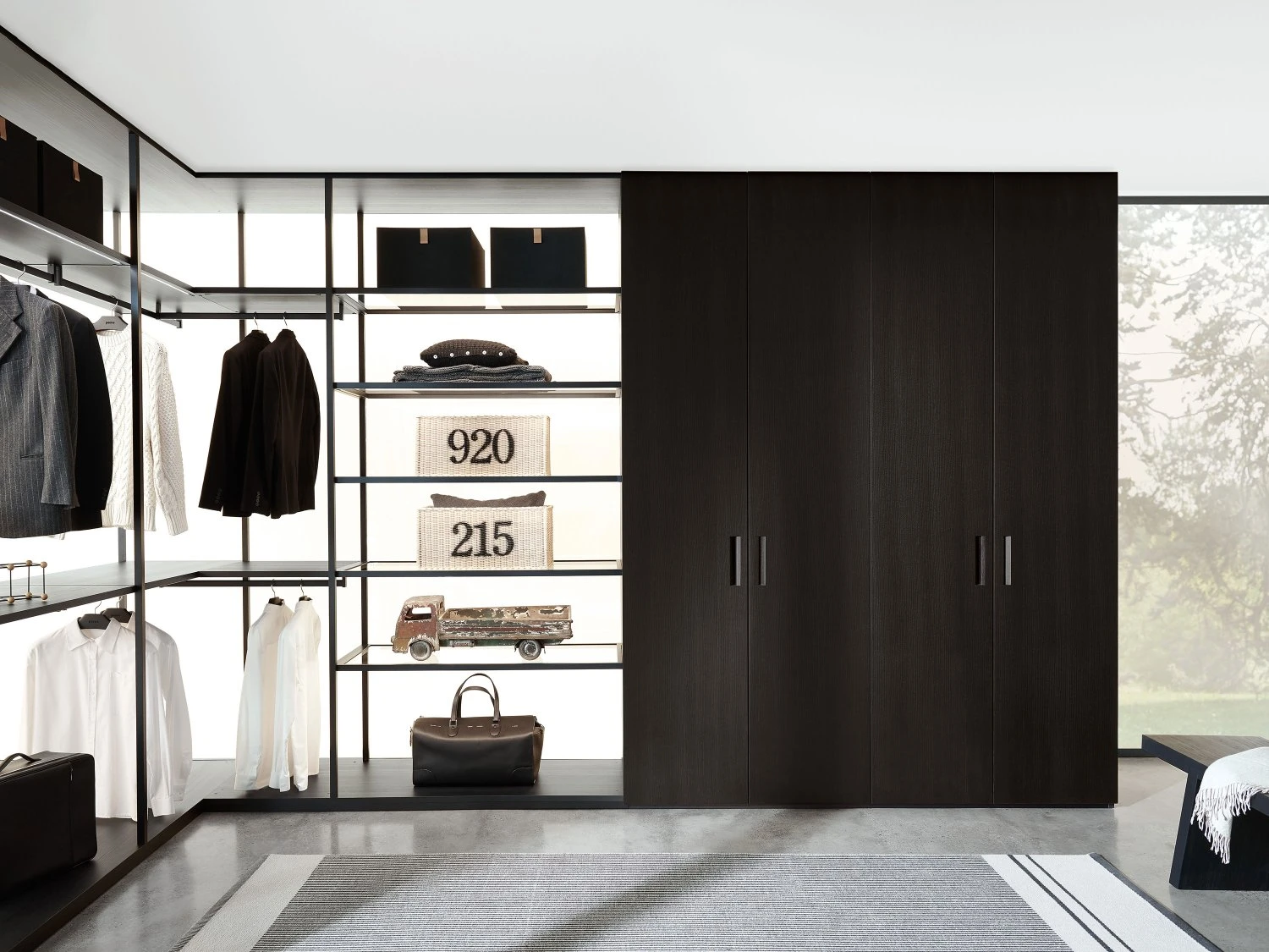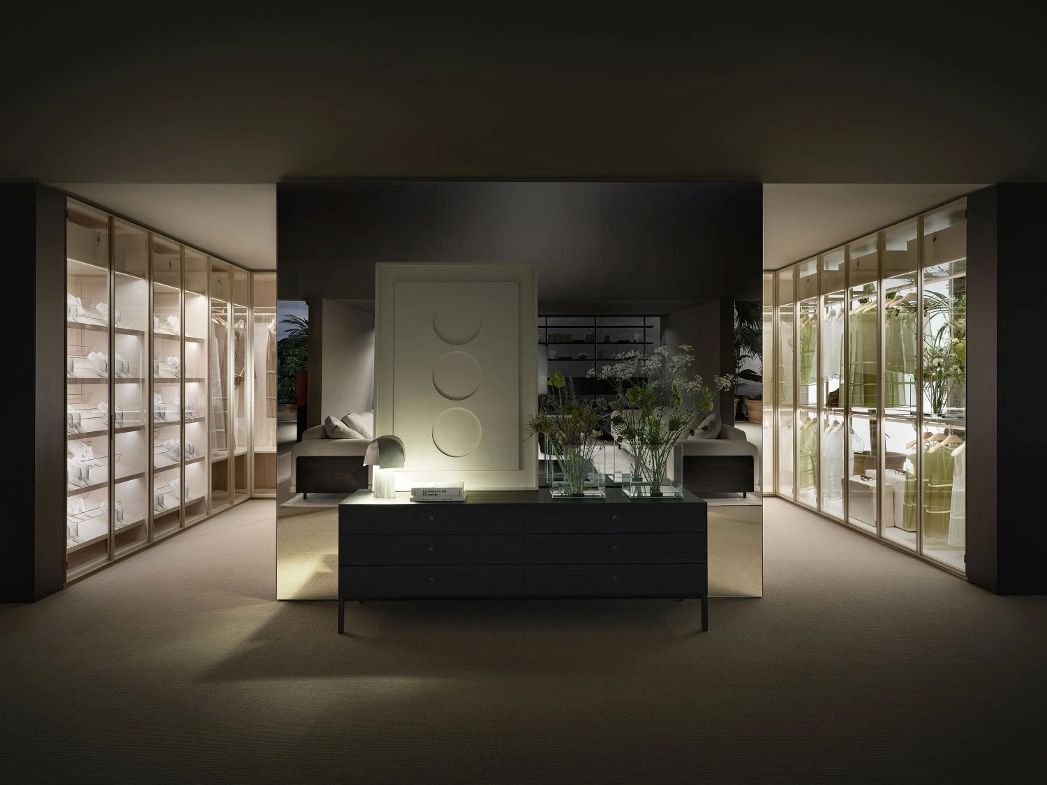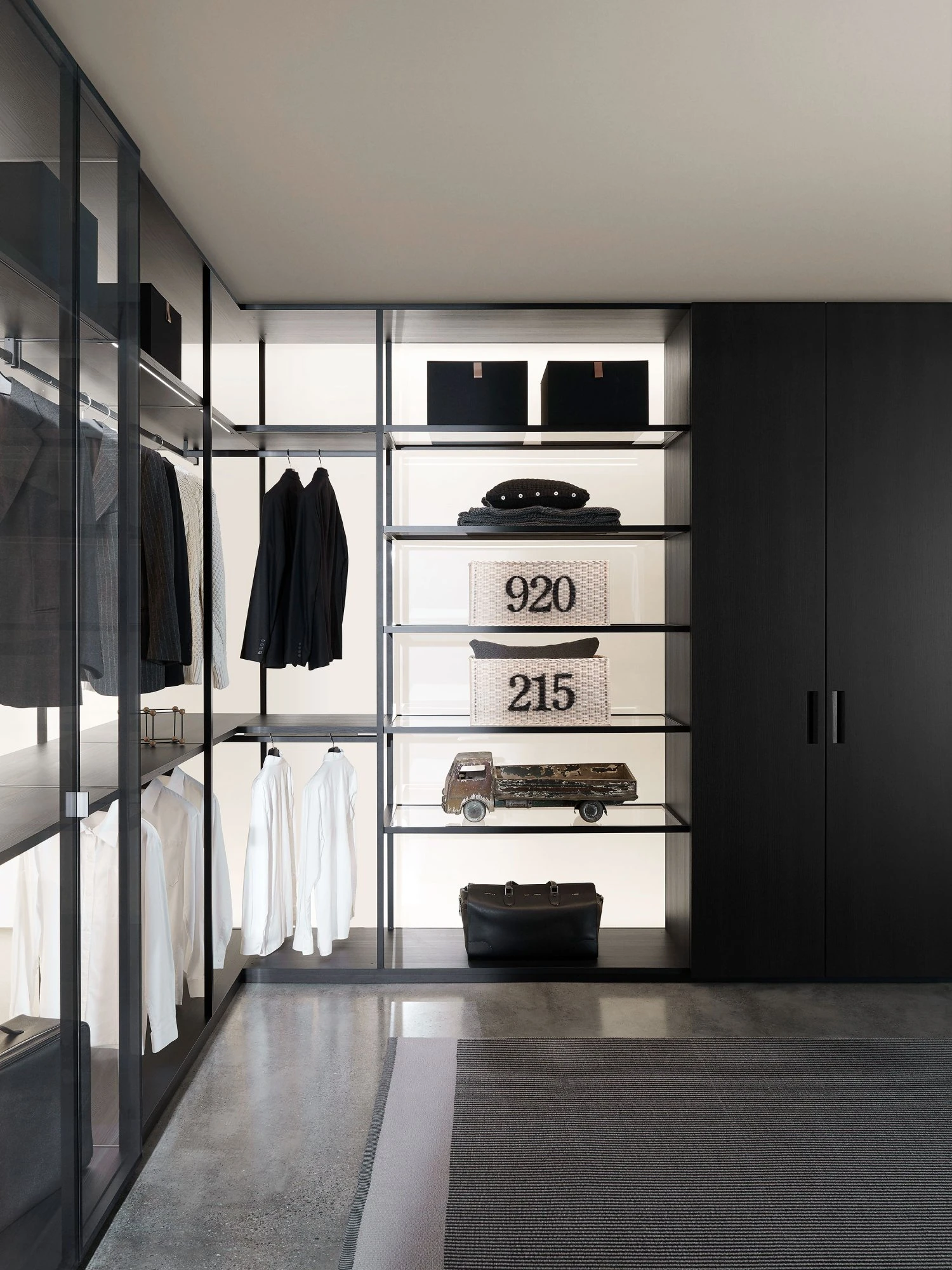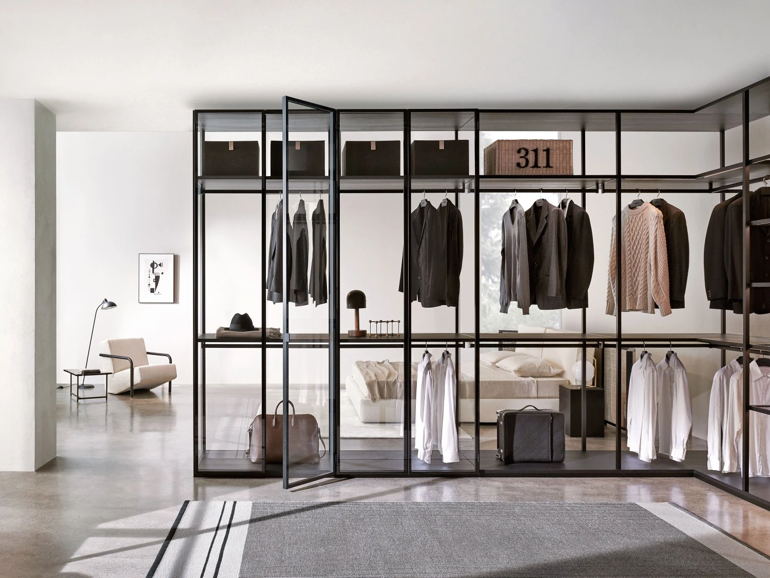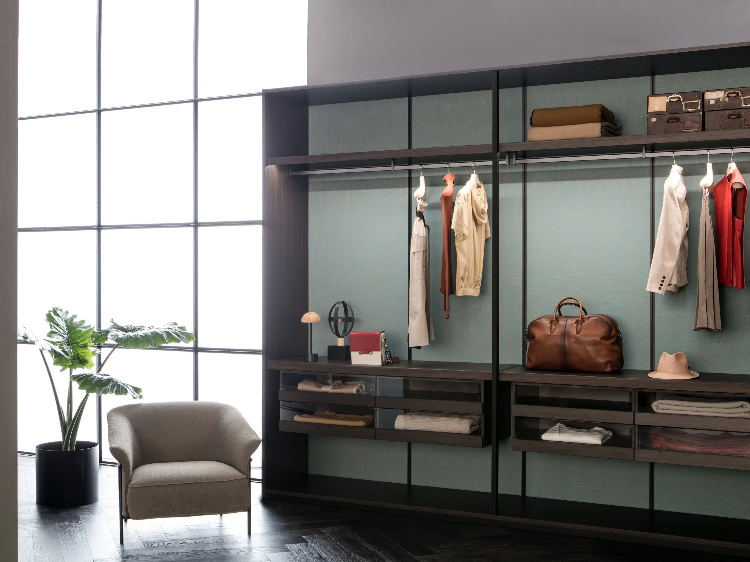With as many as three different concepts of wardrobe structure, Storage is the first modular system that provides for a continuous space throughout the wardrobe. Innovation lies in the new design of the load-bearing element of the structure. Always seen and conceived as an element to divide parts of the wardrobe, with Storage the side panel is no longer a barrier, but becomes the element that allows continuity of space inside the wardrobe, while brilliantly fulfilling its function as a load-bearing element of the structure and support for the horizontal elements. Inside the wardrobe the idea of space acquires a new value. Thanks to the three different types of structure - walk-in closet, traditional wardrobe and boiserie, now perfectly matching one another - it is possible to create open or closed spaces by alternating different materials for transparent and non-transparent solutions.