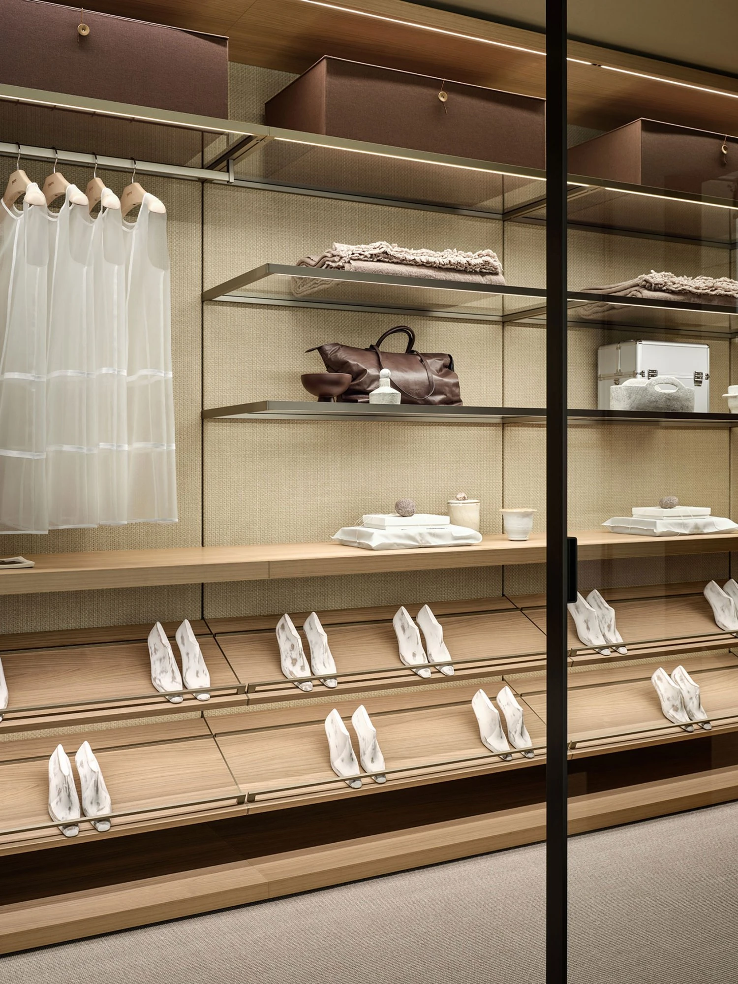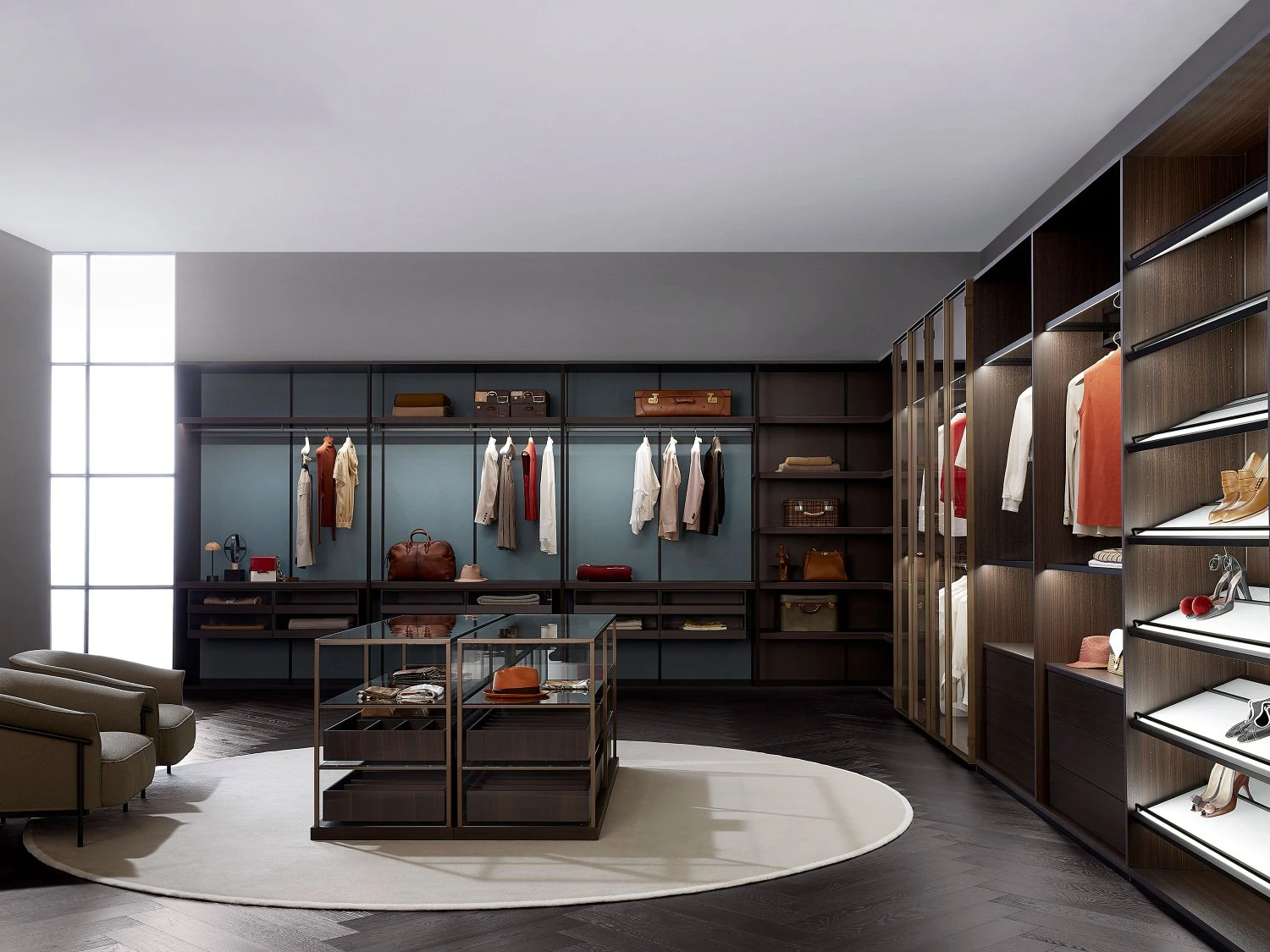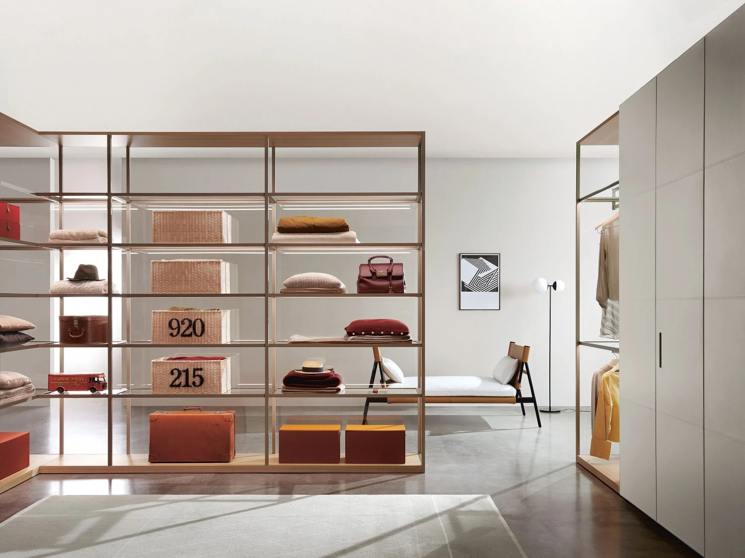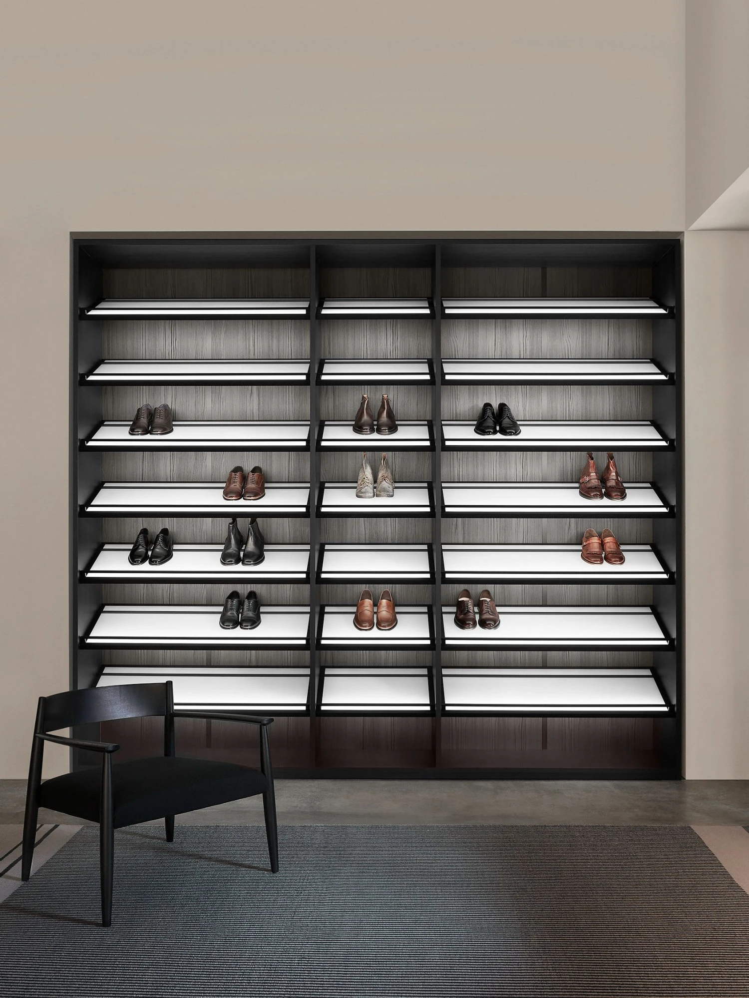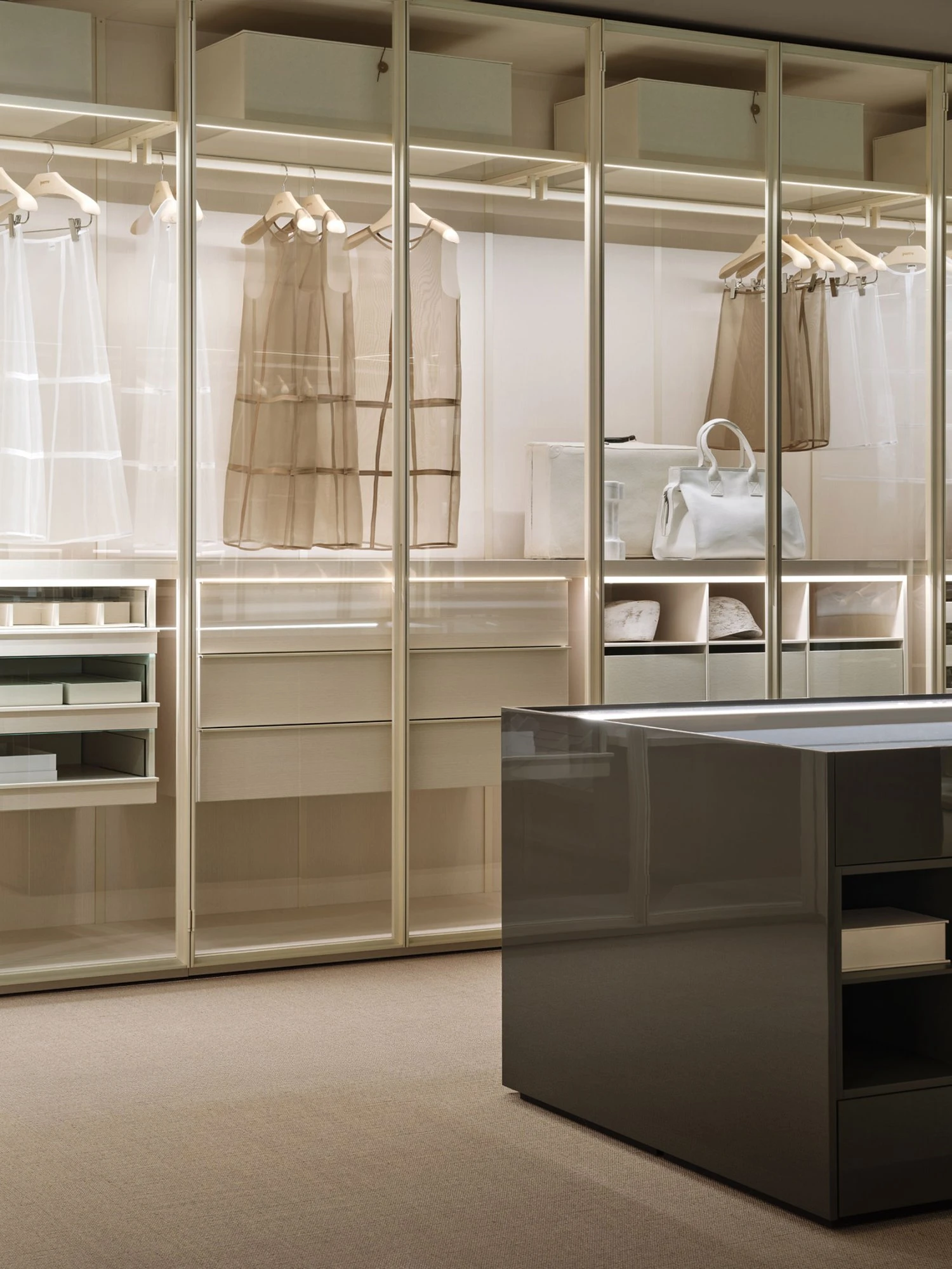 With as many as three different concepts of wardrobe structure, Storage is the first modular system that provides for a continuous space throughout the wardrobe. Innovation lies in the new design of the load-bearing element of the structure. Always seen and conceived as an element to divide parts of the wardrobe, with Storage the side panel is no longer a barrier, but becomes the element that allows continuity of space inside the wardrobe, while brilliantly fulfilling its function as a load-bearing element of the structure and support for the horizontal elements. Inside the wardrobe the idea of space acquires a new value. Thanks to the three different types of structure - walk-in closet, traditional wardrobe and boiserie, now perfectly matching one another - it is possible to create open or closed spaces by alternating different materials for transparent and non-transparent solutions.