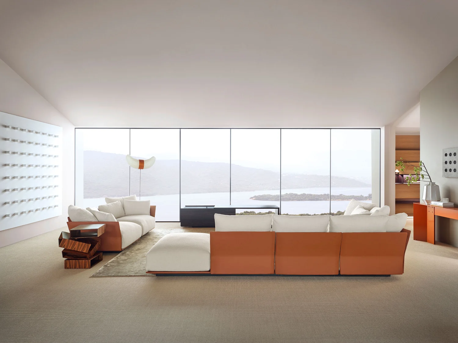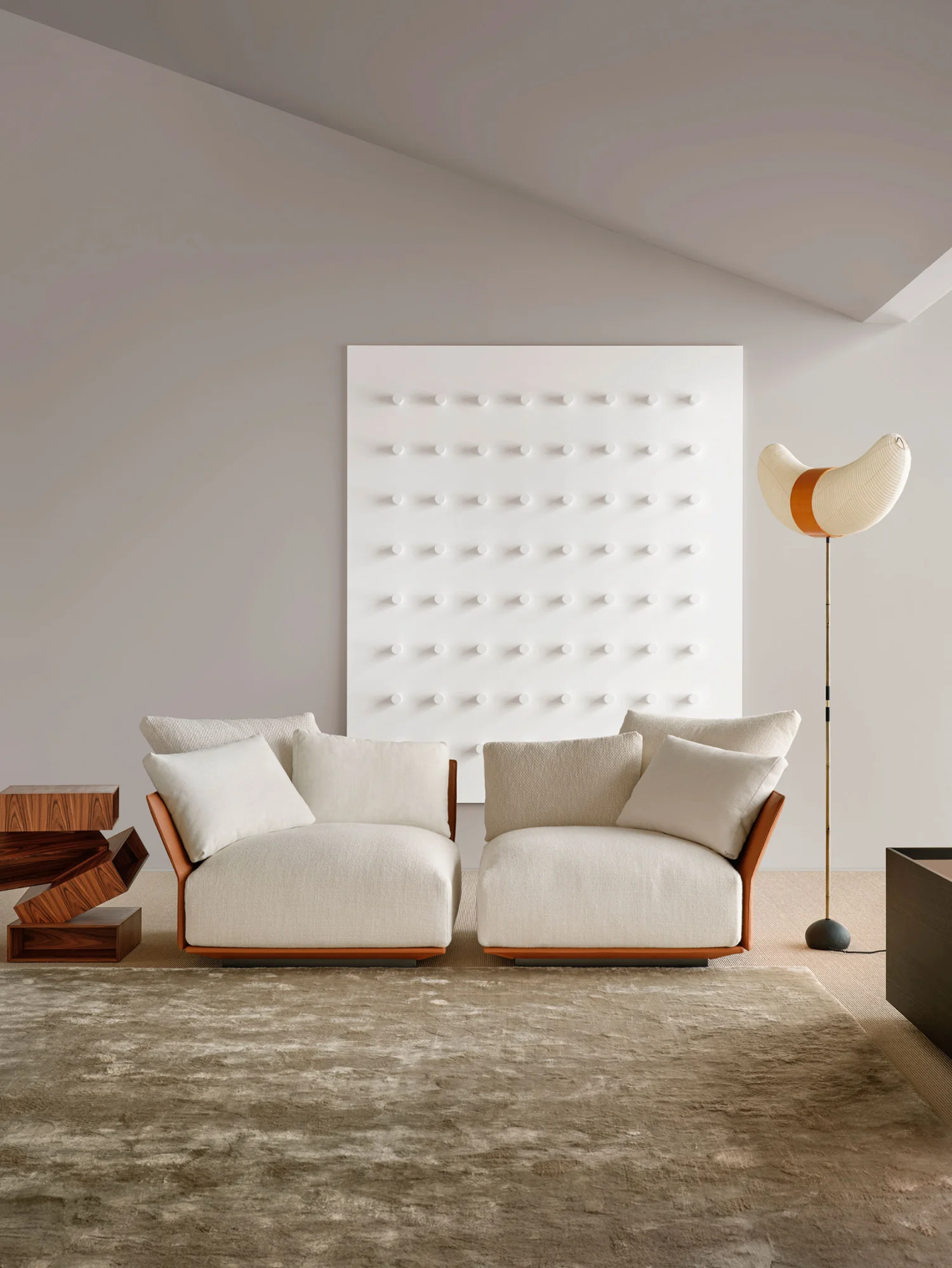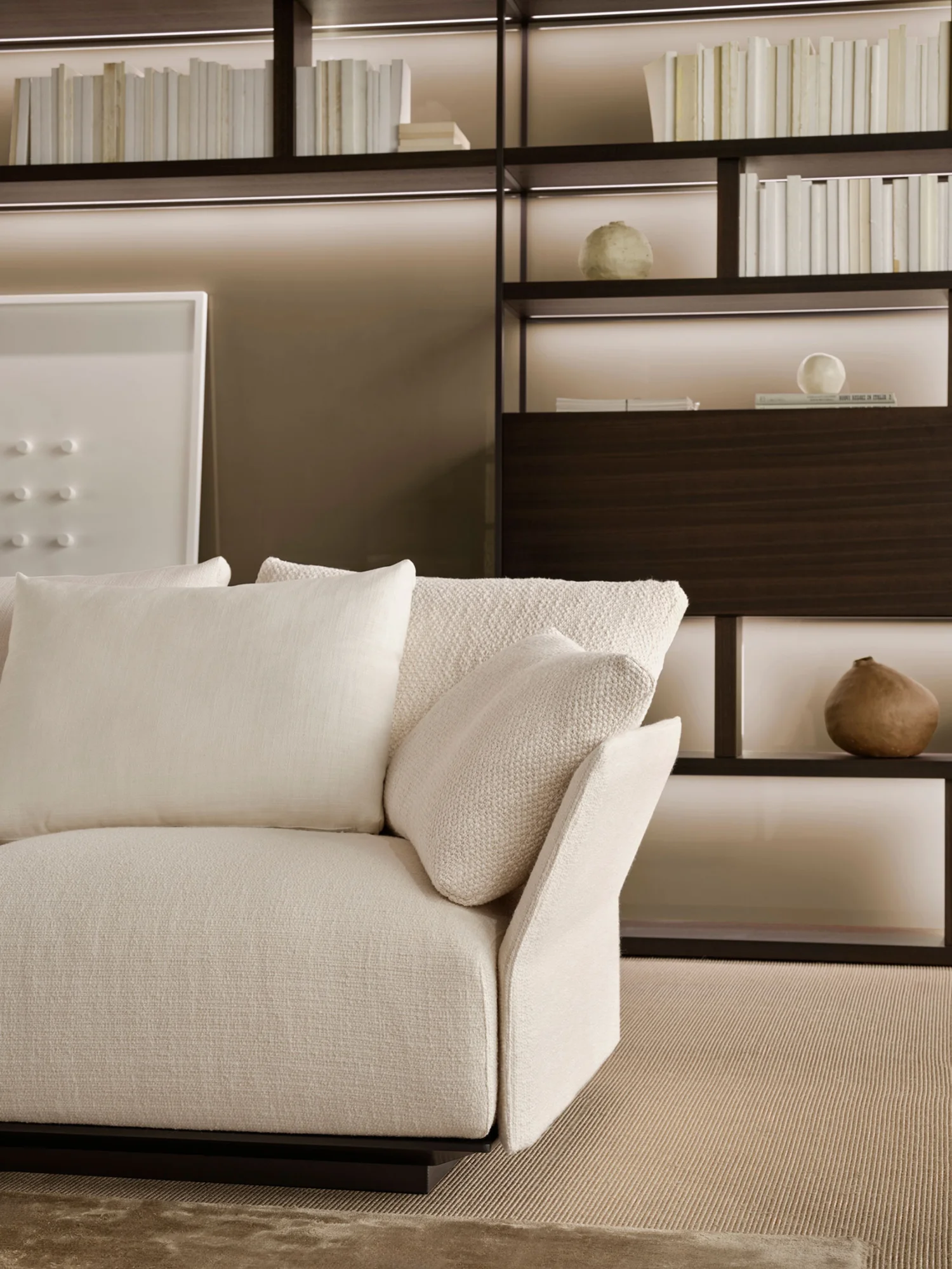 The sofa rests directly on the floor with a solid base — available in upholstered or lacquered versions — into which the distinctive wing-shaped backrests and armrests are set, clad in either fabric or leather. Slightly tilted backward, these elements define the profile with elegance and lightness, introducing a sense of openness and movement that enlivens the composition.