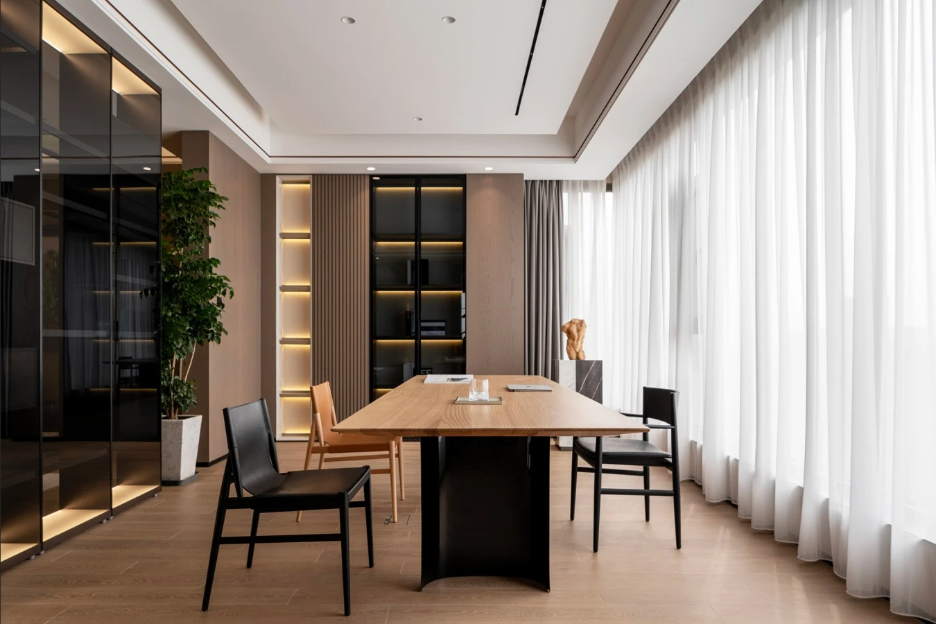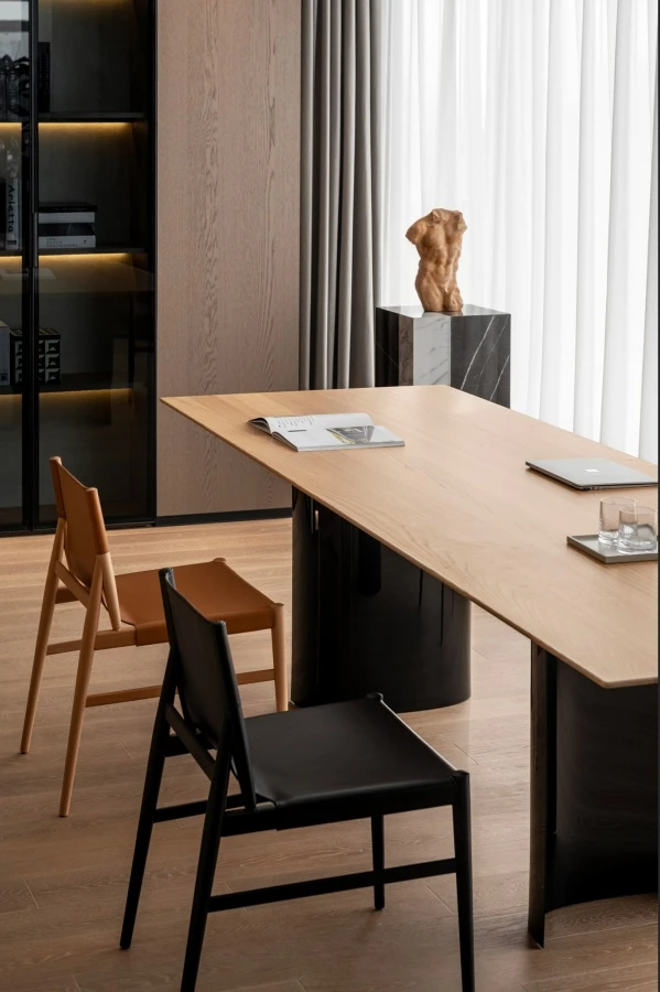 All’interno del duplex di 600 m² sue piani sovrapposti, progettato da Jacci Mayee, partner strategico di Porro nella città, lo studio sceglie la fascinazione e il potere espressivo del tavolo Jeff di Gabriele e Oscar Buratti, con piano in massello di castagno naturale che si caratterizza per la particolare lavorazione del bordo rastremato, che assicura slancio e leggerezza. Viene abbinato alle sedie Voyage di GamFratesi, con struttura in massello di acero naturale o tinto nero con rivestimento aderente in cuoio. Un luogo per leggere e pensare, dal design minimalista, dove immergersi nella semplicità e nella tranquillità e godersi il tempo per riflettere e rilassarsi, circondati dalla qualità del miglior design italiano.