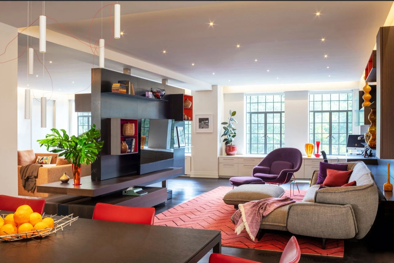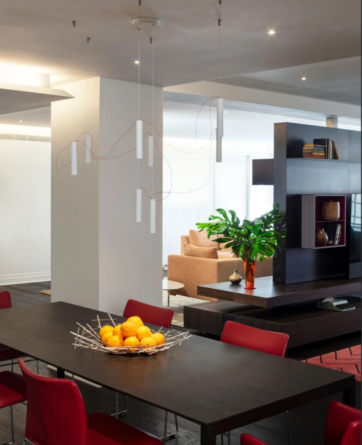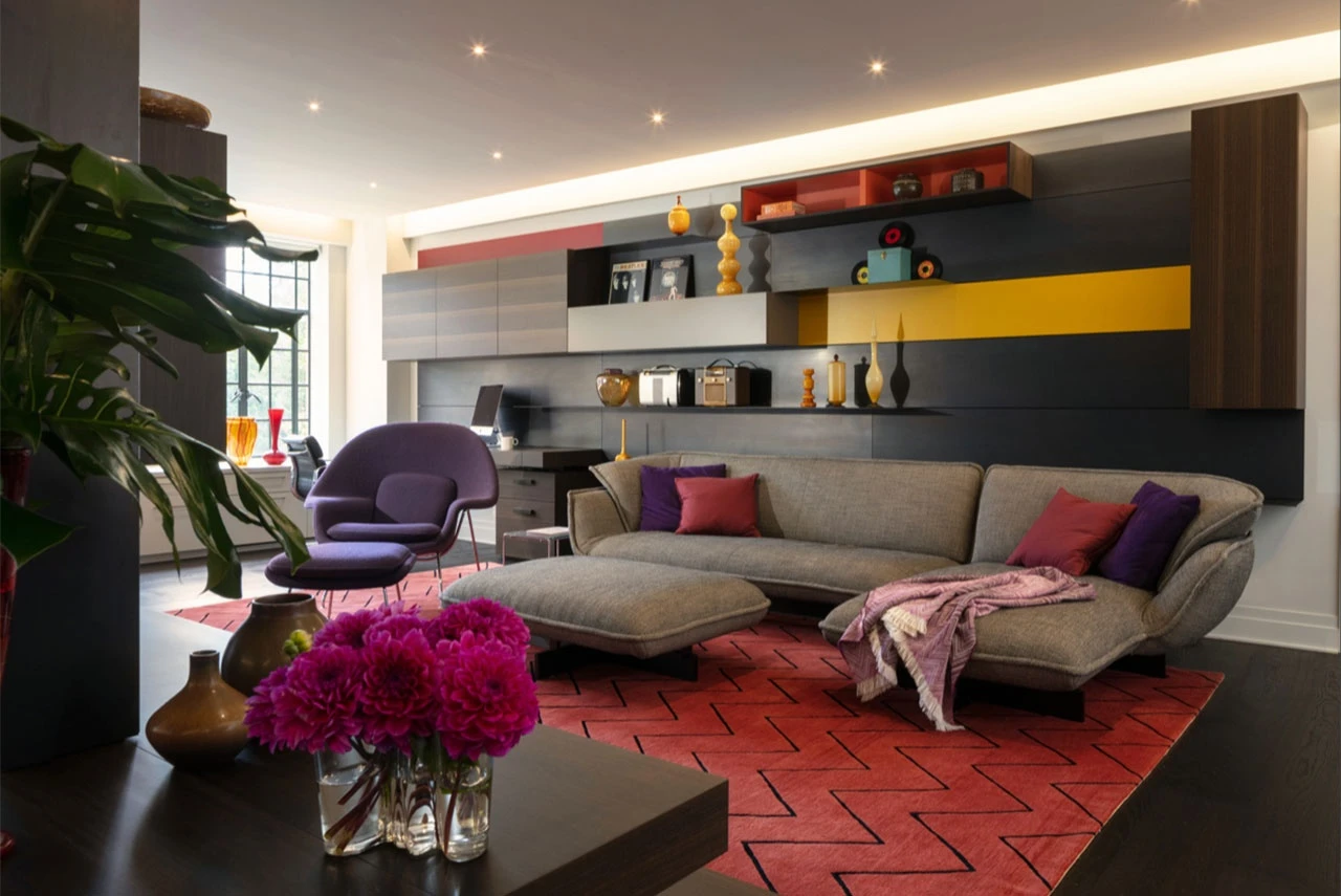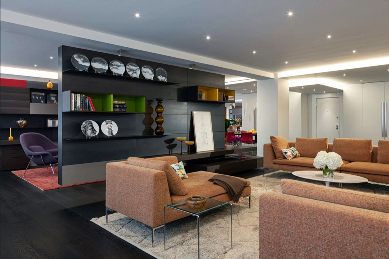La spazialità architettonica e la ricca palette materiali e colori del design Porro entrano nelle leggendarie Art Deco Twin Towers affacciate lungo Central Park West, grazie al progetto di interior design fuori dagli schemi nato dalla collaborazione tra lo showroom West | Out East, punto di riferimento del brand italiano nella Grande Mela, e il celebre studio di progettazione Stamberg Aferiat + Associates, guidato da Paul Aferiat e Peter Stamberg. Figure di spicco della scena culturale newyorkese, noti per le architetture e i progetti di interni dallo stile pop esuberante e ipercolorato, sono stati chiamati da una coppia di committenti a ristrutturare il loro appartamento dopo la partenza del figlio minore per il college: l’occasione per intraprendere una direzione decisamente poco conservativa e regalare una boccata di aria fresca ai loro spazi di vita, abbattendo dei muri per creare un open space di carattere. Scandisce la zona living dedicata al relax e alla vita conviviale, abitata da pezzi iconici del design italiano, un totem centrale firmato Porro dove un classico come la libreria Load-It di Wolfgang Tolk si mixa con elementi pensili e basi sospese del sistema Modern di Piero Lissoni. Grazie alle ampie possibilità di personalizzazione offerte dal brand, il progetto realizza un prodotto unico completamente customizzato, in un tripudio di essenze, materiali e colori. Il sistema Modern, il primo sistema sospeso nato da un modulo quadrato, con una composizione pensile alternante vani aperti a contenitori chiusi, si integra perfettamente con la libreria Load-It dalle mensole sottili che fluttuano nell’aria, andando a creare una vera e propria architettura all’interno di uno spazio, a cui fa eco un’ulteriore composizione Modern+Load-It sulla parete retro divano. Un gioco visivo in cui si intrecciano materiali e colori, passando dall’acciaio dei pannelli a muro e delle mensole di Load-It al laccato acceso degli interni del Modern, amaranto, arancio fiamma, verde spring, giallo zolfo, tortora, fino alla calda essenza lignea dell’eucalipto: un insieme di segni nitidi ed essenziali definiti dal rigore delle forme, dal pregio delle finiture e dalla funzionalità, per offrire versatilità e un tocco di vivacità alla vita di tutti i giorni.