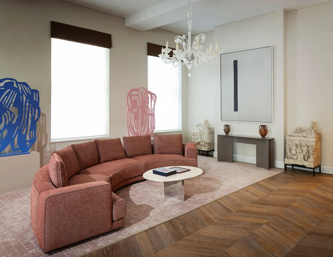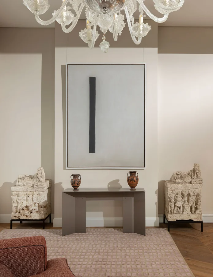 Nella sala d’attesa, la console Origata in finitura grigio porfido sprigiona la sua armonia, dialogando con la tempera su tela “Presenza” di Arturo Vermi e creando un ambiente meditativo e misurato. Pur nella sua essenza contemporanea, la console si accorda con naturalezza alle opere del passato, instaurando un dialogo che supera il tempo sia con il candeliere in vetro di Murano che con le urne cinerarie in travertino adiacenti e le anfore antiche in ceramica attica a figure nere, provenienti dal Museo Nazionale Etrusco di Villa Giulia.