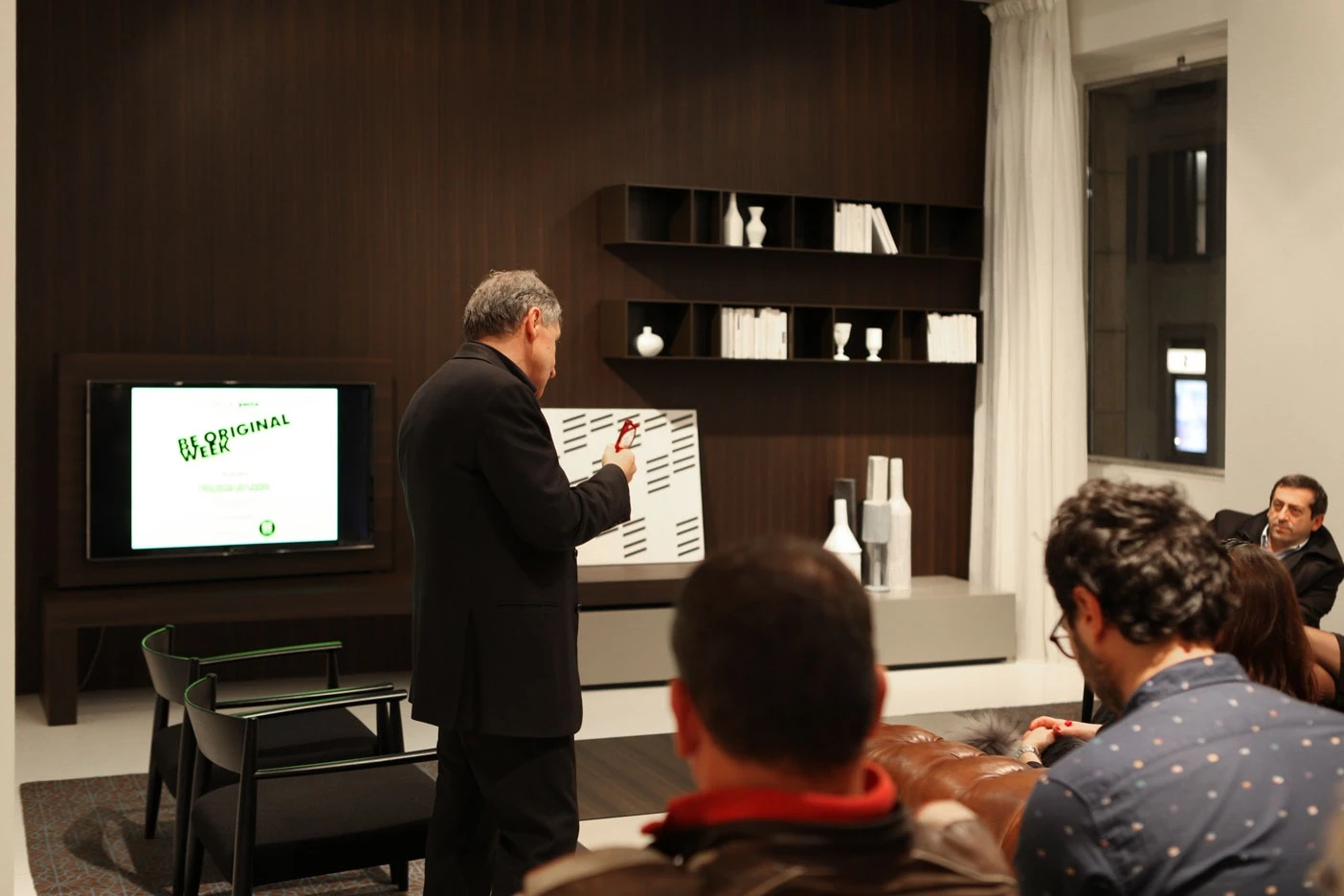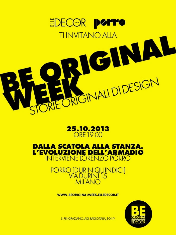 L’appuntamento era inserito nel ciclo di eventi dedicati alle storie di design originali proposti durante la BE ORIGINAL WEEK promossa da Elle Decor Italia; gli incontri, tenuti da designer e imprenditori di fama internazionale, si sono svolti tutte le sere all’interno de la Rinascente e negli store BE ORIGINAL delle aziende partner all’iniziativa.