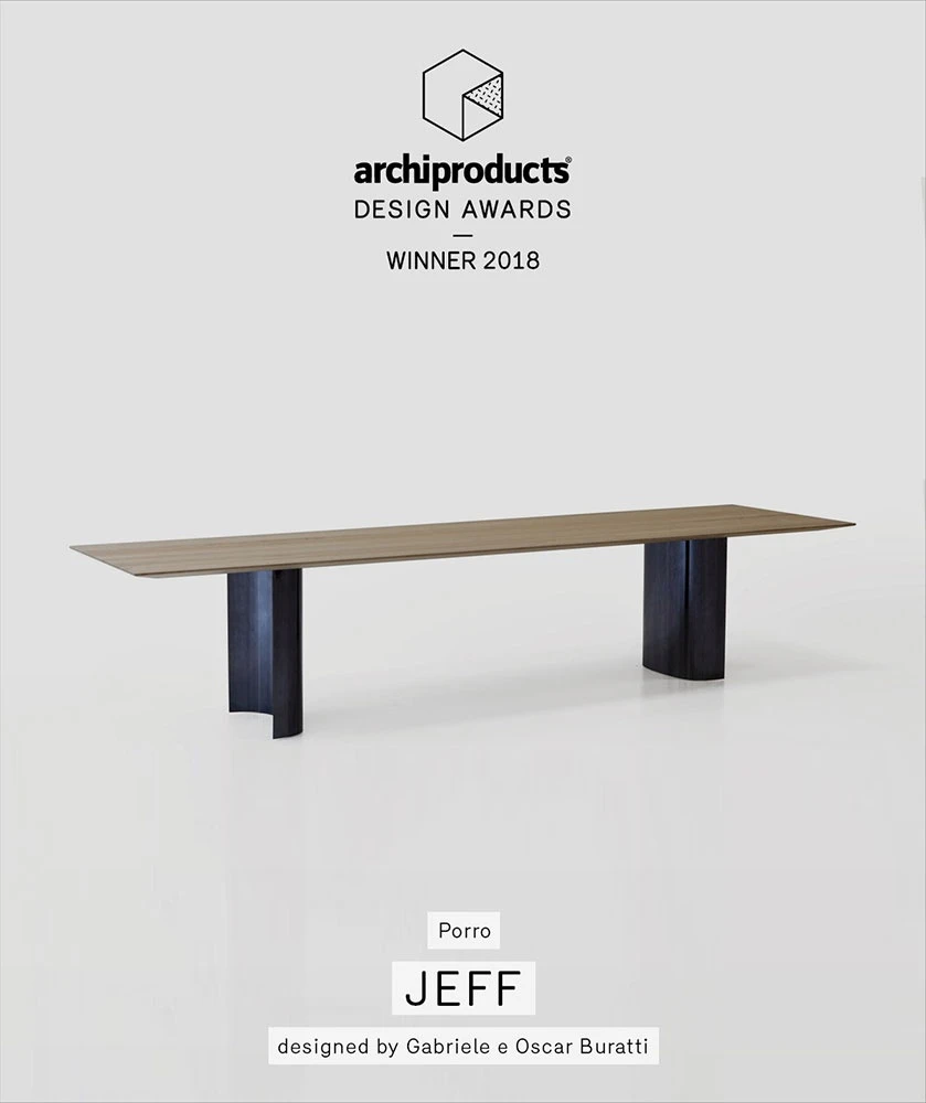 Per il secondo anno consecutivo, il valore del design Porro viene riconosciuto in occasione degli Archiproducts Design Award 2018, con una menzione nella categoria Furniture per il tavolo JEFF di Gabriele e Oscar Buratti. Congratulazioni ancora a tutto lo staff per la dedizione e il continuo impegno verso soluzioni tecnologiche avanzate in una forma semplice e elegante.