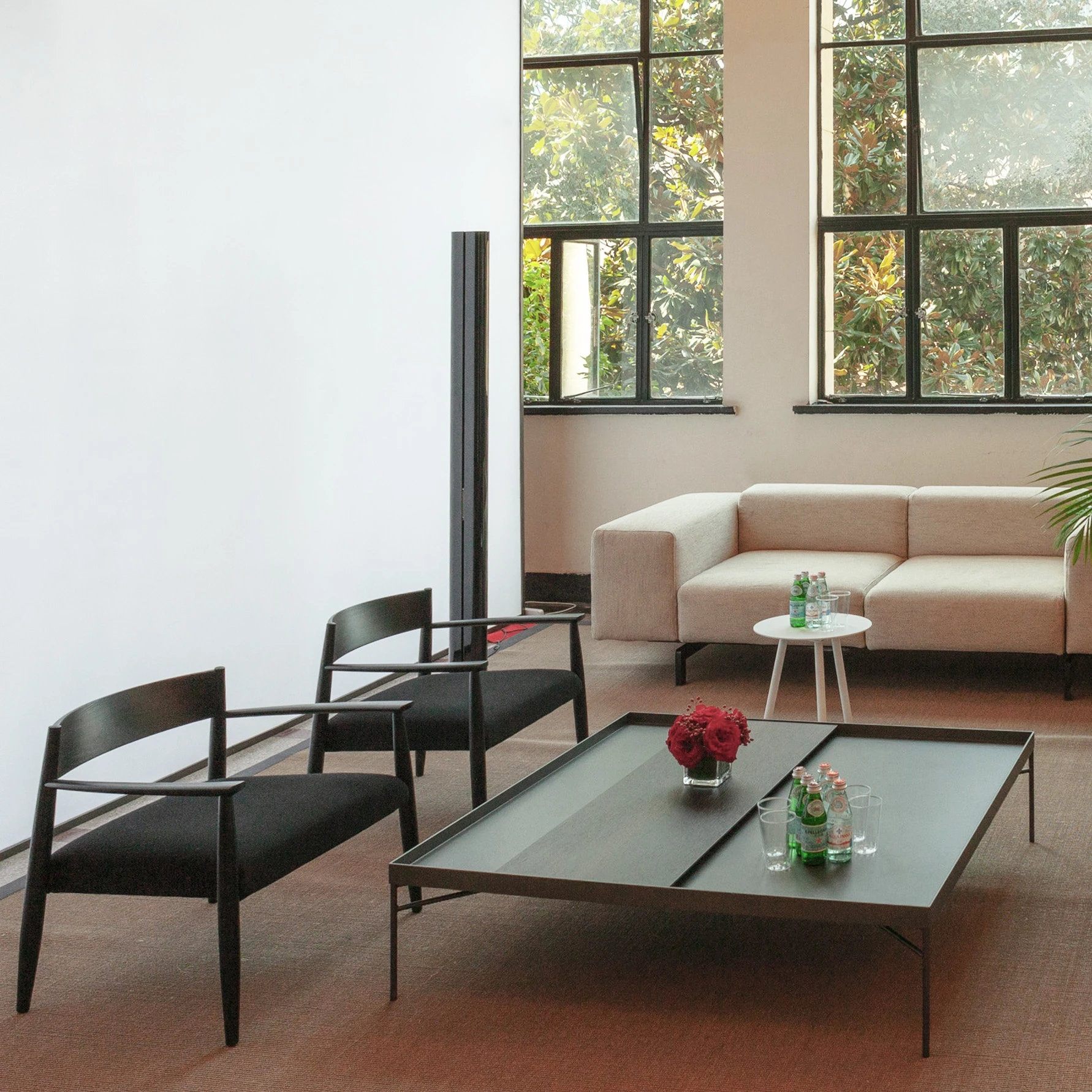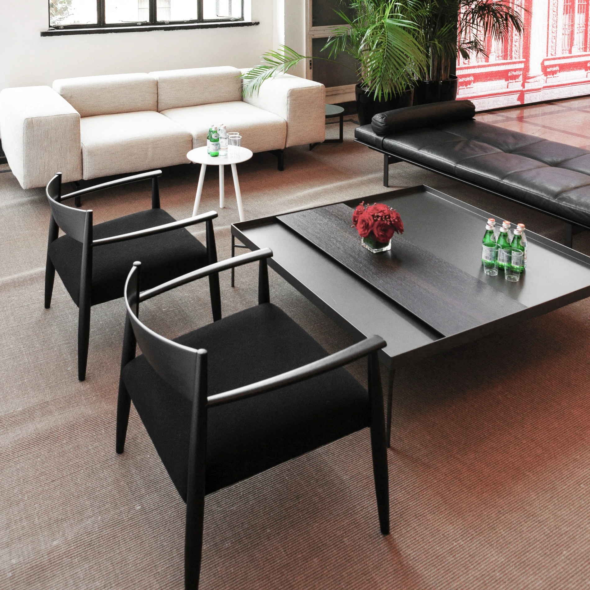 2 poltrone basse Ghiaccio, 2 sedie Neve e 2 sedie Voyage, scelte nella variante nera, accolgono i visitatori con il loro look elegante e i materiali preziosi.