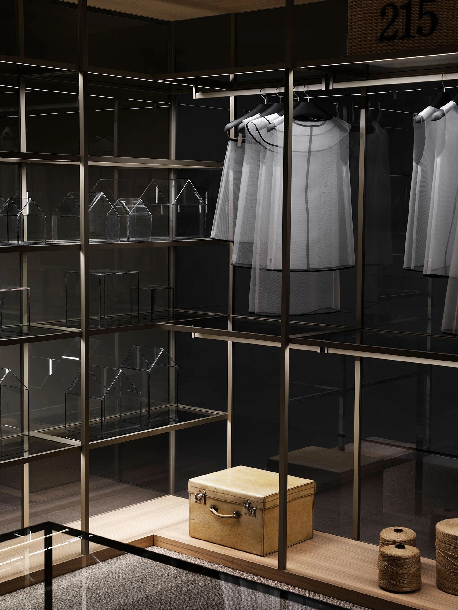 Protagonista principale degli scenari Porro, biglietto da visita del brand e quintessenza delle sue capacità di personalizzazione, il sistema di armadi e cabine Storage design Piero Lissoni + CRS Porro mostra il nuovo profilo 25x25mm, che permette la libera alternanza di vani aperti o racchiusi da ante: una leggerezza visiva ulteriormente esaltata dalla soluzione d’angolo trasparente. Abbinati alla struttura metallica verniciata nera, impreziosiscono Storage gli interni in black sugi, finitura avvolgente estremamente sofisticata: superfici opache nero-inchiostro dalle venature marcate, ispirate all’antica tecnica giapponese del Sou Sugi Ban che proteggeva il legno di cedro bruciandolo con il carbone. La luce integrata nel ripiano accentua il grafismo di Storage e ne segue le linee, trasformandolo in un palcoscenico per i propri indumenti. Grazie al sistema di illuminazione senza cavi, la corrente elettrica viene trasmessa all’interno della struttura, nascosta alla vista. Con tutti dettagli tecnici disegnati da Porro e completamente integrati, i ripiani diventano corpi illuminanti con luce regolabile scegliendo 2 diverse temperature.