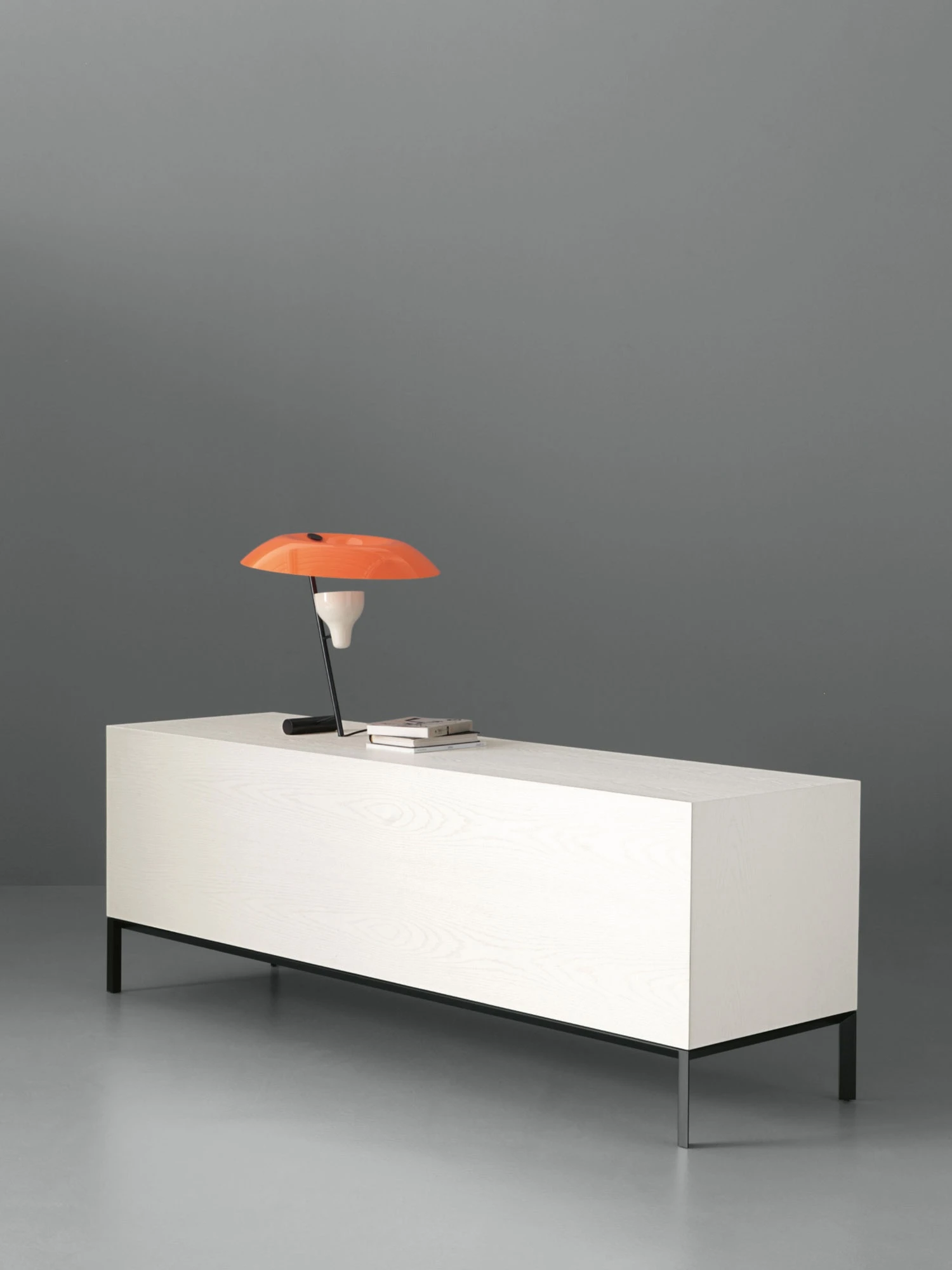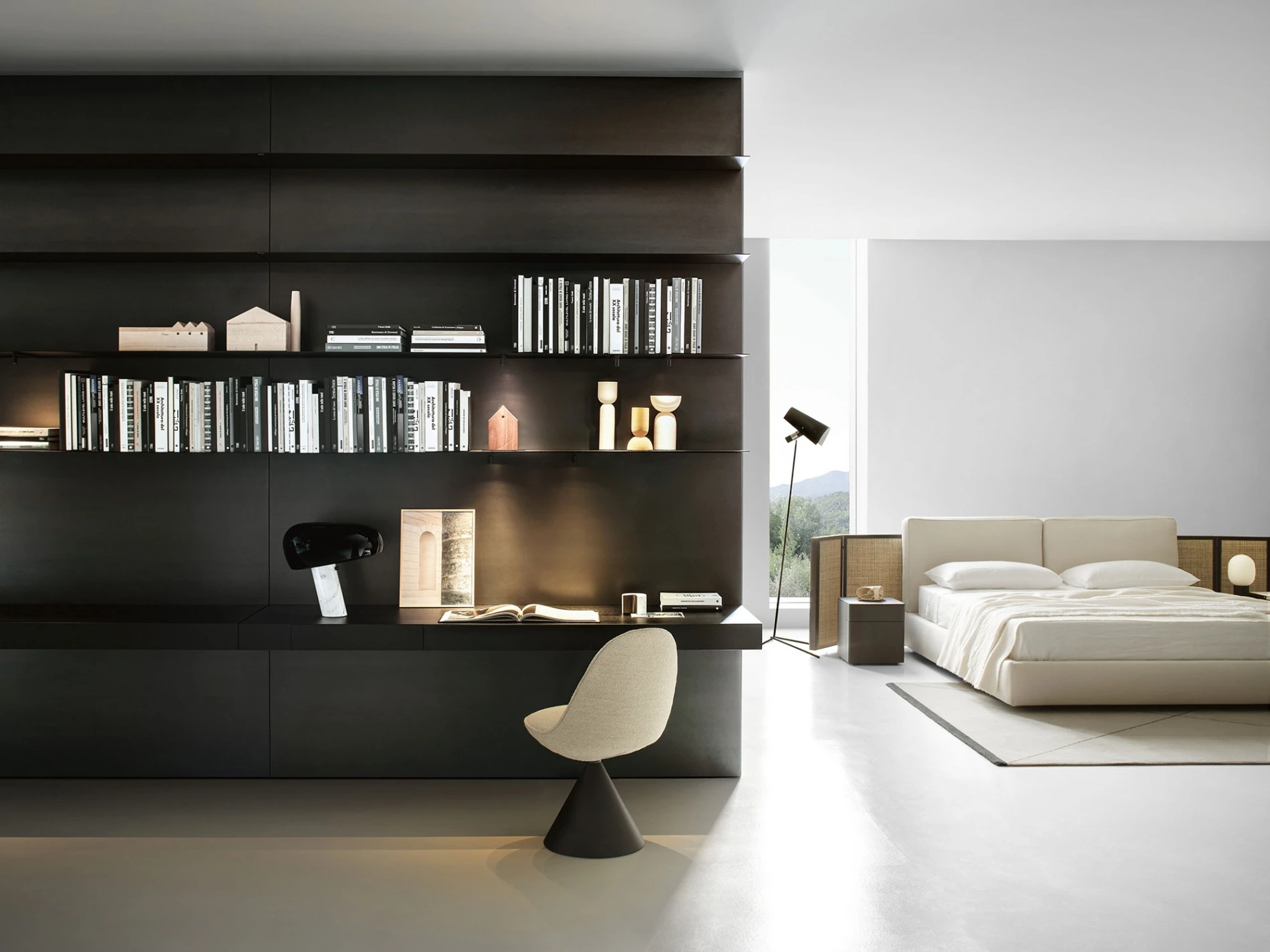 Nell’angolo lettura la poltroncina Lullaby disegnata da Nicola Gallizia dai dettagli sofisticati come la struttura in legno massello curvato di frassino tinto nero e il rivestimento aderente in panno color mattone, si abbina alla cassettiera Offshore di Piero Lissoni con esterni in frassino verniciato a poro aperto bianco moon. I cassetti, in multistrato di betulla placcato con acero naturale, sono attrezzati con guida a doppia estrazione per un’apertura confortevole e completa. Grazie alla particolare connessione a 45° tra piano, fianchi e top, esito di un processo di lavorazione accurato, Offshore è un volume perfettamente rifinito su tutti i lati, posizionabile a centrostanza.