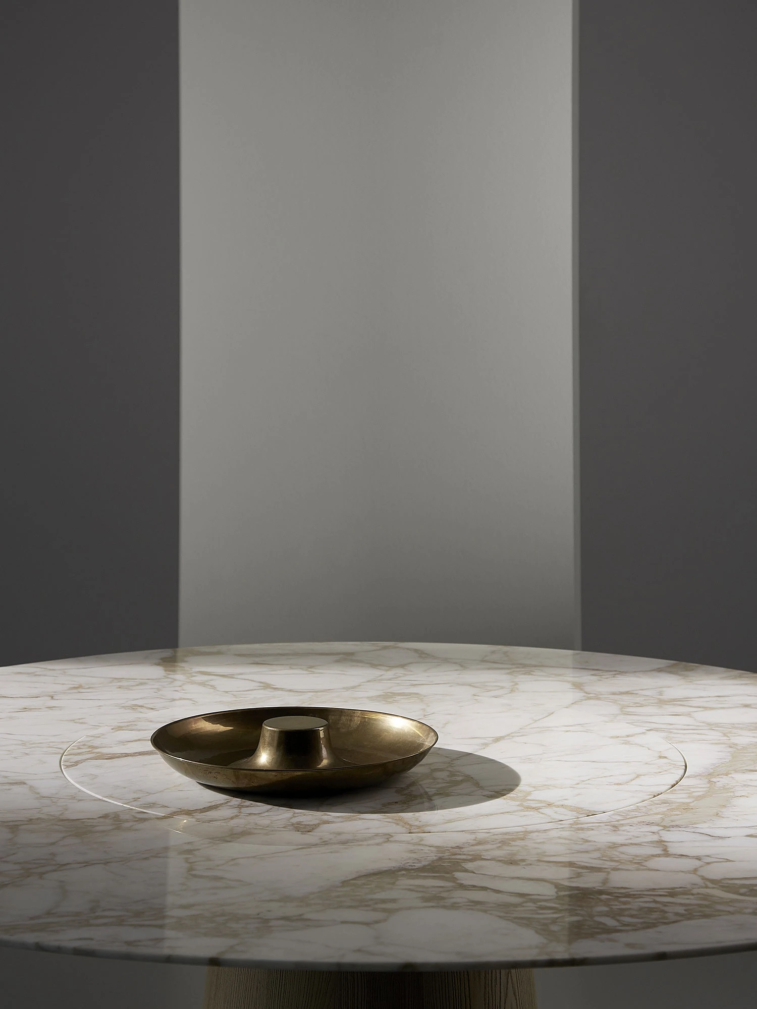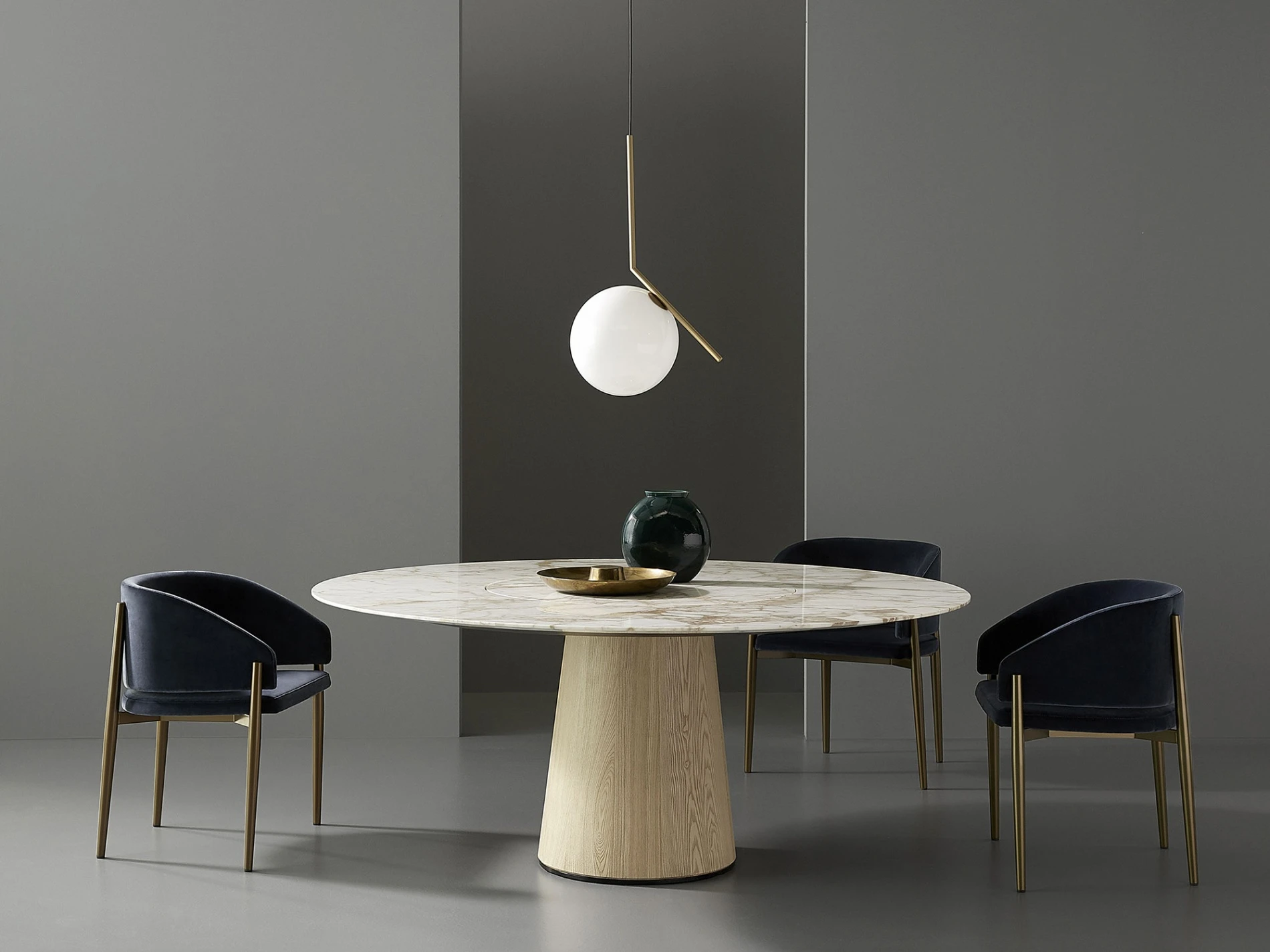 Nella sala da pranzo utilizzabile anche come sala riunioni, la ricerca continua di Porro su materiali, manifatture e forme che danno emozioni verte ancora una volta intorno a Materic, il progetto di tavolo ideato nel 2017 da Piero Lissoni con l’idea di sperimentare in geometrie elementari la versatilità della materia. Proposto con piano circolare rastremato in marmo, appoggiato su una base a tronco di cono in massello di frassino naturale, dialoga con le poltroncine Romby di GamFratesi, dal fascino astratto. La base a tronco di cono in legno massello di frassino naturale, la cui forma svasata viene realizzata a spicchi in un esercizio di ebanesteria, si connette ad una seduta girevole imbottita, soffice e compatta, rivestita in tessuto o pelle. Un progetto che entra perfettamente nell’universo Porro, da sempre caratterizzato da linee minimali e grande artigianalità.
