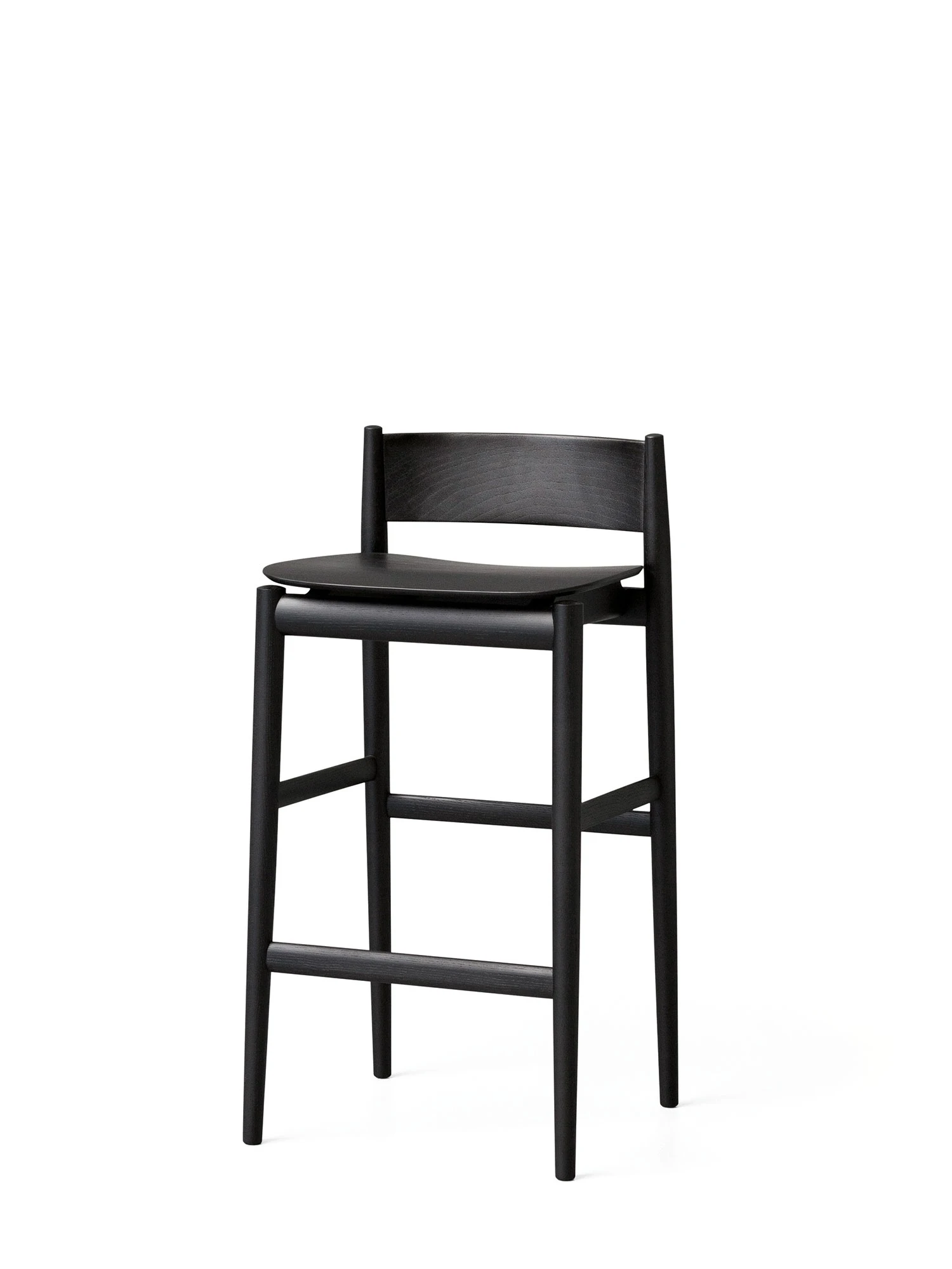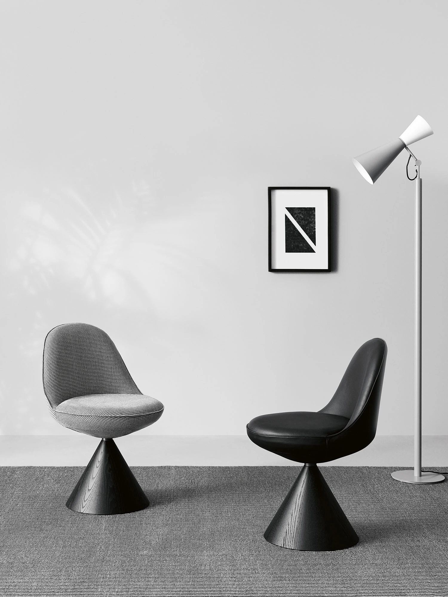 La accompagna lo sgabello Brina, nato come declinazione alta della sedia Neve di Piero Lissoni, disponibile in due altezze; le gambe affusolate leggermente inclinate, lo schienale basso curvato e la seduta sospesa in massello di frassino tinto nero sprigionano il savoir-faire di Porro nella lavorazione del legno.