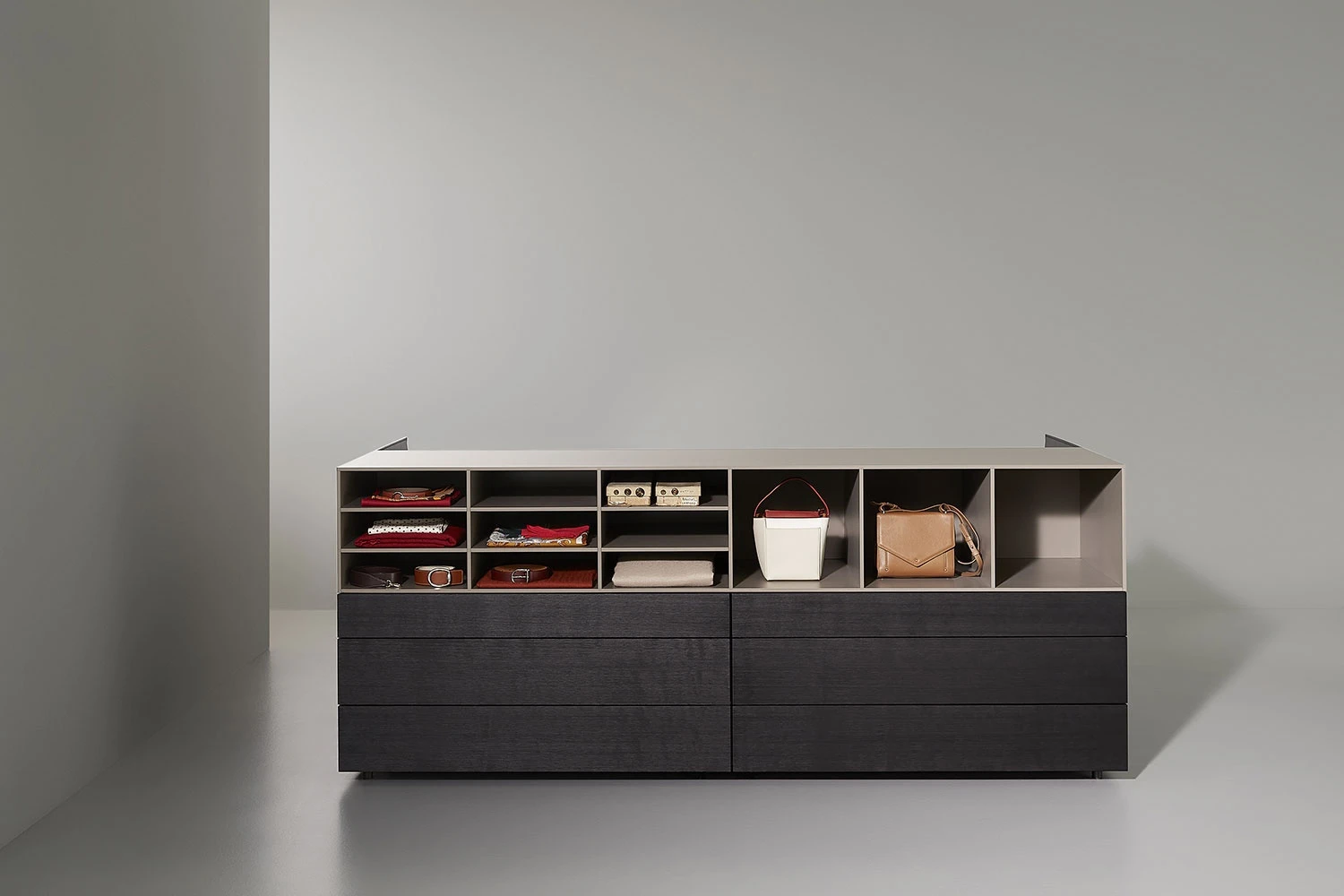 Nella versione con morbida panca in cuoio, o con moduli a giorno e ripiano svuotatasche in cuoio, l'isola centrale Hub si compone di eleganti strutture dove il legno si integra ad altri materiali per rispondere alle esigenze funzionali ed estetiche di una camera da letto, di una dressing room o di una boutique di lusso. Completa la personalizzazione la possibilità di variare il materiale del top di copertura, per soluzioni tono su tono o a contrasto.