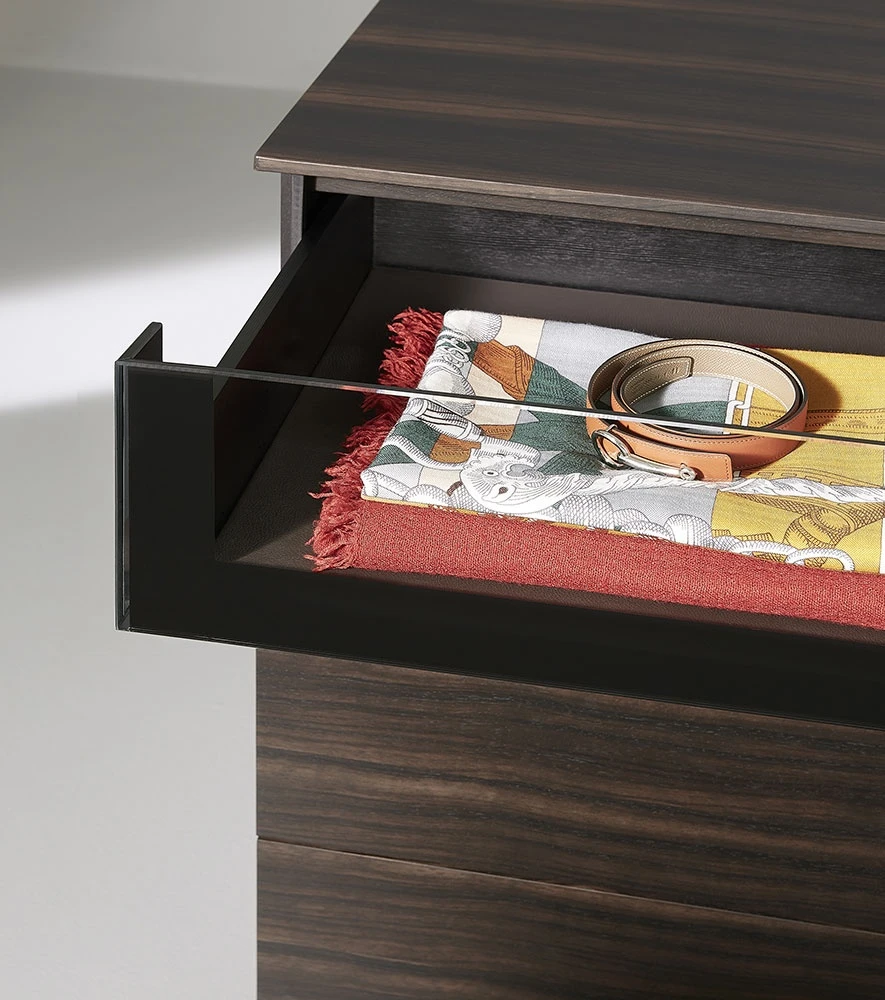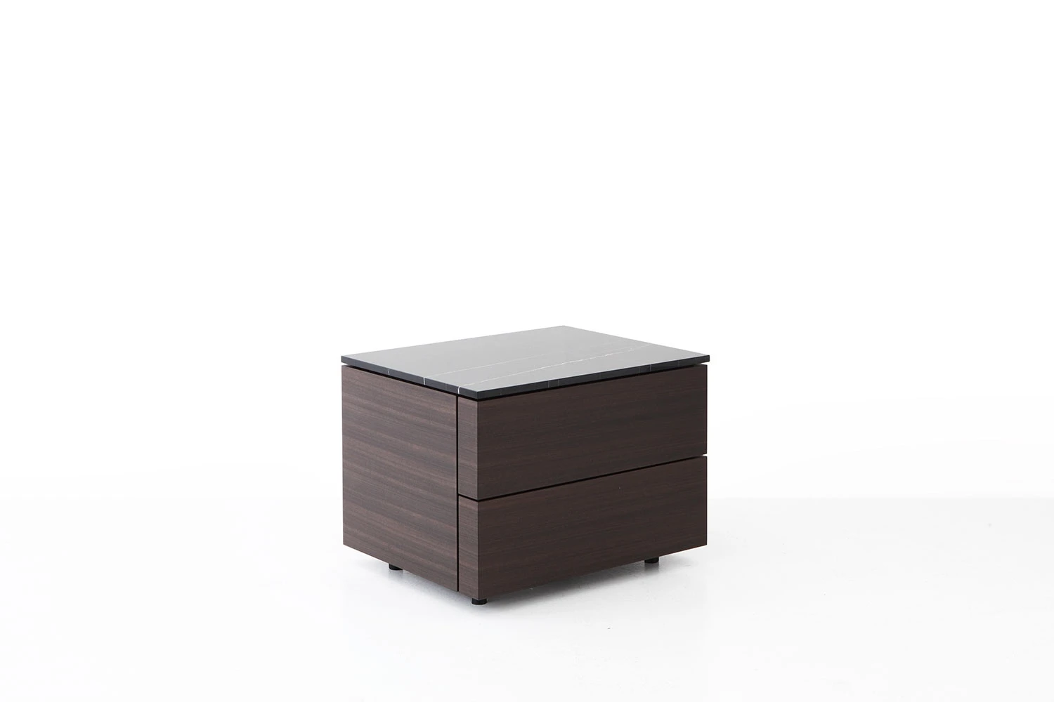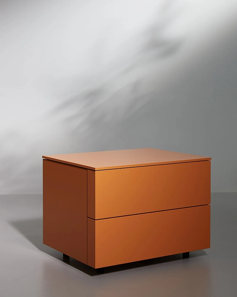 L'ampia gamma di finiture garantisce la personalizzazione anche del comodino HUB: è infatti possibile scegliere tra 18 legni e 24 colori opachi per la struttura, poi rifinita con un piano di copertura disponibile in 18 legni, 24 colori opachi ma anche in 10 tonalità di cuoio o in 6 pregiati marmi.
