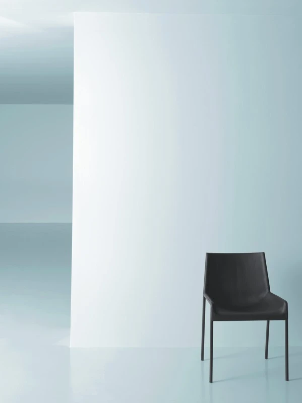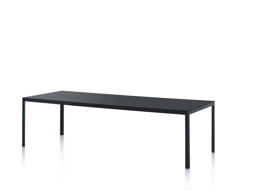 Contrasto lucido/opaco, spessore minimo e bordi arrotondati sono i tratti caratterizzanti del nuovo tavolo componibile di Piero Lissoni, accanto al quale vive la nuova variante total black della poltroncina H.chair di Christophe Pillet, con seduta in pelle e struttura in metallo verniciato nero opaco.