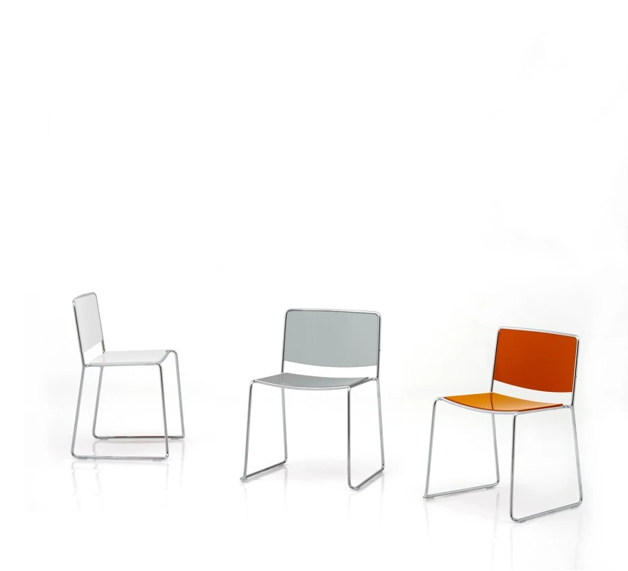 1:bambino della seduta Spindle, icona di leggerezza e semplicità, e 2 librerie Endless Plastic nella vivace colorazione blu con giunti e piedi in alluminio.