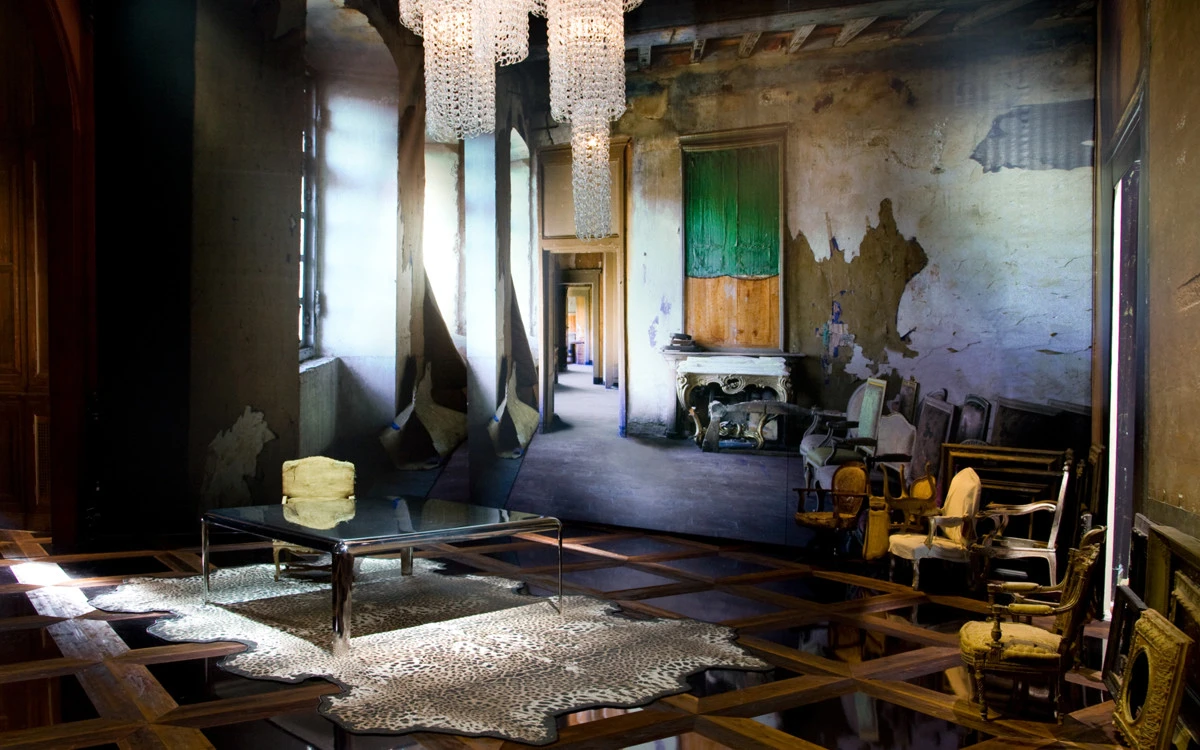 Nello scenografico stage, un accattivante mix di suggestioni dove impera lo stile vittoriano, reinterpretato in chiave glam-pop, tra un lampadario in cristallo, un tappeto maculato e sedute d’epoca troneggia il tavolo Ferro in acciao inox, sorprendente creazione di Piero Lissoni per Porro, che proietta in passerella i suoi riflessi argentati.