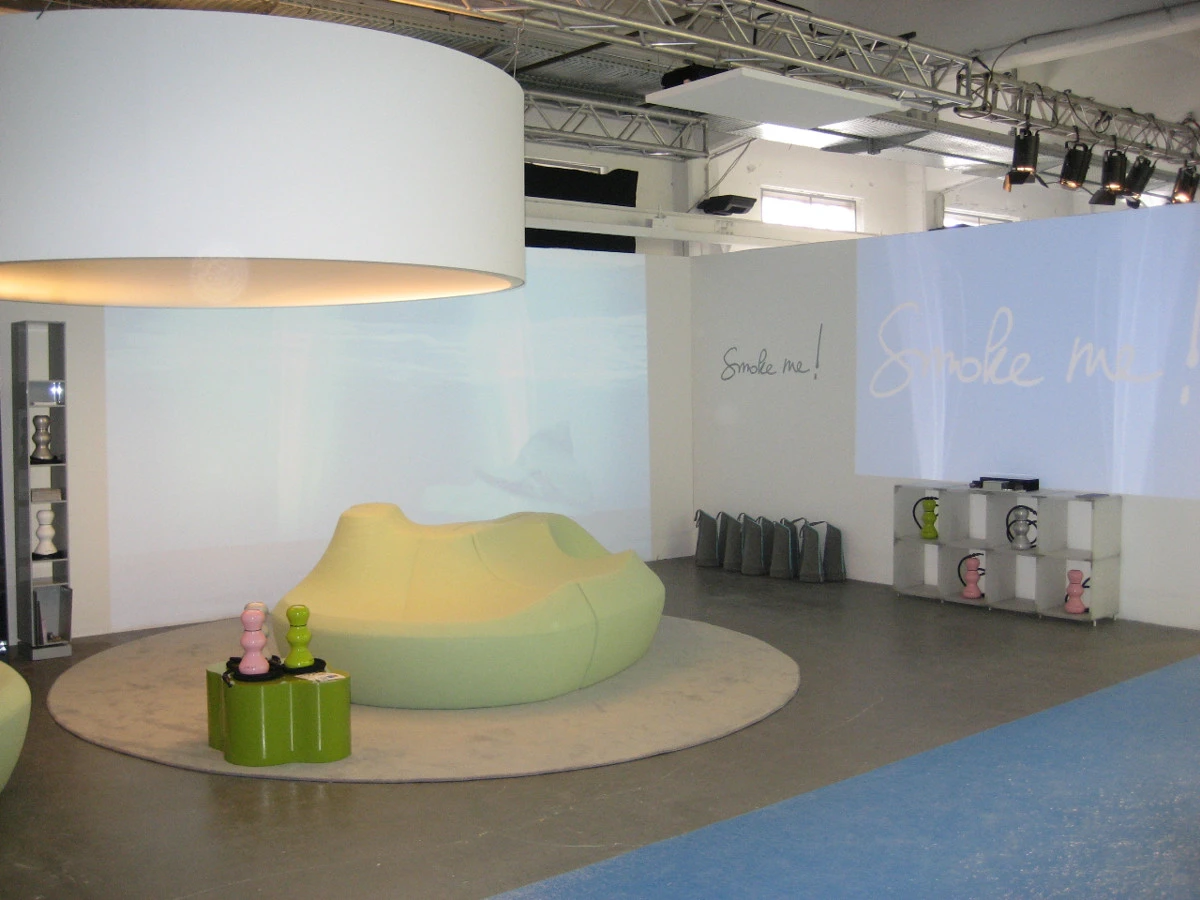 Negli spazi di Superstudiopiù in via Tortona 54, 2 tavolini Nuvola color verde spring, una libreria Endless Plastic in plastica naturale e 3 librerie verticali Sidewall verde spring, azzurro polvere e blu storm, hanno ospitato una divertente collezione disegnata da grandi firme del design, destinata a rendere il Narghilé un oggetto cosmopolita e universale.