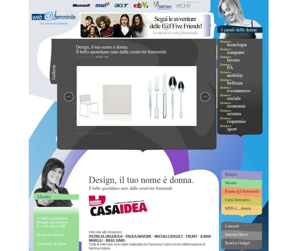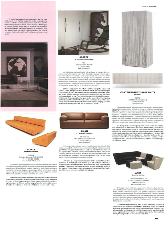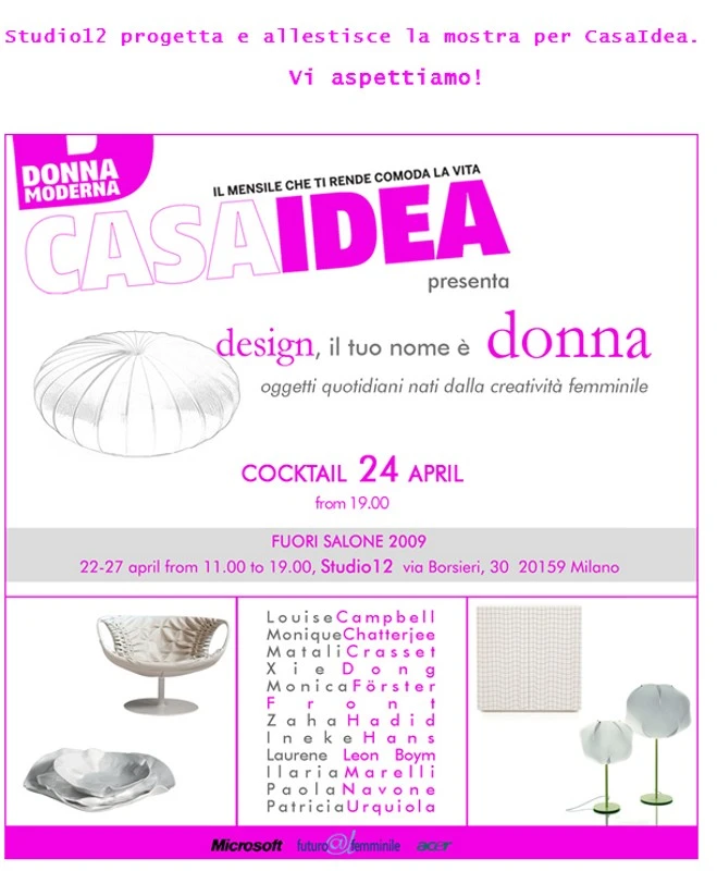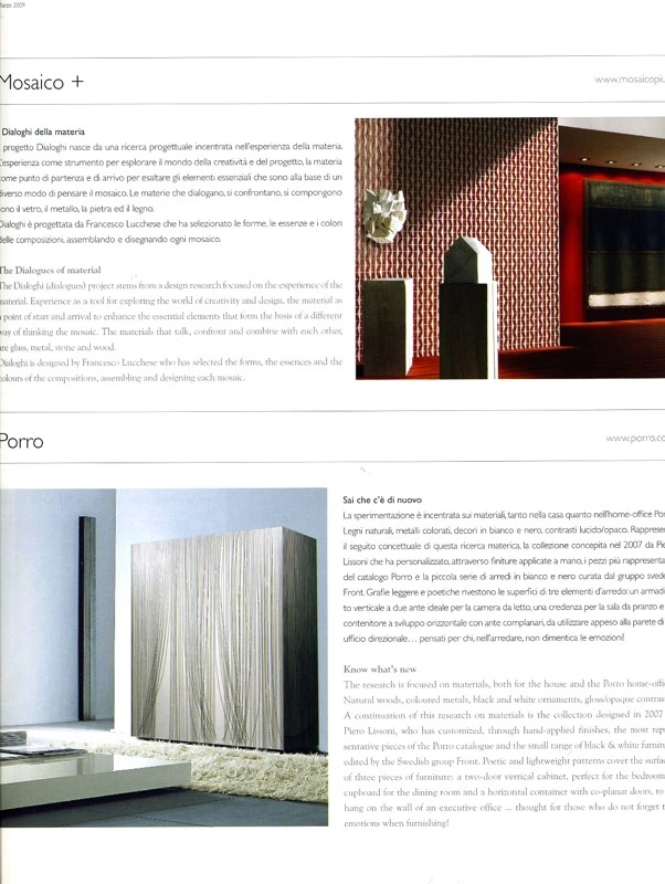 Già individuata dalla stampa tra le più interessanti proposte del 2009, sarà visibile presso lo showroom Porro di via Durini 15 a Milano, in fiera al PAD. 7 STAND D15 - E18, e nella mostra " Design, il tuo nome è donna. Il bello quotidiano nato dalla creatività femminile" organizzata da Donna Moderna in collaborazione con Microsoft e dedicata alle presenze femminili nel mondo del design, presso la location STUDIO12 di Via Borsieri, 30 dal 22 al 27 Aprile 2009.