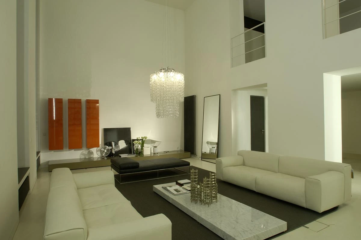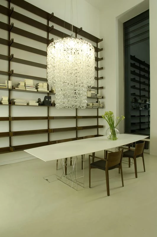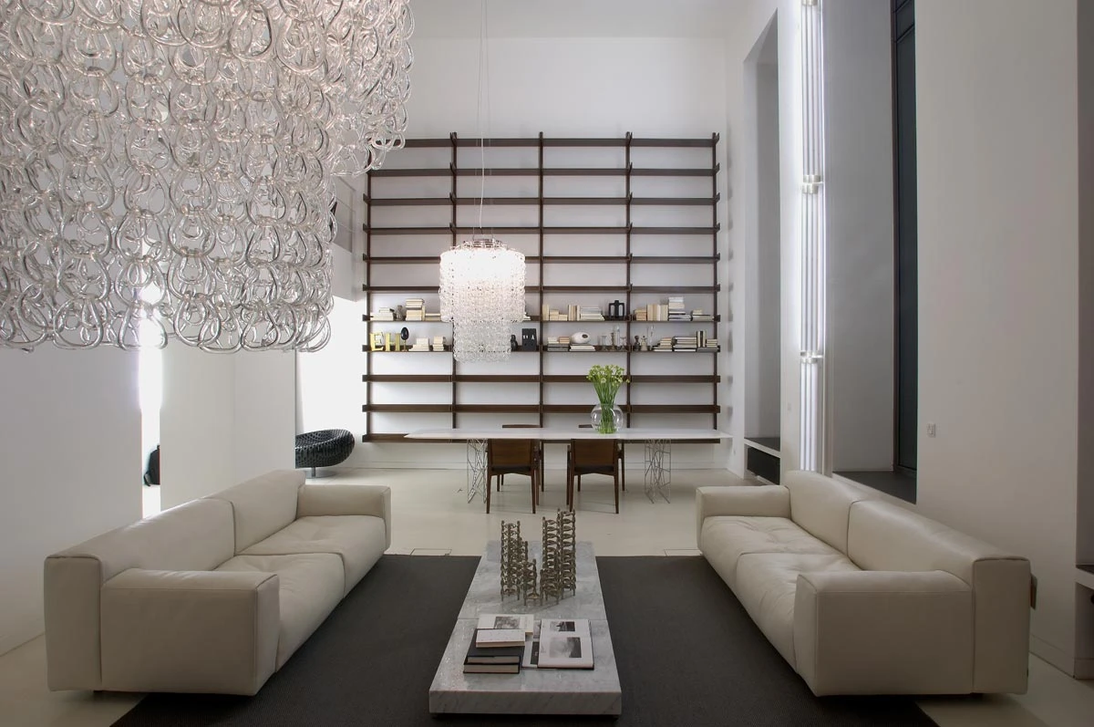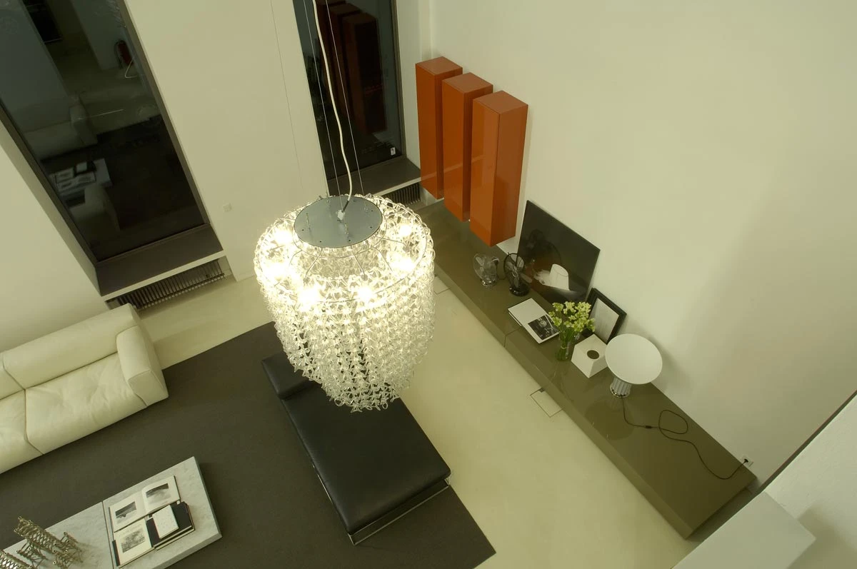 Illuminano scenograficamente le diverse stanze della casa di Porro, le lampade P-light, una cascata di cristalli realizzati a mano e disponibili nella versione trasparente o, per un effetto ancora più particolare, verniciati di nero.