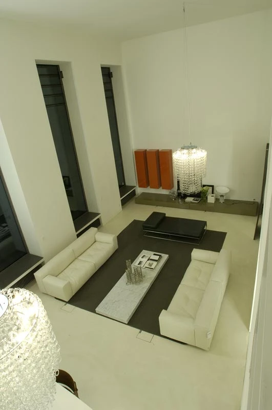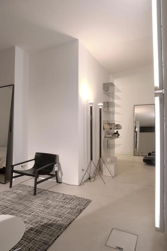 Entrando dall’ingresso principale, il percorso espositivo si snoda attraverso due ampie zone living, intervallate da un corridoio centrale.