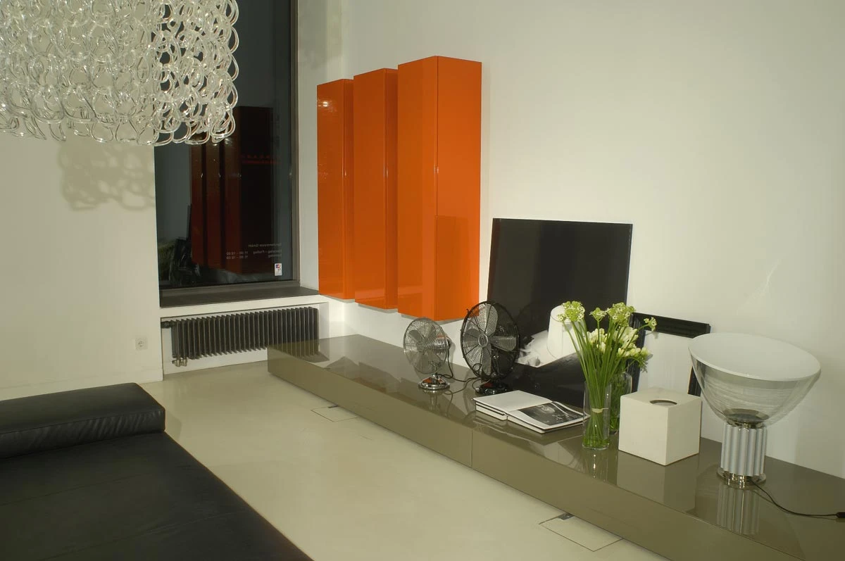 Per rendere ancora più netto ed evidente il gioco, Porro sceglie il colore. L’arancio marte dei pensili, che diventano una sorta di segno di riconoscimento dell’azienda, e il color fango per i vani chiusi a terra, vengono infatti accostati nelle vetrine del negozio affacciate su strada.