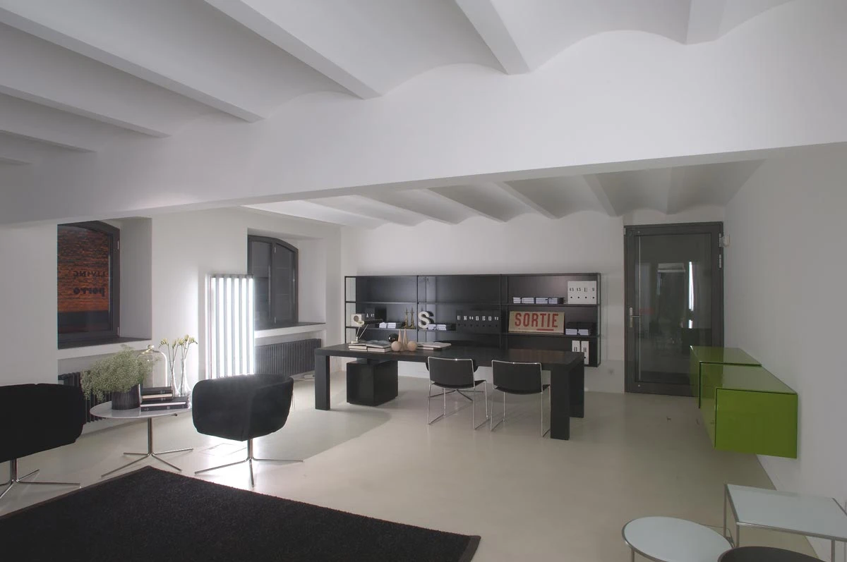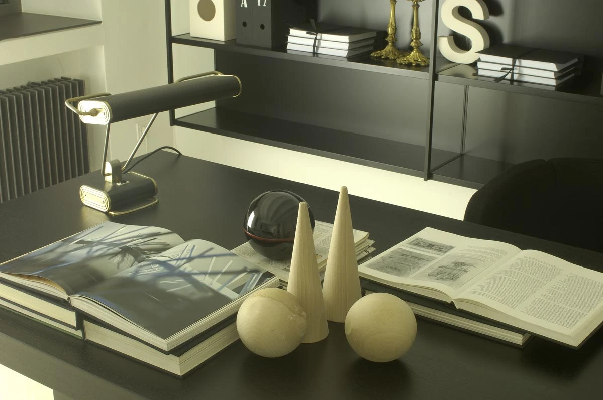 Sulla corte interna si apre invece una proposta direzionale, costruita accostando al tavolo P.04 in rovere carbone le sedie Spindle in pelle nera, un pensile HT work in alluminio anodizzato nero e una composizione Modern verde spring con ante scorrevoli.