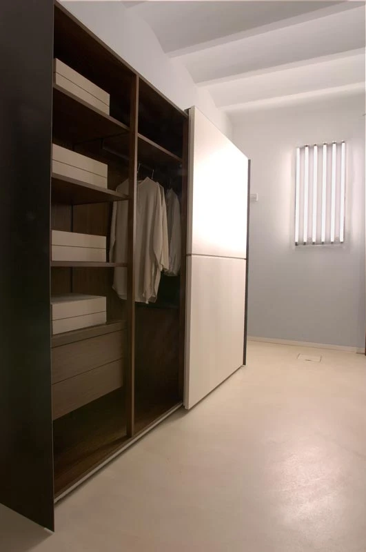 Se nella prima camera da letto l’armadio Storage viene declinato nell’elegante dicromia che contrappone la sensualità delle ante laccate bianco lucido al calore degli interni in essenza mongoi, nella seconda è presentata la cabina aperta, così ampia ed elegante da diventare essa stessa una stanza da abitare.