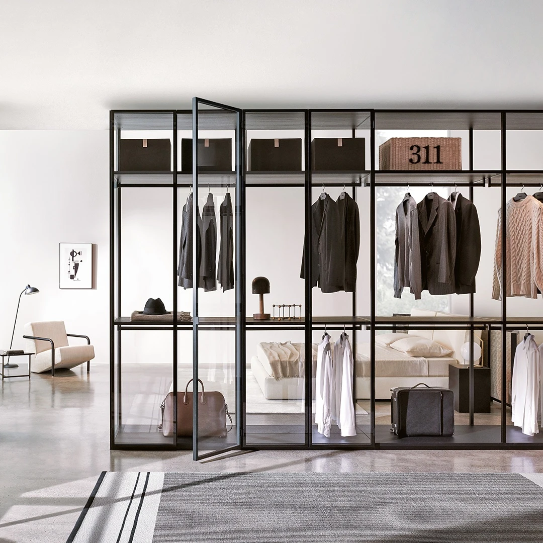 Il sistema di armadi Storage, disegnato da Piero Lissoni nel 2000 e in costante evoluzione, è stato scelto per arricchire l’allestimento di una zona notte. Luminoso e leggero, Storage è più di un semplice armadio: è una vera e propria architettura che disegna lo spazio. Viene scelto in Black Sugi, finitura avvolgente, estremamente sofisticata, allo stesso tempo antica e moderna. Abbinata alla struttura metallica verniciata nera e alle ante Iron in cristallo trasparente, offre una superficie opaca nero-inchiostro dalle venature marcate, è ispirato all’antica tecnica giapponese del Sou Sugi Ban che proteggeva il legno di cedro bruciandolo con il carbone. La luce integrata nel ripiano accentua il grafismo di Storage e ne segue le linee, trasformandolo in un palcoscenico per i propri indumenti.