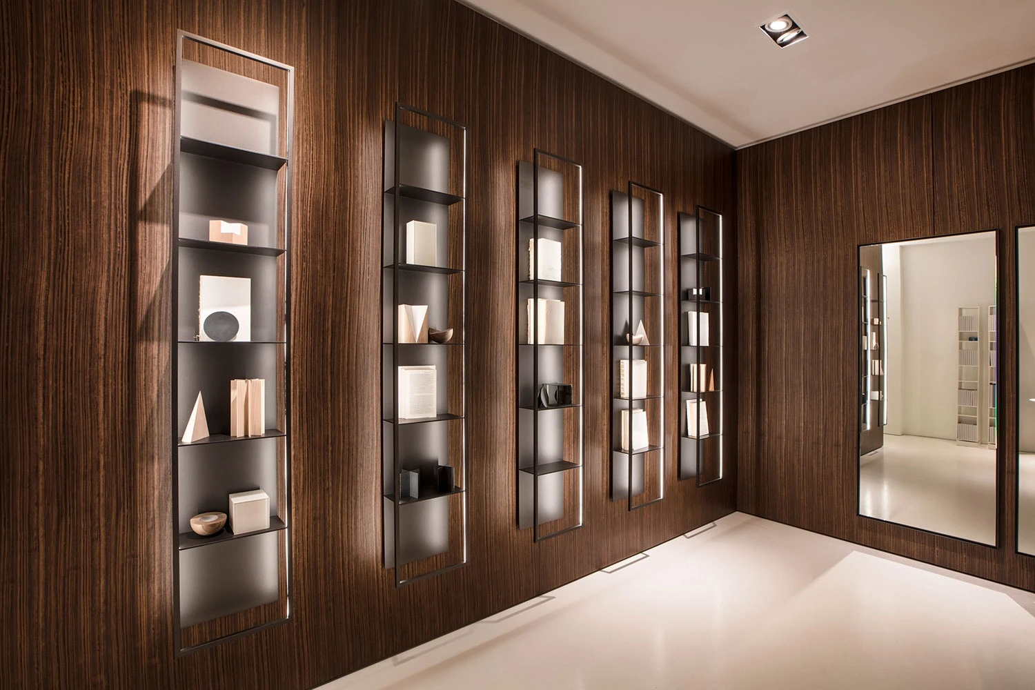 Con il suo inedito sguardo sugli oggetti quotidiani, Carlo Tamborini avvia la collaborazione con Porro con la libreria pensile Gap. Oggetto dalla vocazione scultorea, si compone di fondale, mensole e una cornice esterna in metallo: un segno estetico forte che funge contemporaneamente da fermalibro e da sorgente luminosa, grazie alla striscia di LED che percorre il suo perimetro. Libreria a sviluppo verticale ideale nelle aree di passaggio, dall’ingresso, al bagno, in cucina, e al contempo una soluzione preziosa per illuminare tutte le parti della casa in modo scenografico, scegliendo tra due le preziose finiture metalliche disponibili: rosso antico e grigio piombo.