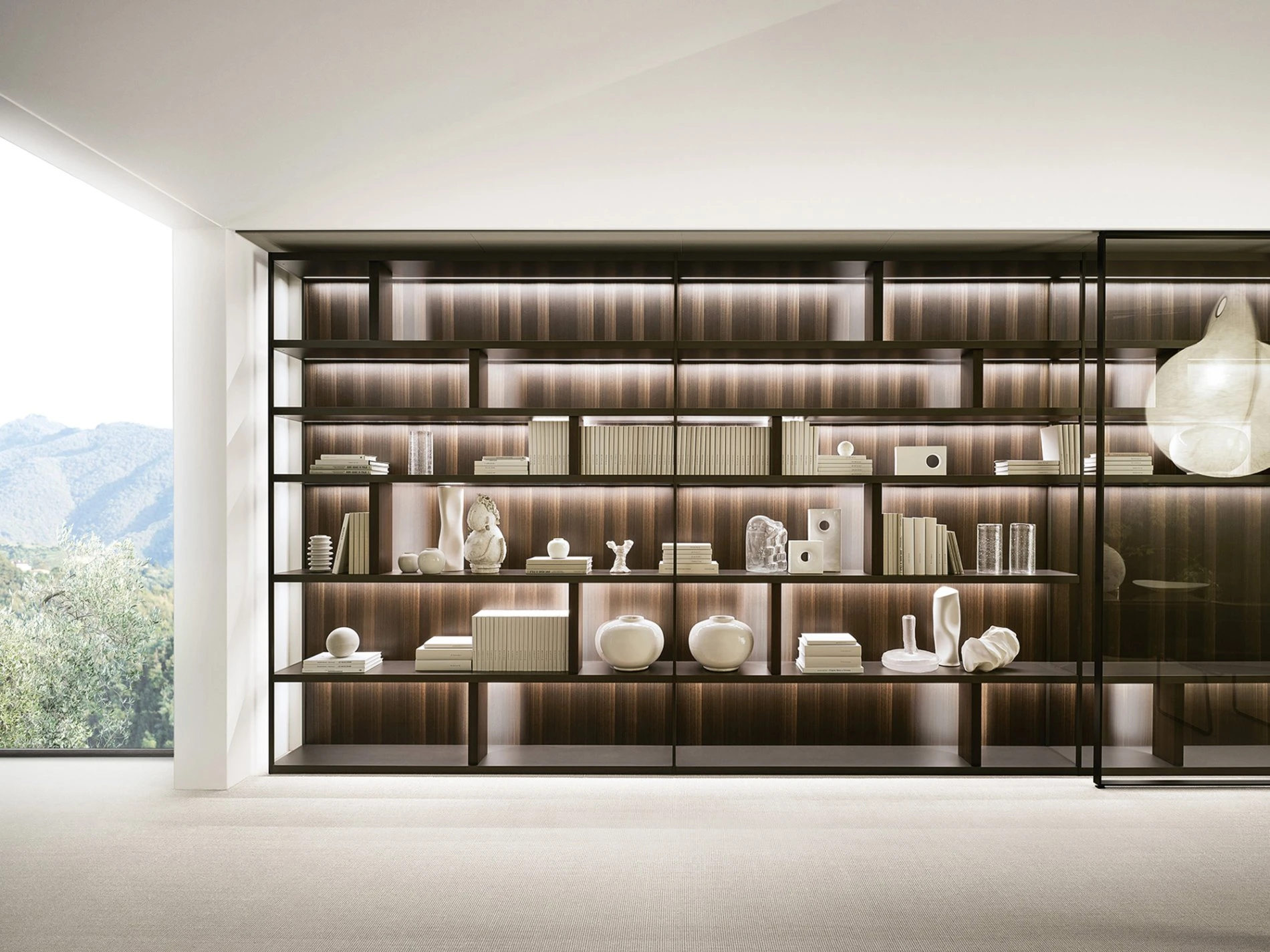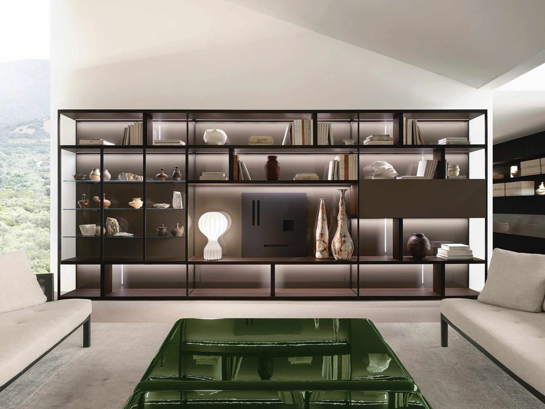 System, in collezione dal 1987, rivoluziona il proprio principio costruttivo grazie allo svuotamento della spalla portante, che diventa un montante sottile da 15 x 25 mm di sezione. La protagonista è la parete di fondo, che crea un vero e proprio arazzo a parete, anche grazie alla finitura scelta. La superficie in noce canaletto mix viene abbinata a lunghe mensole con spessore 40 mm metallizzato moka, montanti moka, elemento pensile laccato fango lucido, vetrina trasparente e un gioco di divisori verticali in legno in essenza noce canaletto, coniugando le 3 funzioni di vetrina, libreria e contenitore per il living.