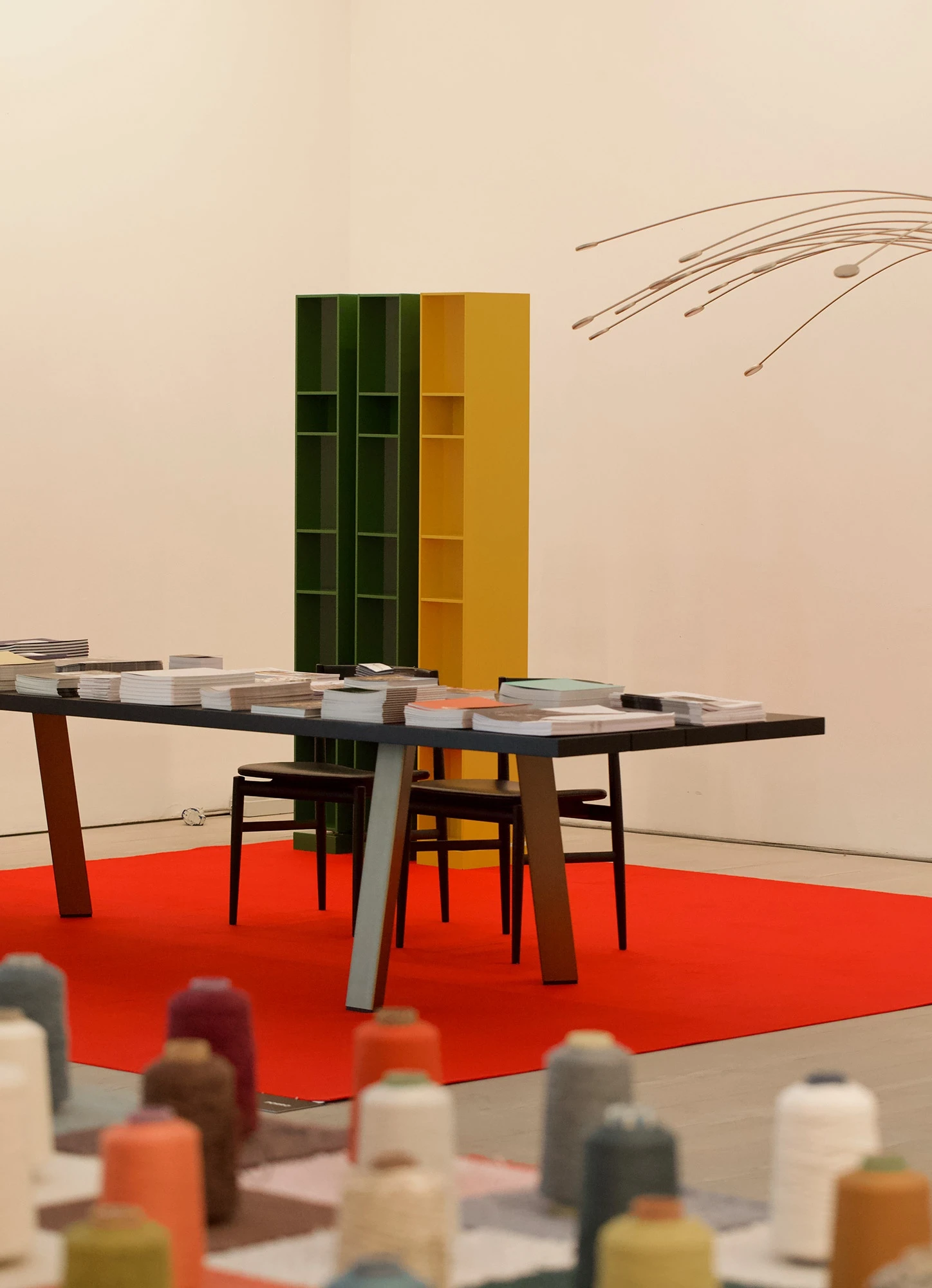 Nell’info point, omaggia la naturalezza dei materiali e la bellezza dell’imperfezione il tavolo Ryoba con gambe in estruso di alluminio anodizzate effetto ottone e piano in legno di ciliegio europeo tinto nero. Le gambe a sezione triangolare dallo spessore importante creano un cavalletto su cui è appoggiato il top materico, 3 tavole in massello leggermente diverse una dall’altra, semplicemente assemblate a secco con una sottile fuga. Le proporzioni francescane del tavolo, strette e lunghe per rispettare la grandezza naturale dei tronchi, invitano ad una nuova intima convivialità, mentre le spaccature lasciate a vista e i nodi tassellati sottolineano la poesia di questo bellissimo legno della tradizione, che prende nuova vita e diventa contemporaneo. Immancabile, la sedia Neve in frassino tinto nero dalle linee rigorose ma morbide, un tracciato di linee nette dai diversi spessori, addolcito dalla rotondità delle gambe a fuso e dalla tenue curvatura dello schienale e della seduta sospesa. Fungono da pratici contenitori le librerie verticali Sidewall in verde spring, verde muschio e giallo zolfo, solo alcune delle brillanti laccature della palette colori Porro, tra cui scegliere per ottenere il proprio mood preferito.