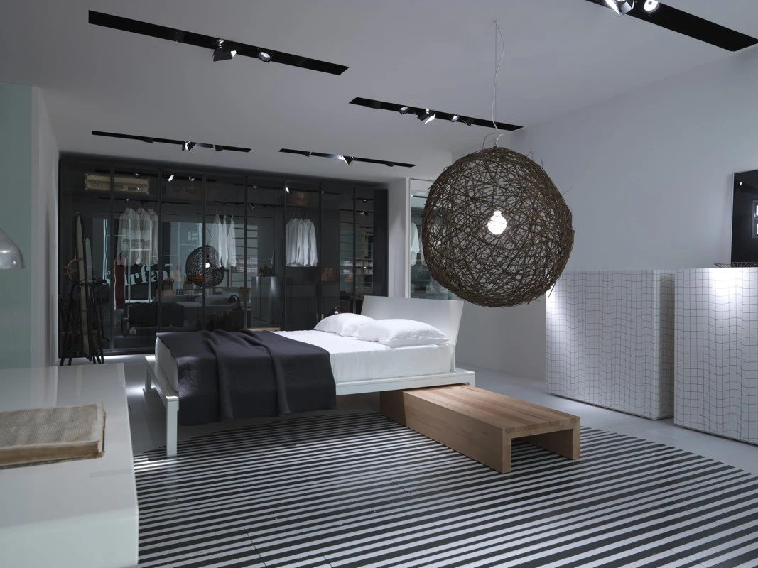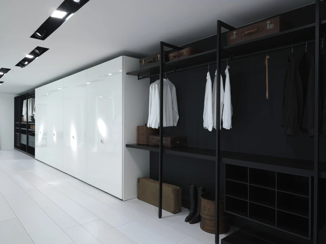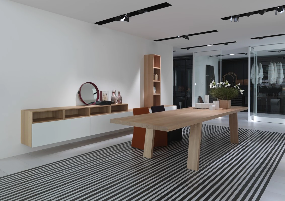 Legni naturali, metalli colorati, decori in bianco e nero, contrasti lucido/opaco: note diverse si inseguono con libertà negli spazi Porro, per poi ricomporsi in una partitura armonica.