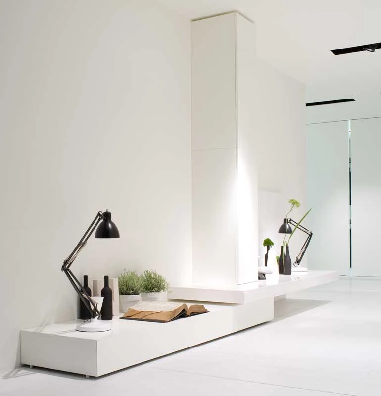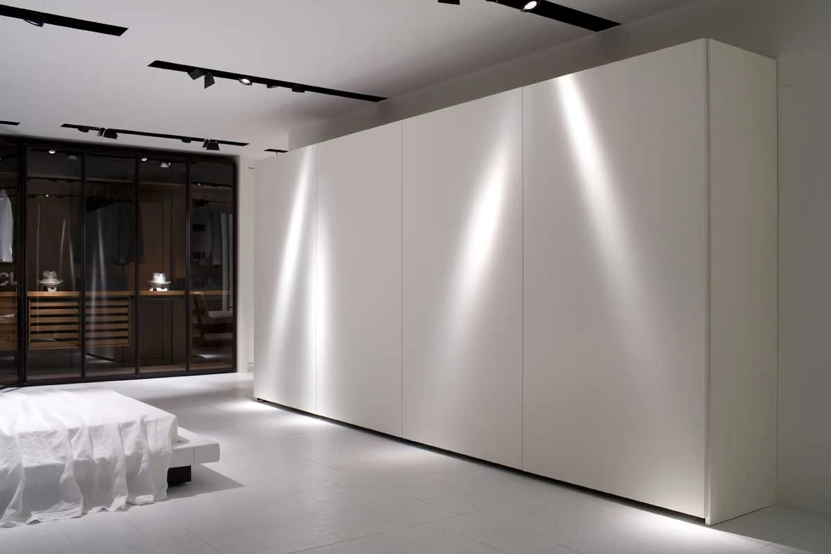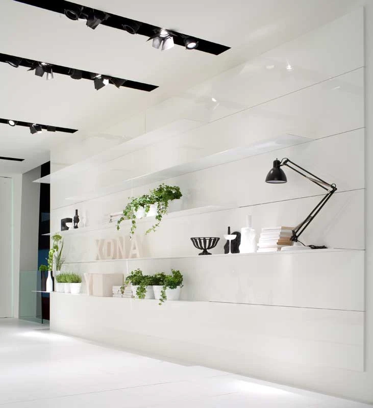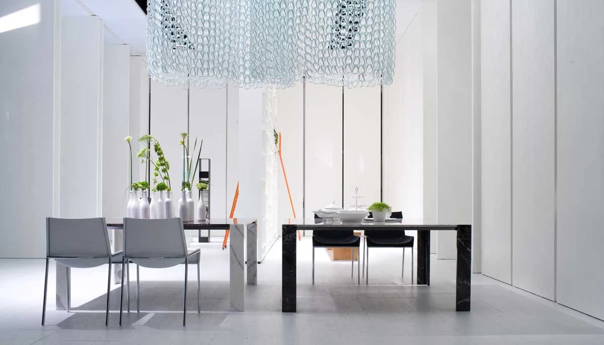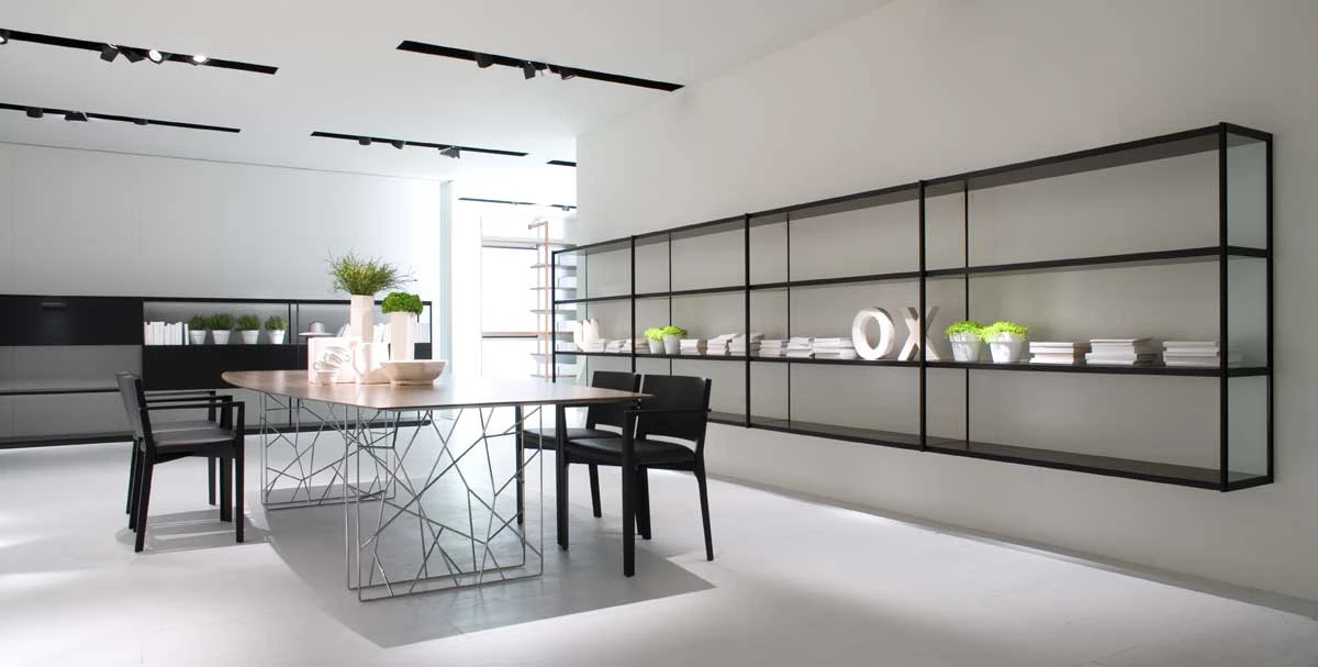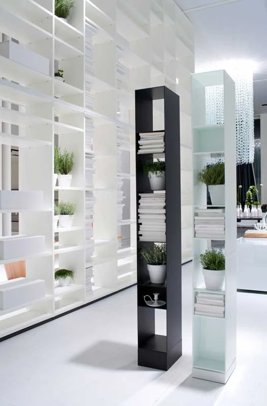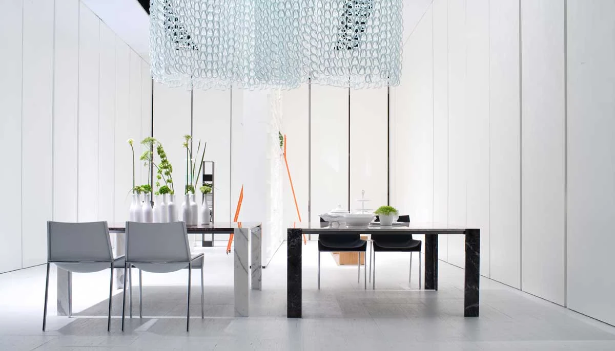Se la cromia decisa della laccatura domina nelle partizioni in movimento Pivot e nelle nuove composizioni per la zona living dei sistemi Modern e System NXT, le tenui sfumature del legno in essenza Hemlock arricchiscono la semplicità del segno della nuova panca Groove, mentre il vetro bianco colorato in pasta è utilizzato per la nuova libreria verticale Sidewall. Le screziature del marmo sono invece protagoniste del tavolo Yule, in contrapposizione alla morbidezza della pelle imbottita che riveste l’avvolgente seduta H.chair.