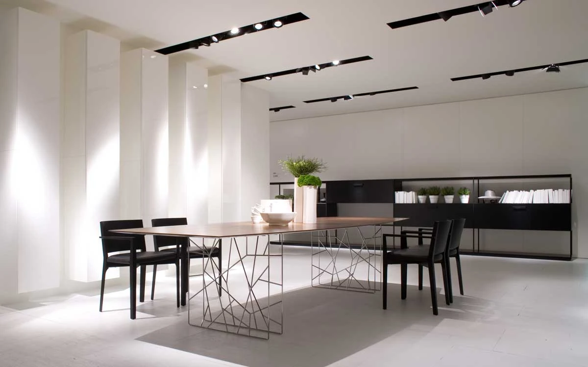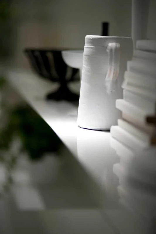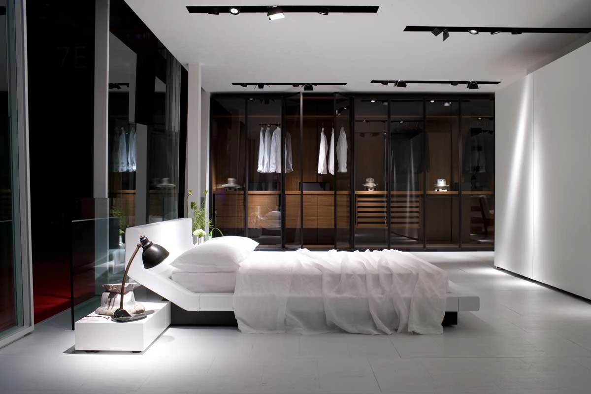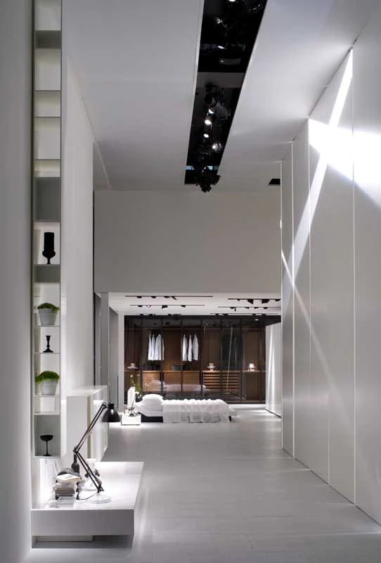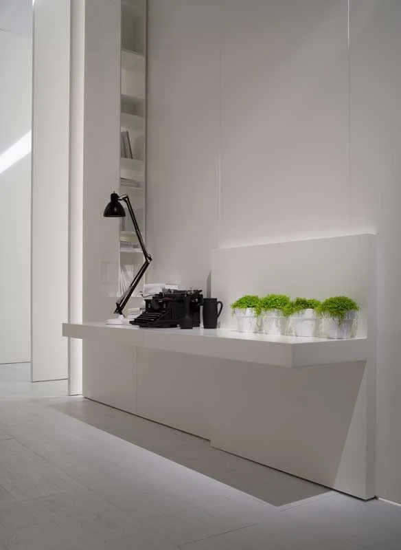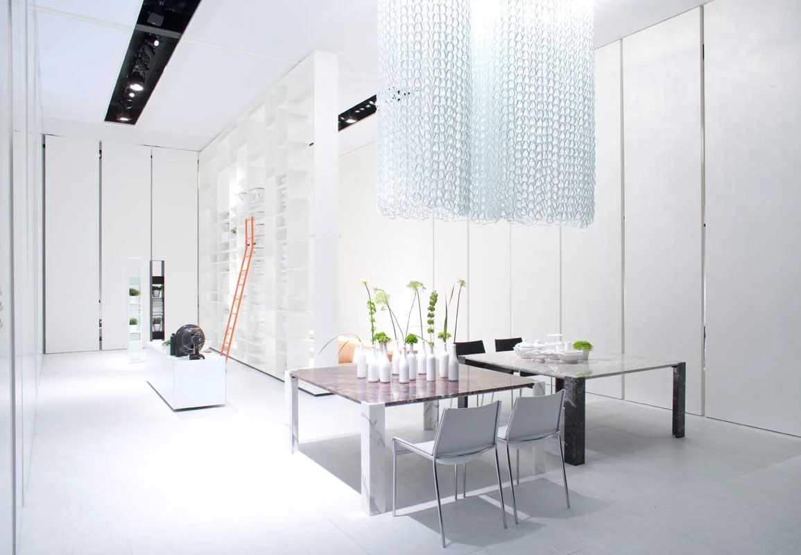L’effetto complessivo è quello di una costruzione di ghiaccio, giocata nei toni del bianco e delle trasparenze: una casa inavvicinabile e aristocratica, dove gli stessi elementi di arredo superano la loro connotazione di semplici oggetti trasformandosi in piccole architetture, all’insegna del candore e del dinamismo.