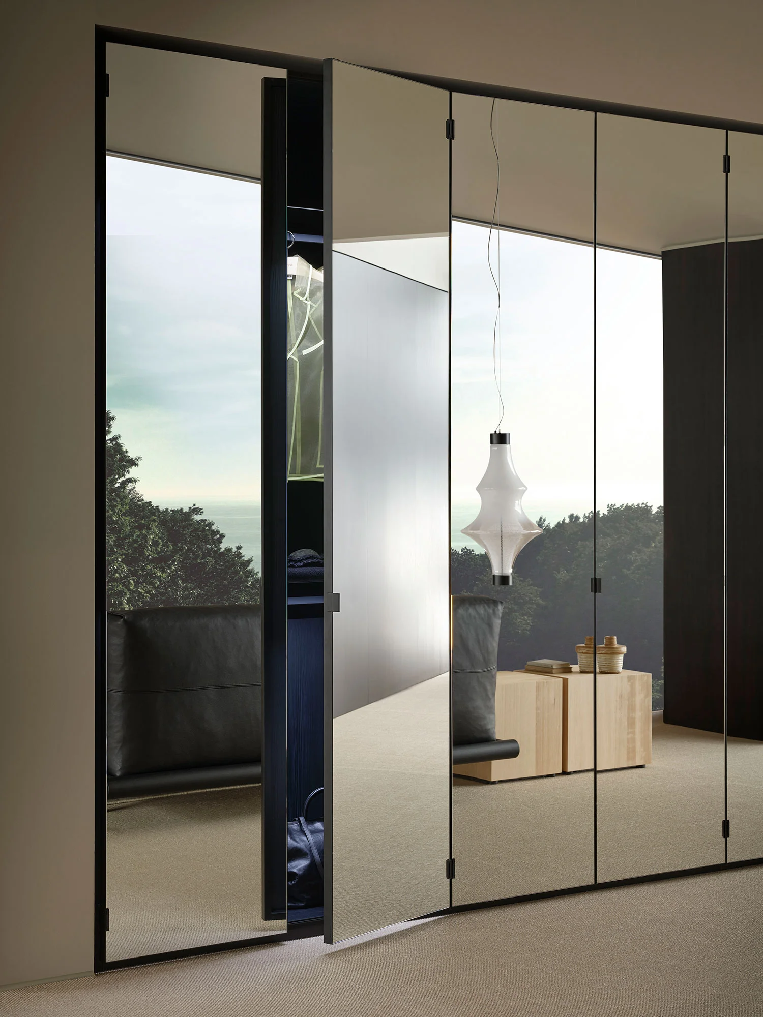 La cornice sottilissima dell’anta garantisce un’estetica minimal mentre la cerniera disegnata da Porro permette una pratica apertura a 180 gradi. Una soluzione adatta sia ad un utilizzo singolo per aggiungere uno specchio in un armadio tutto chiuso, sia alla creazione di grandi aree guardaroba tecno-glam, dai bagliori lucenti. Il retro dell’anta è in melamminico, come la struttura dell’armadio.