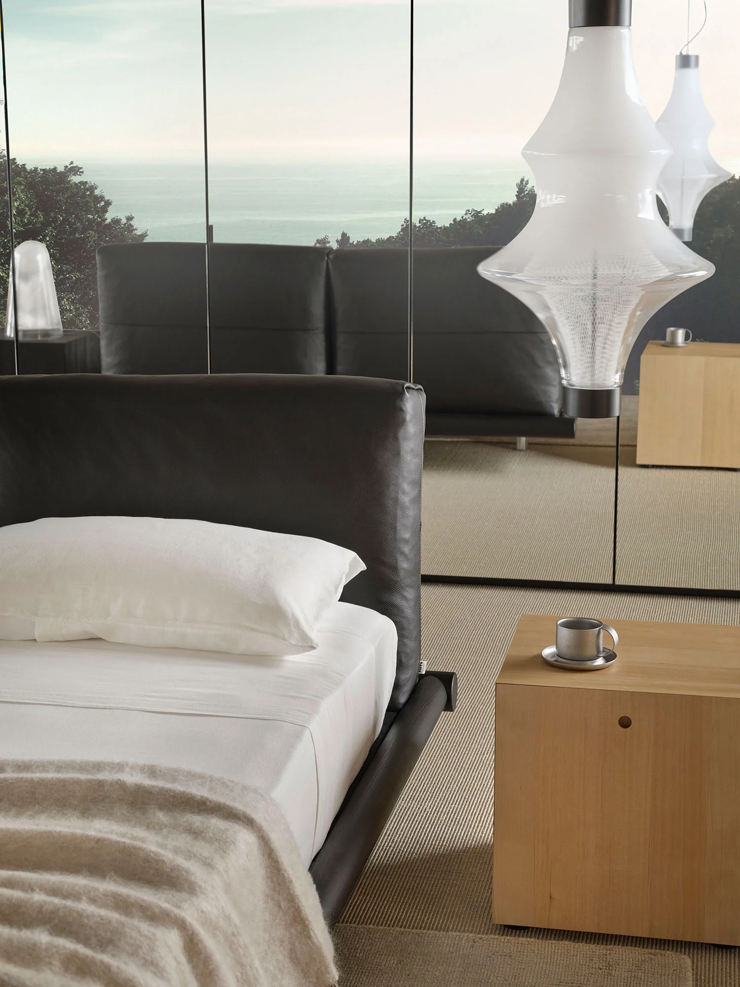 L’armadio Storage con anta Block in specchio, capace di creare una superficie riflettente che aggiunge profondità visiva all’ambiente, è abbinato alla delicatezza degli incastri in massello del letto Iro.