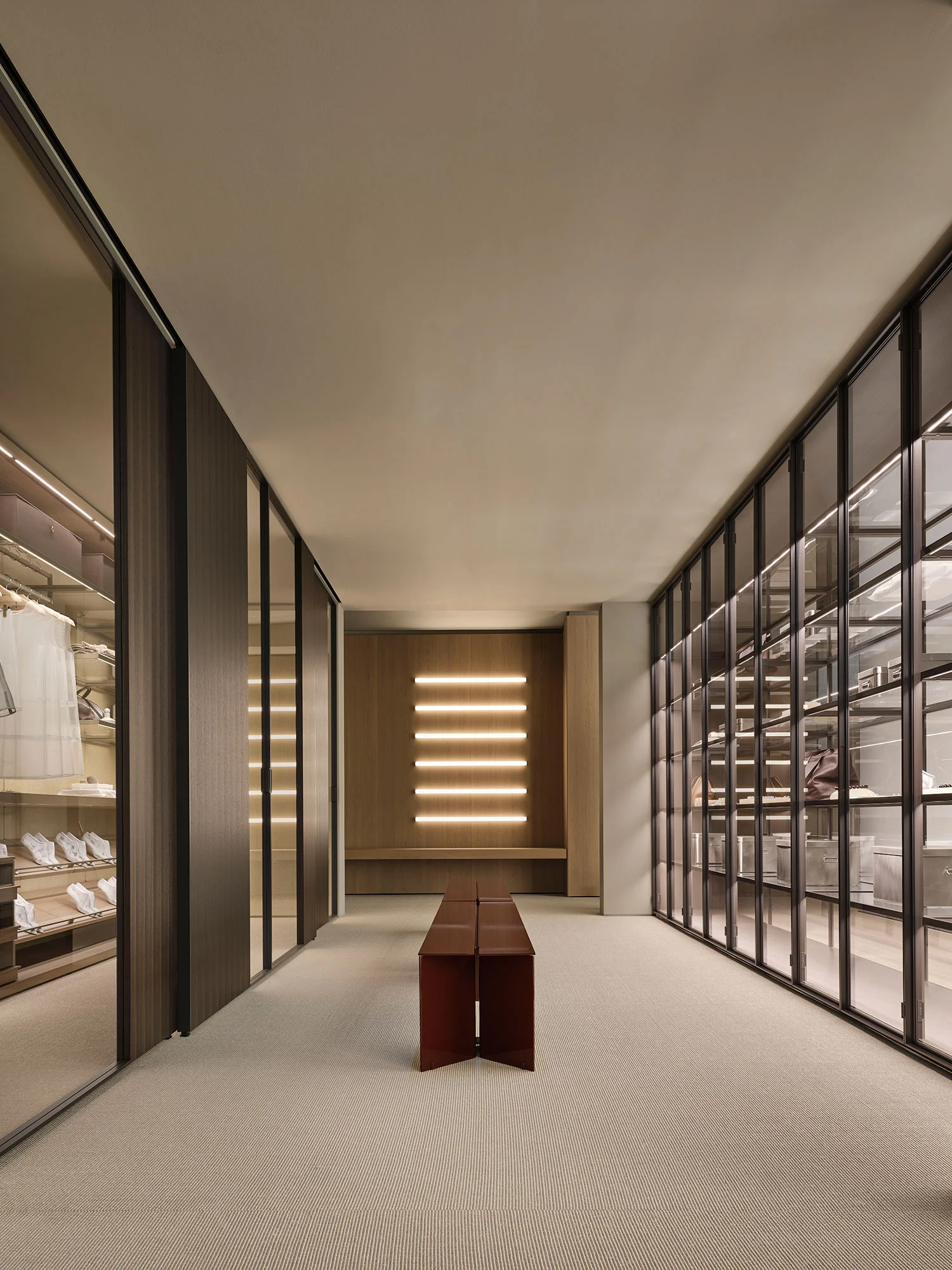 La grande Dressing Room Storage, design Piero Lissoni + CRS Porro, contenuta tra partizioni Layer a specchio o rivestite nel nuovo legno tide wood, è accessibile attraverso partizioni scorrevoli Glide Miru, con telaio moka e cristallo trasparente.