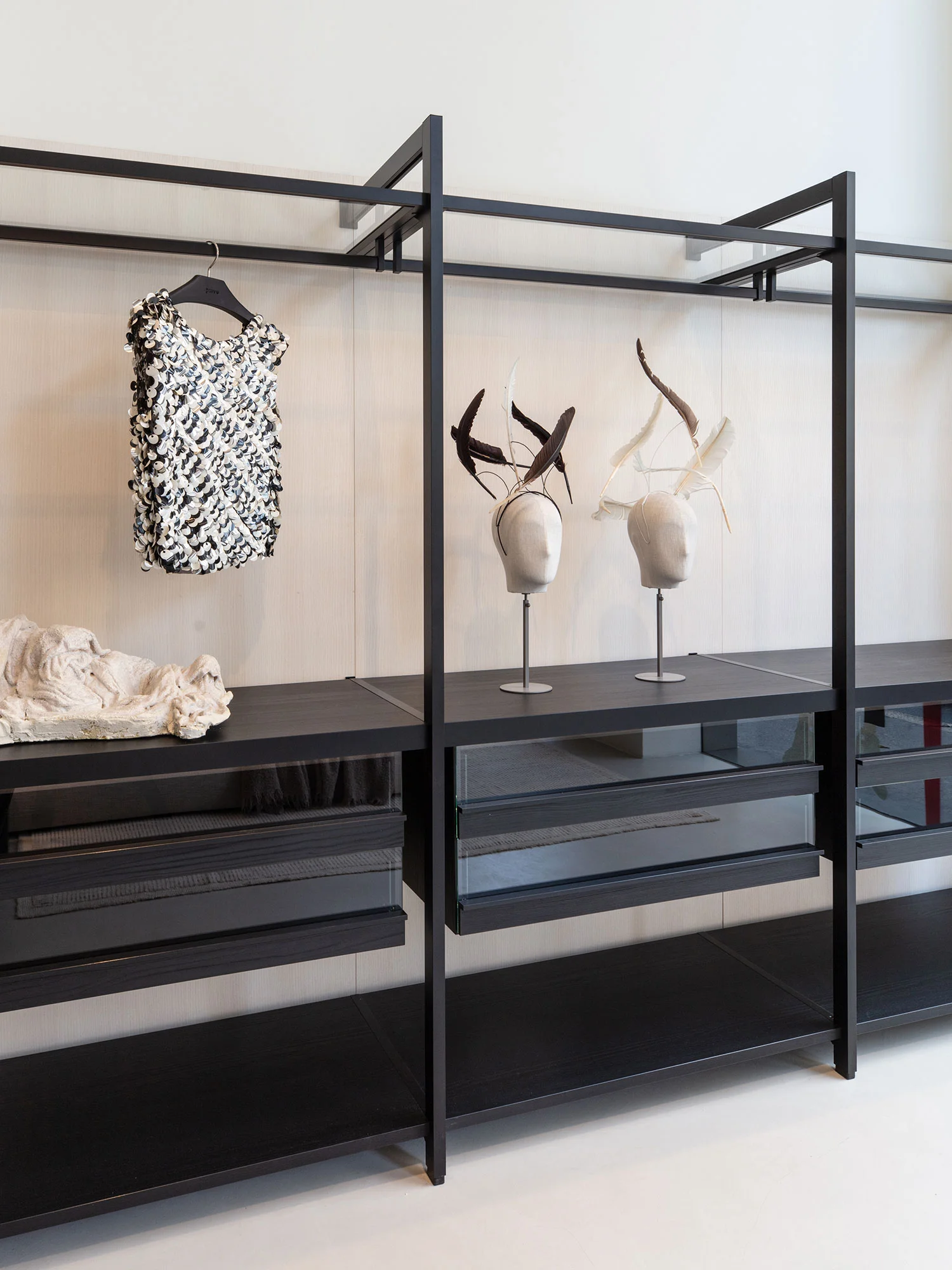 Composizione con 3 cassettiere in melamminico black sugi, ripiani luminosi in cristallo trasparente e aste appendiabiti.